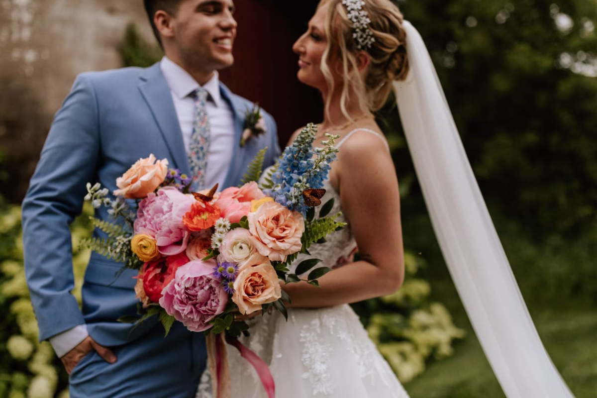 Finished with a simple ribbon, the bouquet is designed in a free-spirited, organic style with asymmetry, showcasing the natural flow of the blooms. We can’t blame the butterflies for crashing the wedding photos!