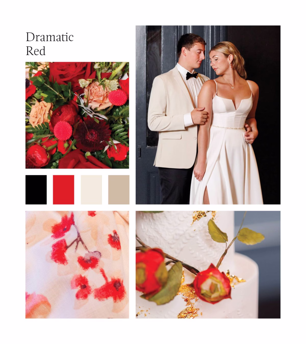 Bold and retro-obsessed couples may just love this kitschy palette of bright reds and playful pinks perfect for a statement-making celebration. Click here for more inspo embracing this sassy style.