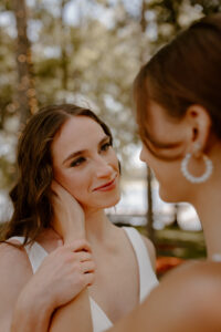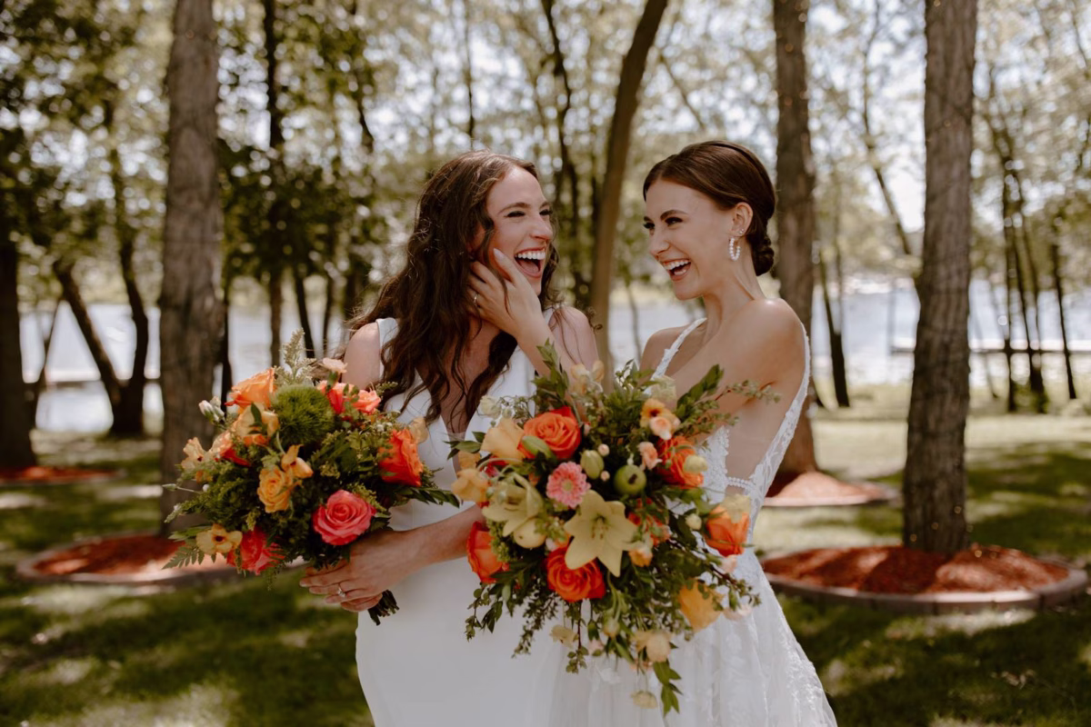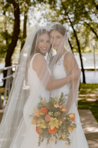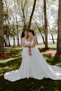 Both brides were radiant in their Brides N’ Belles gowns, expertly selected to reflect their distinct personalities and styles. While both gowns featured straps and a striking plunging v-neckline, one displayed a romantic, lacey A-line gown, while the other showcased a more minimalist, sleek fit and flare silhouette.