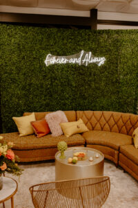 Resource Vintage Rentals’ unique rental items enhanced every aspect of this vibrant, multicolored event. Their contributions spanned from the lively reception setting to the captivating champagne tower display and the inviting lounge seating area. Whether it was the grandeur of their Green Hugh Bench and June Curved Sofa or their delicate vintage plates, green goblets, gold flatware, and myriad other details, each element significantly contributed to the impactful wedding design, regardless of its size.