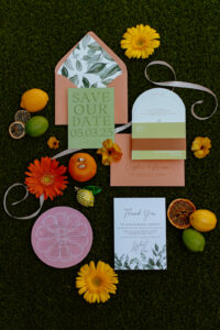 From a rounded, layered invitation suite to grapefruit-inspired menus, mandarin orange place card tags, and beyond, Express Printing set this citrusy celebration’s vibrant and fruity tone with stunning and unique stationery pieces.