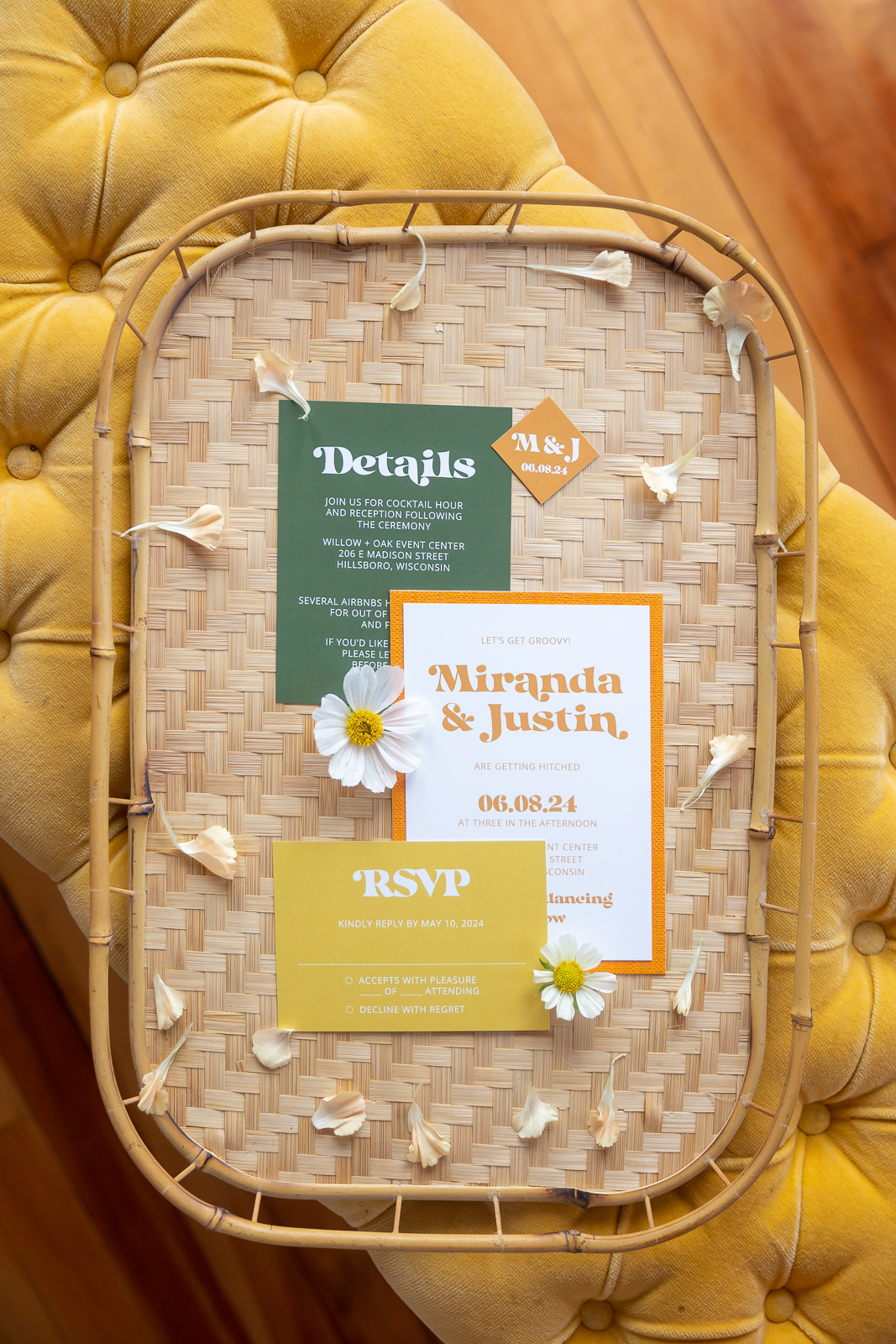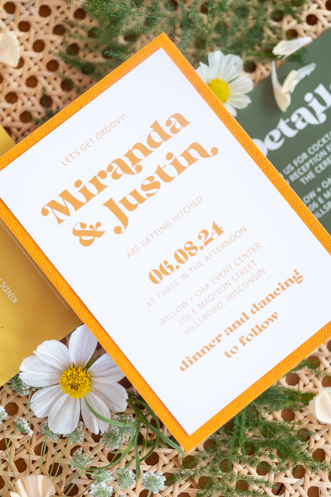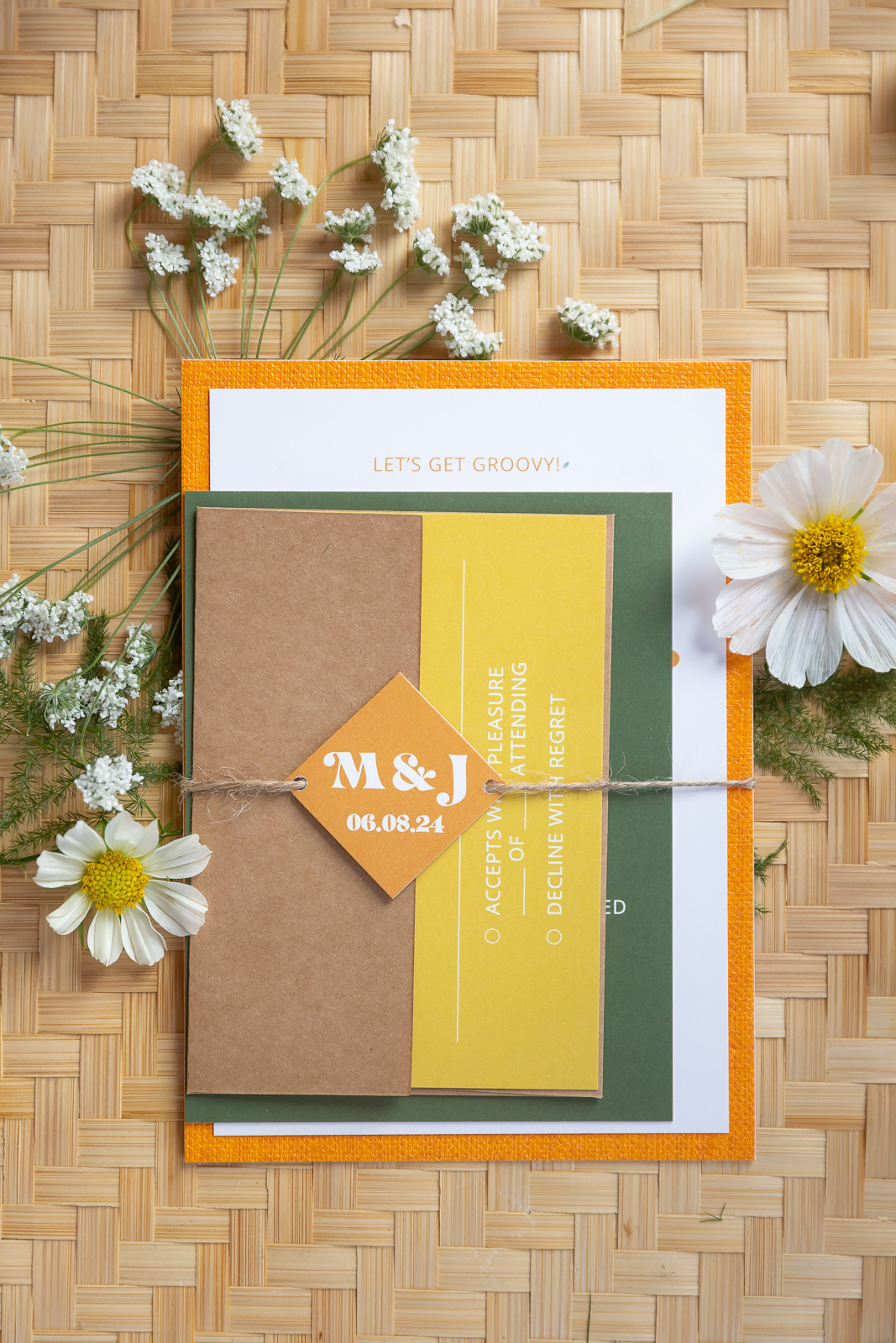 A delightful invitation suite from BP Creationery featured a bright yellow, orange, and green color palette. A retro serif font and unique incorporation of ’70s-style wallpaper further infused authenticity and texture into their design!
