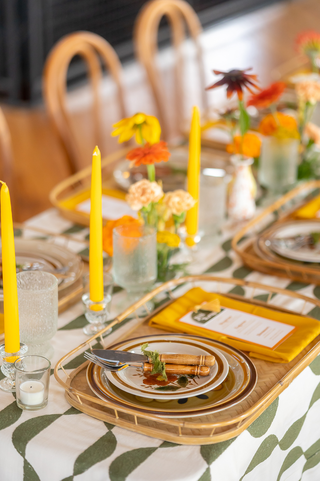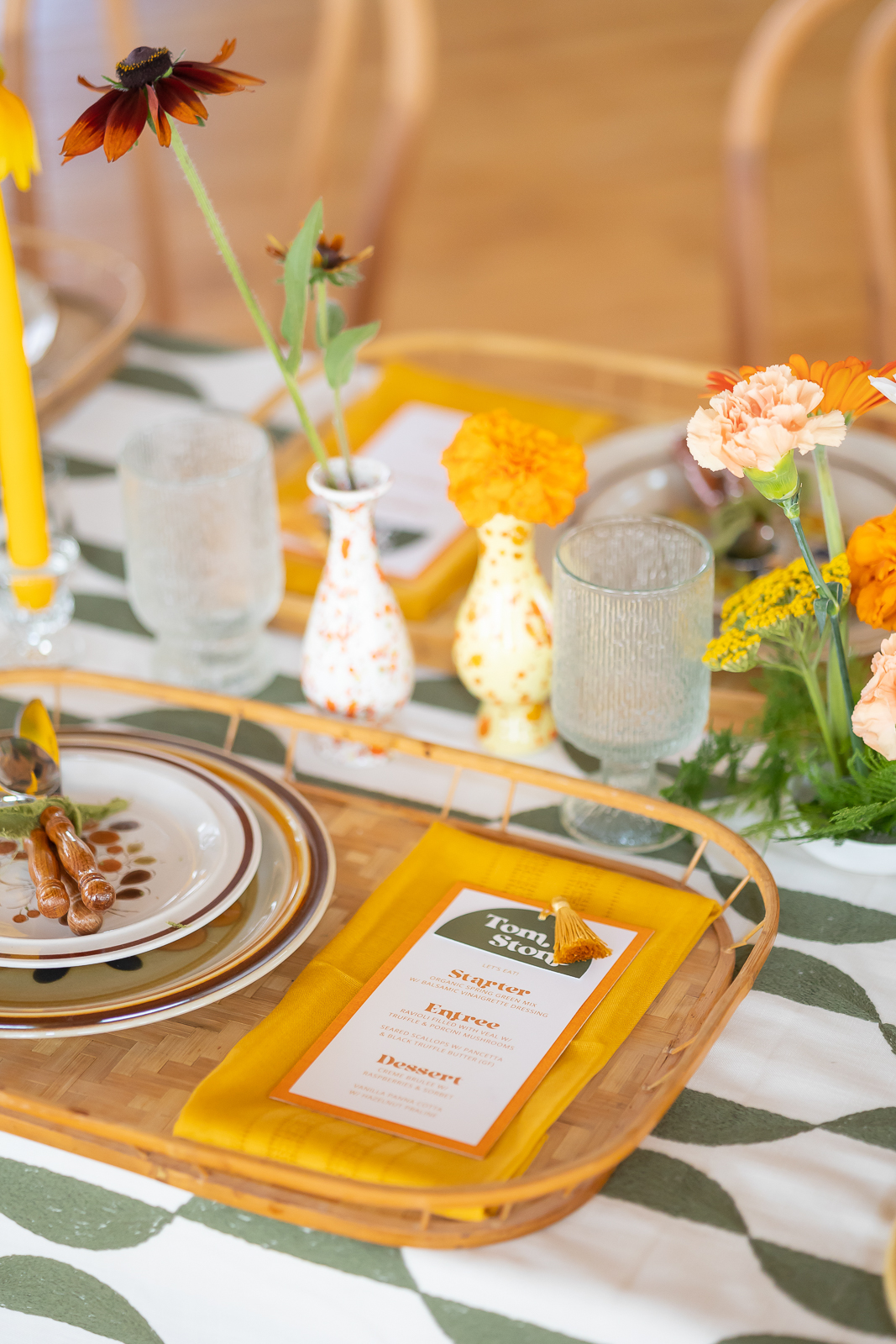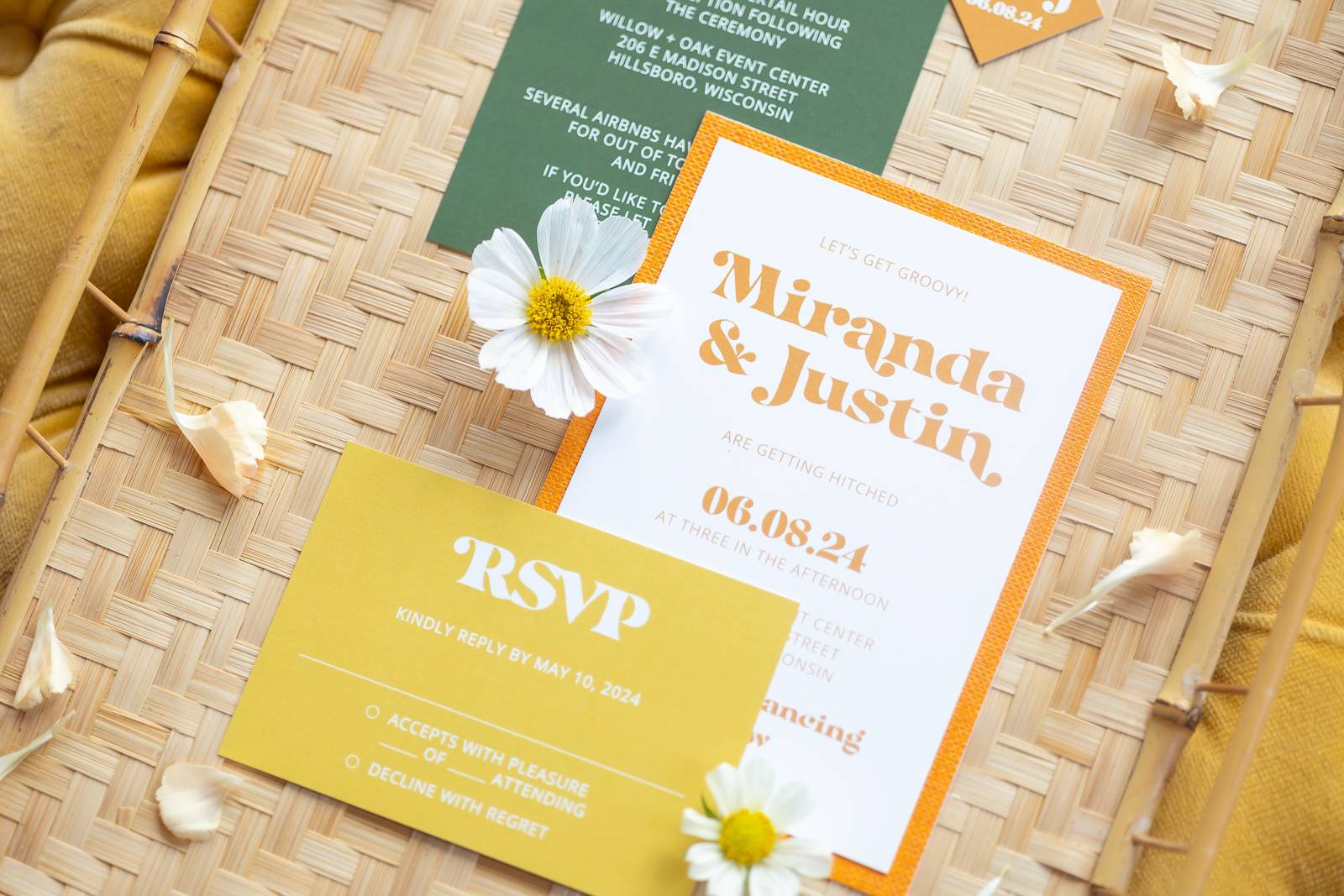 A delightful invitation suite from BP Creationery featured a bright yellow, orange, and green color palette. A retro serif font and unique incorporation of ’70s-style wallpaper further infused authenticity and texture into their design!