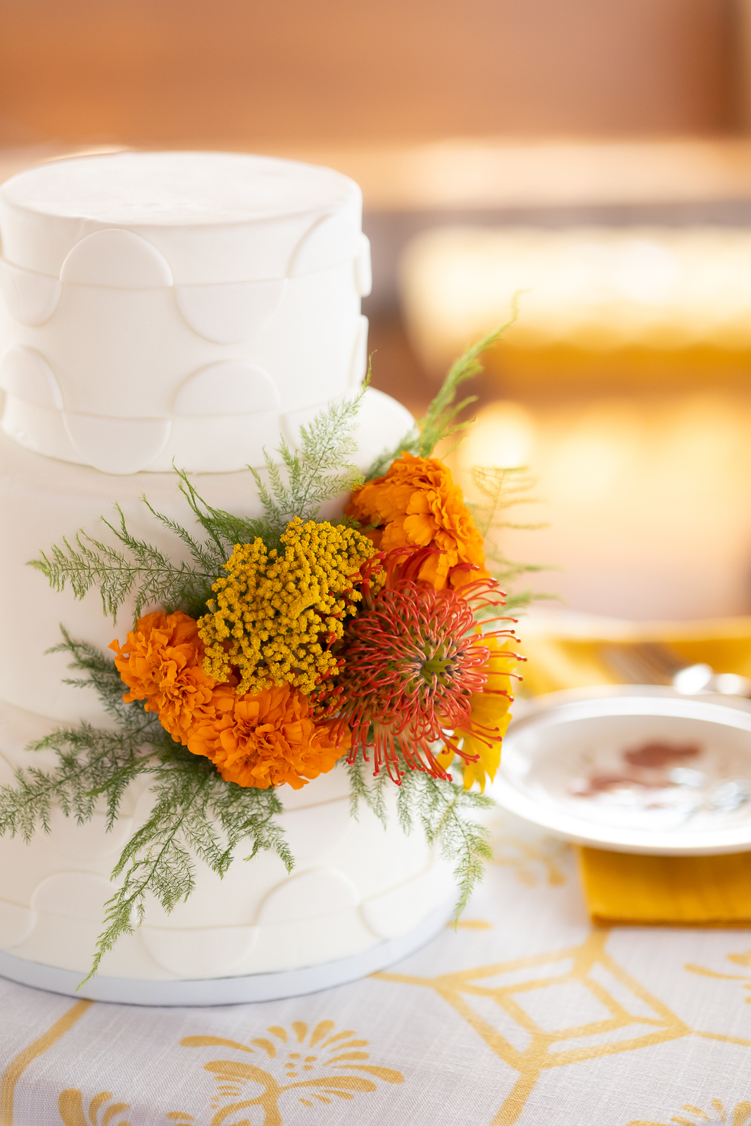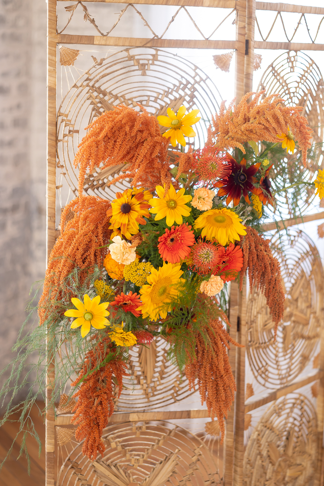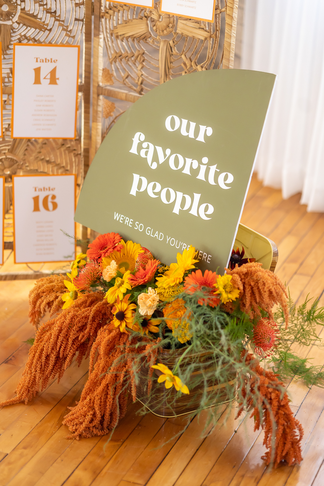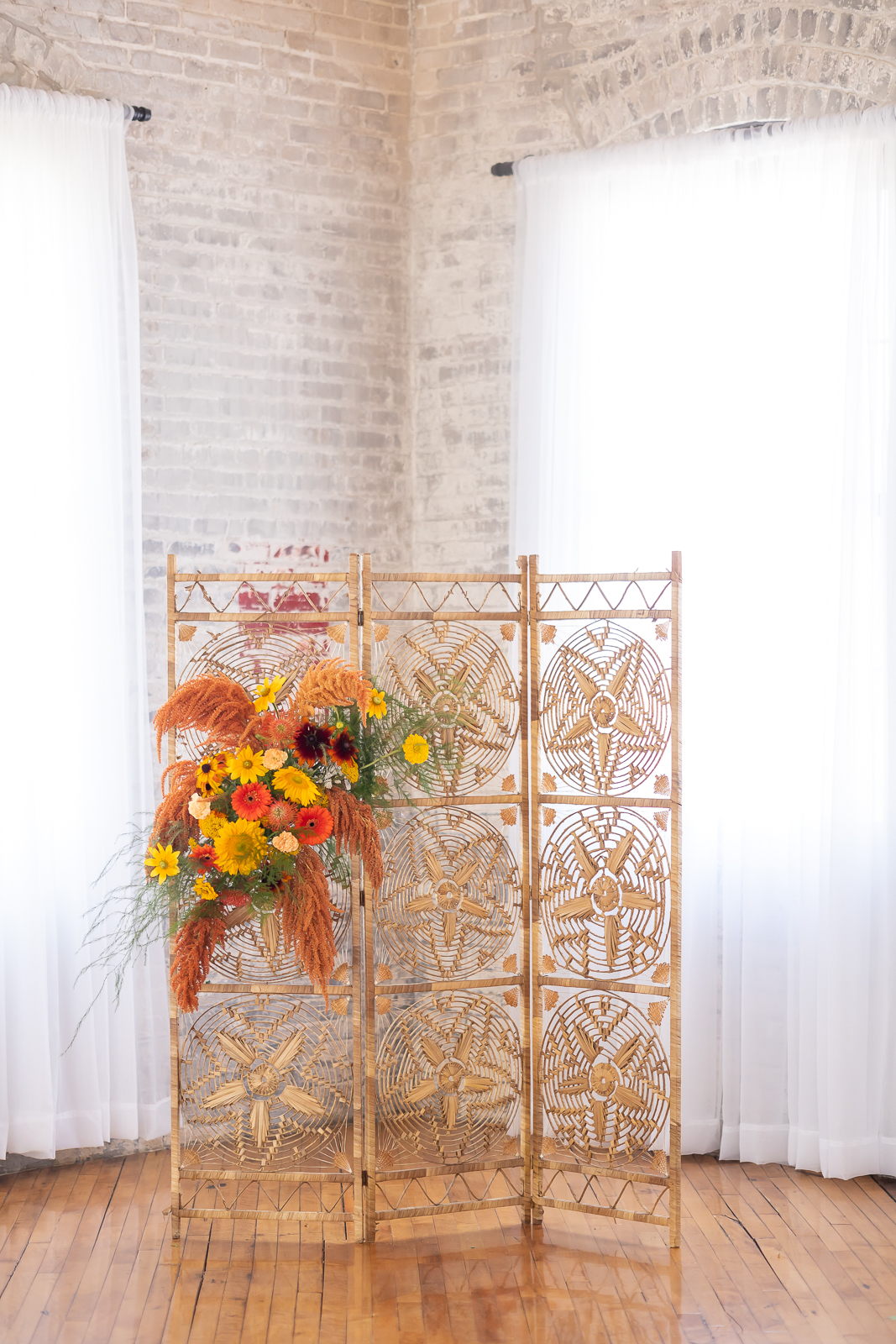Skies the Limit Events brought an elevated bohemian style and all the ’70s-inspired vibes to life in this inspiring celebration at Willow + Oak. They artfully arranged vivid blooms in warm, vibrant hues that evoked a lively, free-spirited feel to the space and painted the neutral venue with color.