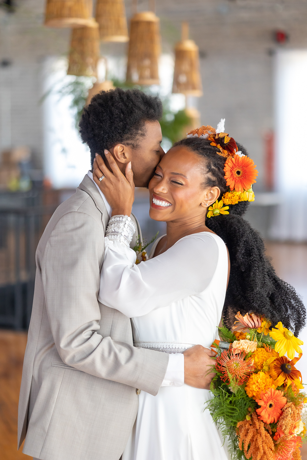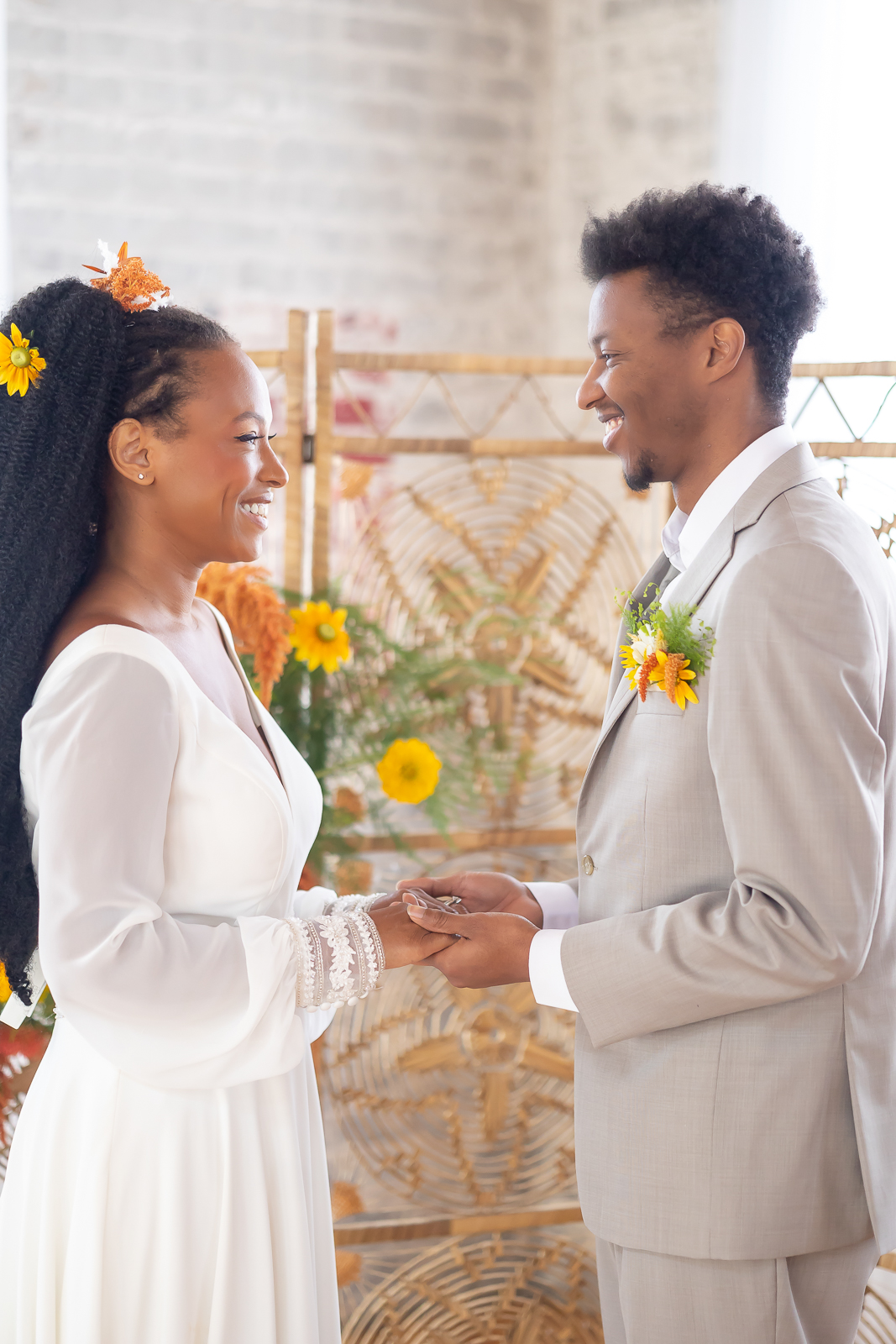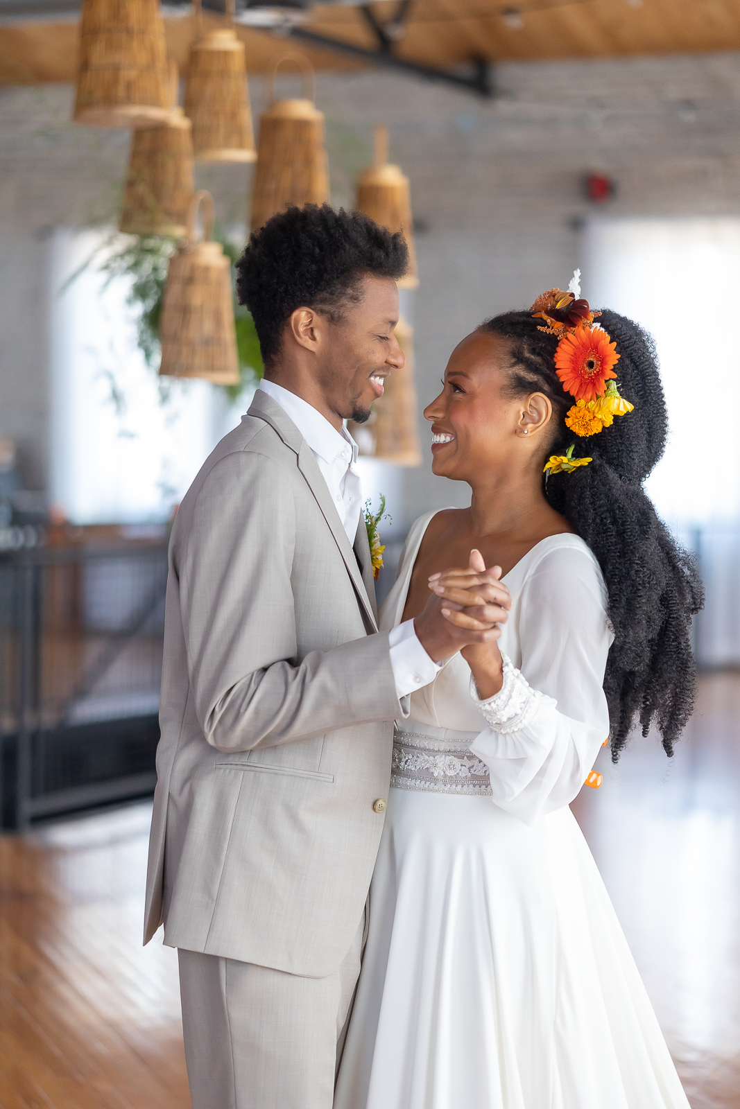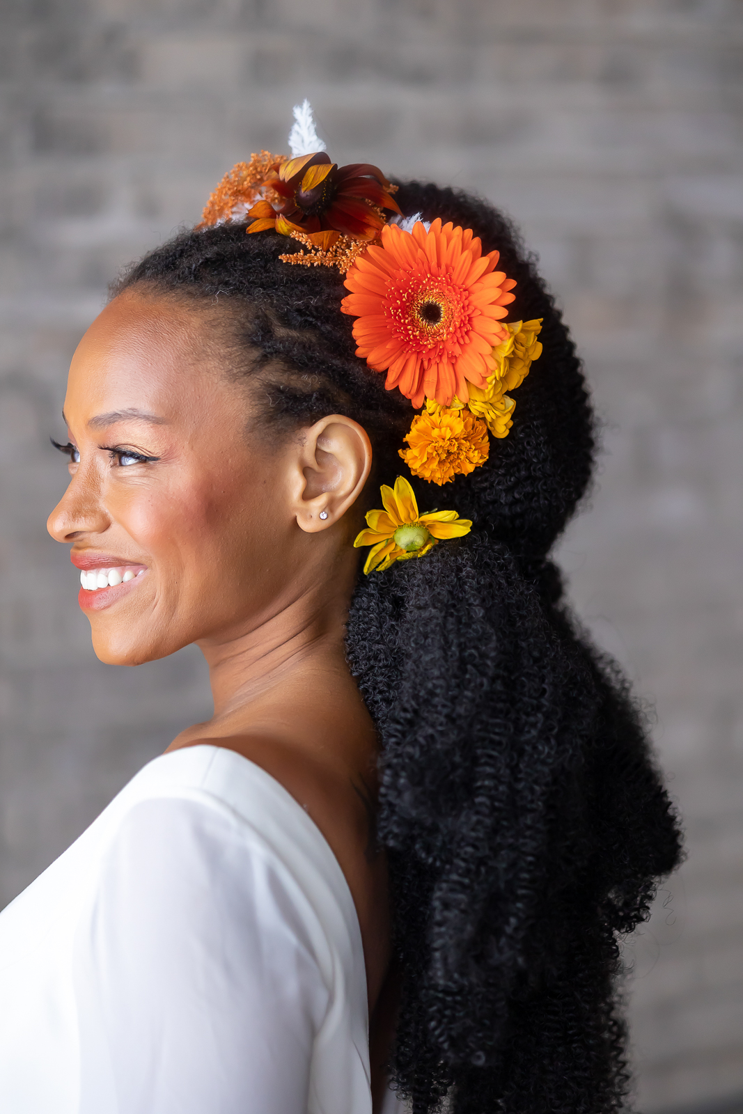 Melanin Beauty Bar brought the bride’s whole look together by crafting not one but two stunning hairstyles, both adorned with flowers that matched the floral theme of the celebration. They designed a glowing, golden makeup look for our bride to enhance her natural beauty while adding a touch of enchantment to her wedding day look.