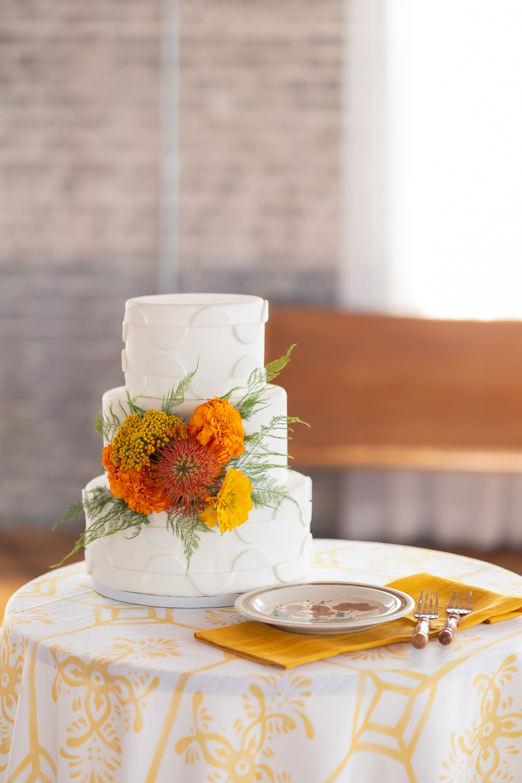 Mirroring the half-circle-patterned linens found on the reception table, a cake from Southern Aprons was a simple yet impactful display that matched all th