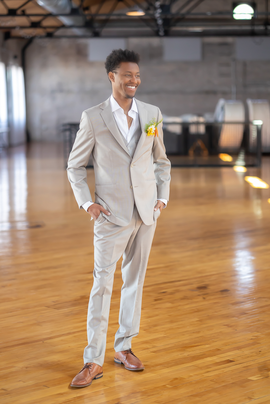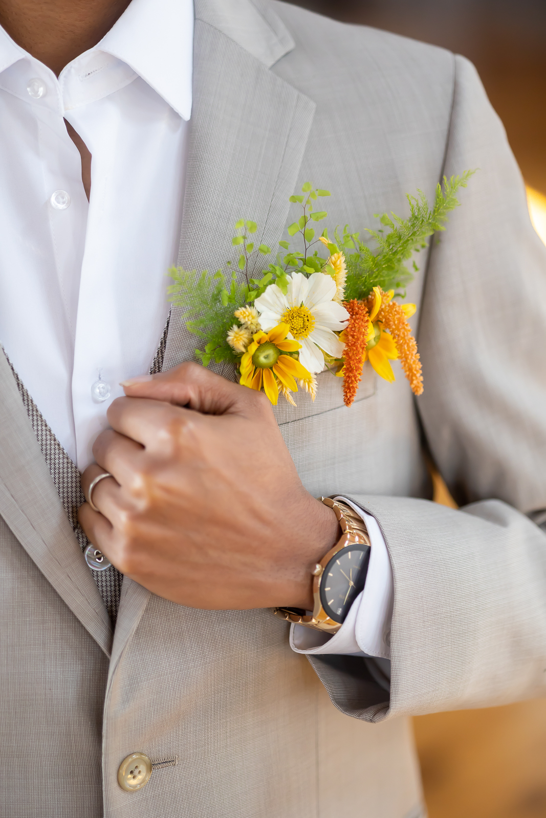 Our bride looked stunning in her gown from Brides N’ Belles! With its elegant long sleeves and a plunging V-neck, the dress gave a nod to the past while remaining contemporary chic. The groom’s greige suit and unbuttoned white shirt were classy, yet casual, and paired perfectly with a cheerful floral pocket boutonniere.