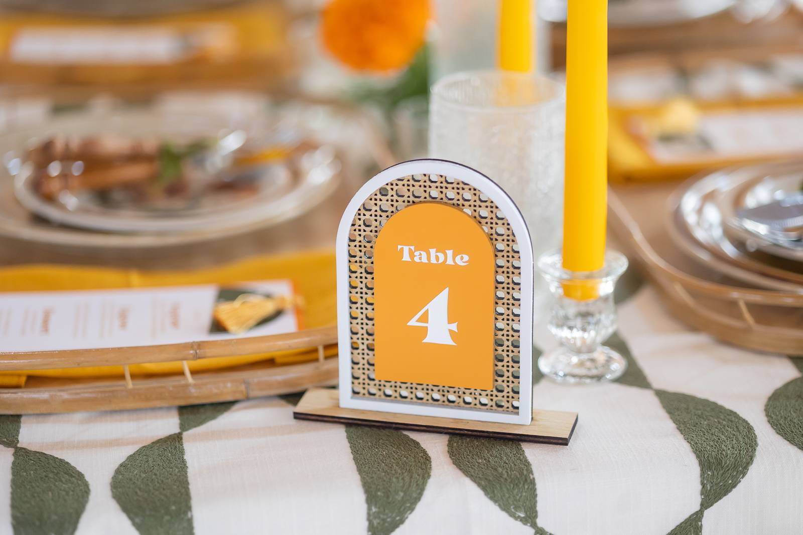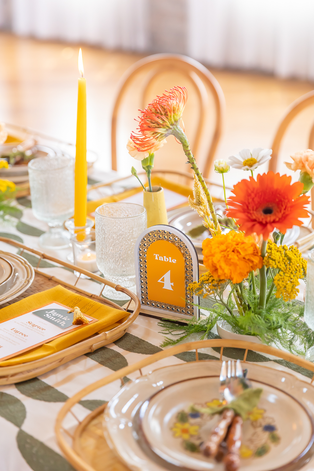 A showstopping reception tablescape was a true testament to the collaborative efforts of a talented vendor team. Natural bentwood chairs from Orange Door Weddings, funky ’70s-inspired patterned woven linens from BBJ La Tavola, curated vintage dishware and decor details from AliLou Events, custom arched rattan and acrylic table numbers from BP Creationery, and an eye-catching hanging installation arranged by Skies The Limit Events came together to beautifully display an eclectic, retro-inspired reception scene with a modern twist.