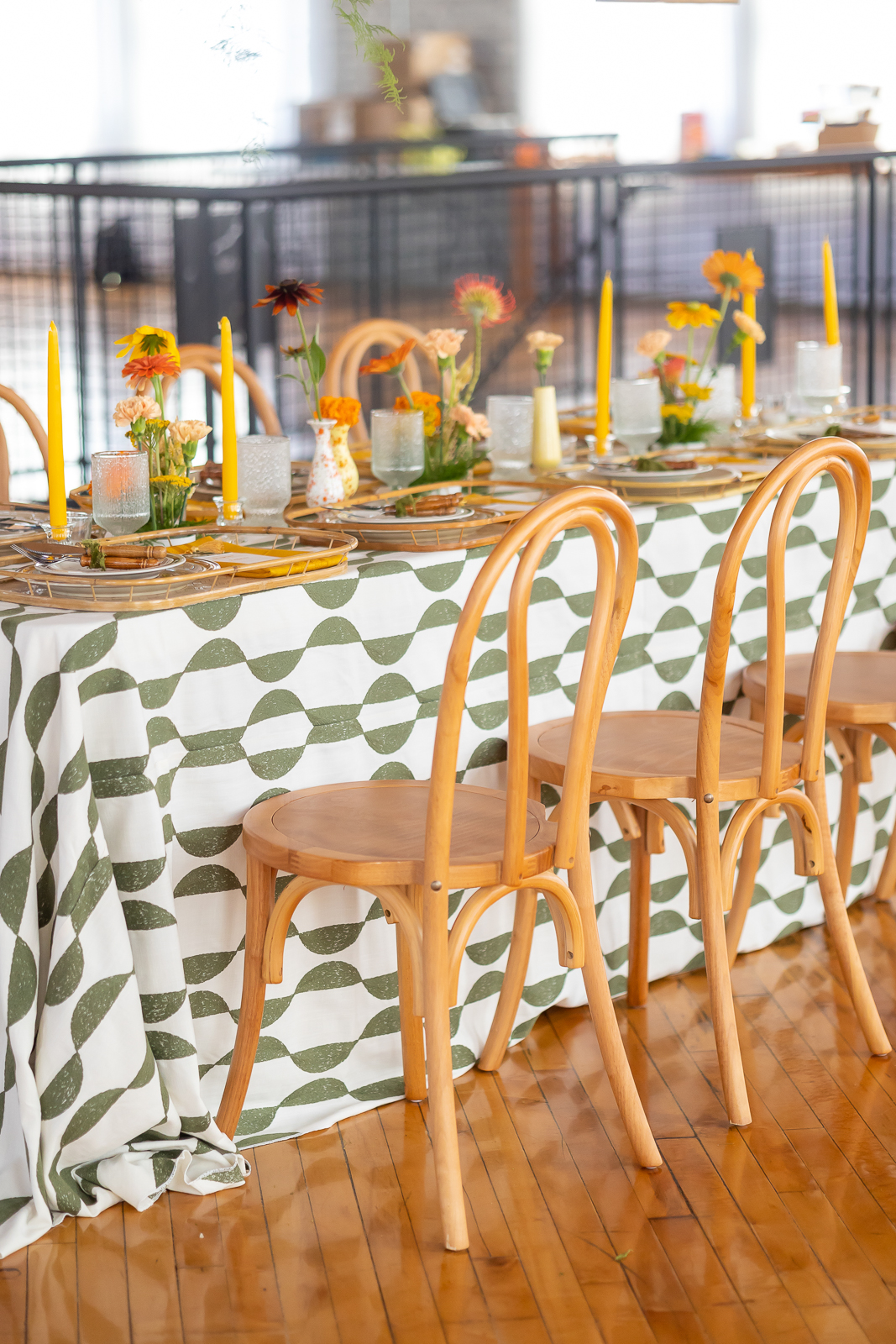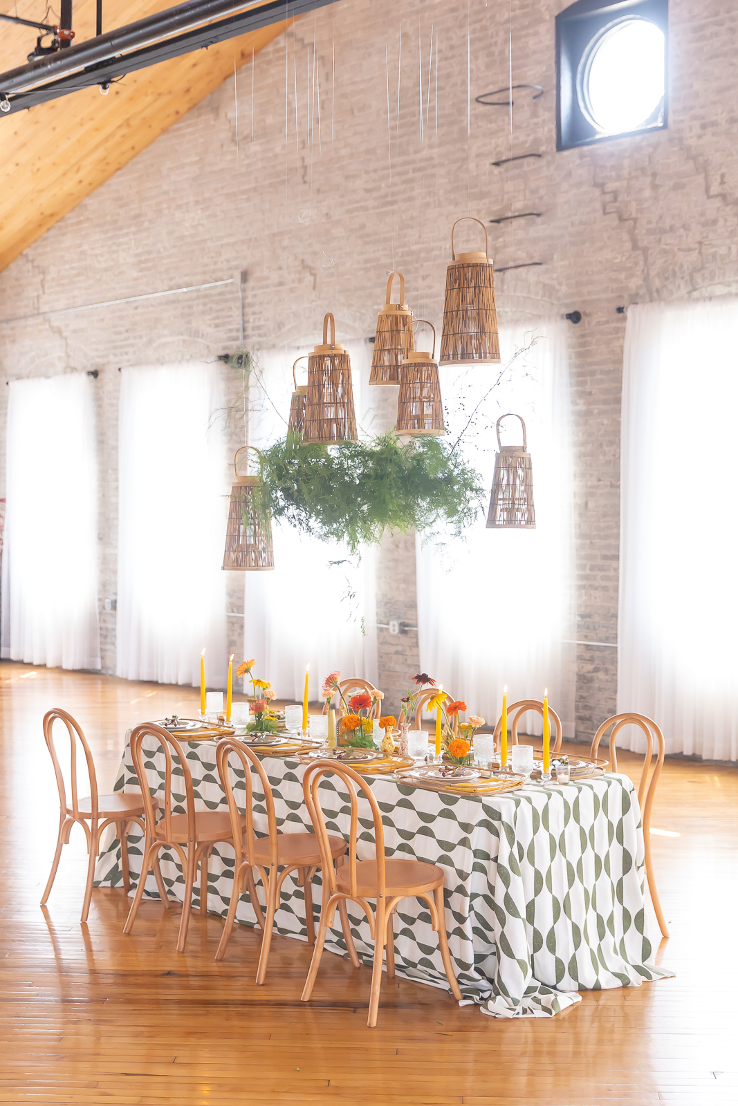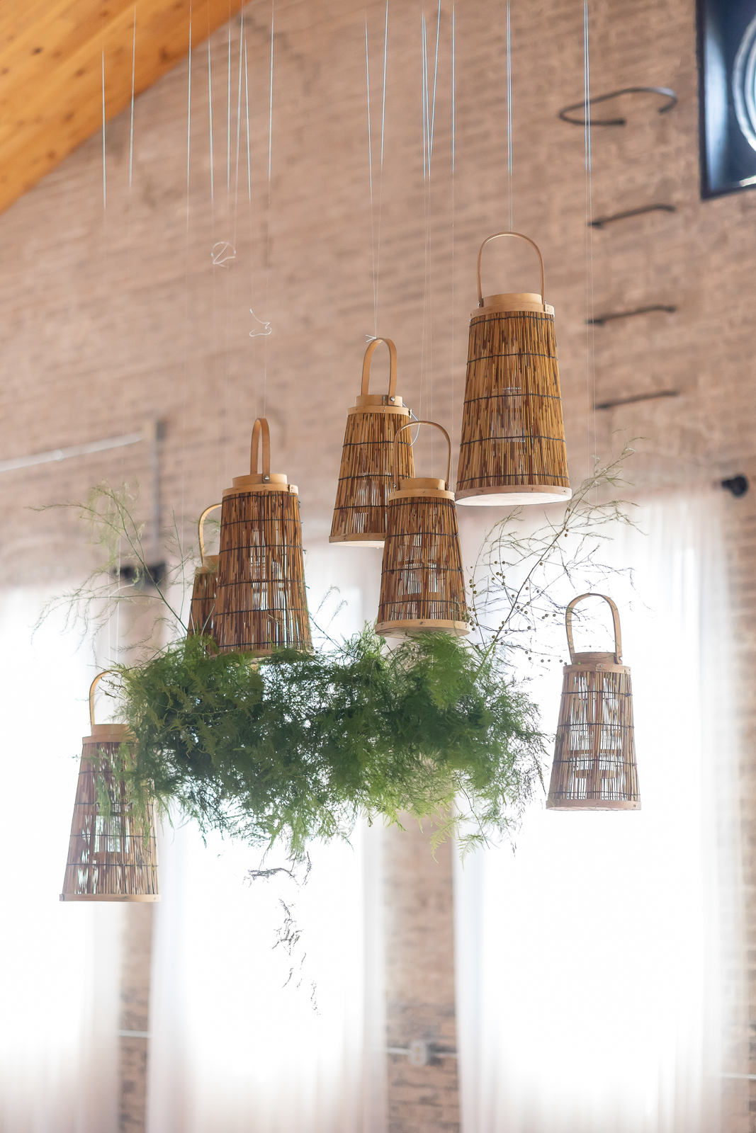 Bamboo lanterns and wispy greenery drew eyes and attention upwards pulling the entire tablescape together with a statement-making hanging installation. Willow + Oak’s industrial, light-filled venue set the perfect stage with its warm hardwood floors and whitewashed brick that complemented the orangey tones of all the ’70s-inspired wooden, wicker, rattan, and bamboo details used in this wedding design.