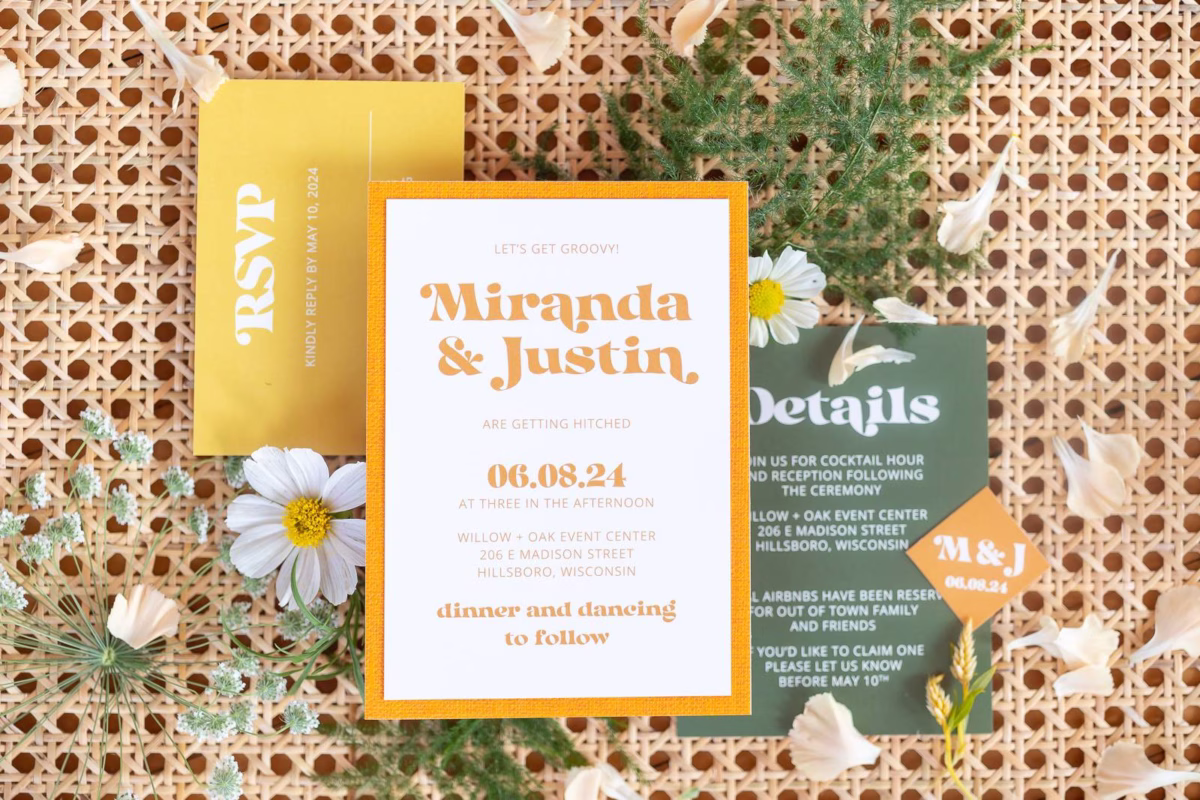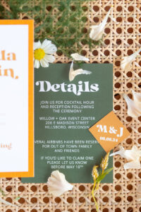 A delightful invitation suite from BP Creationery featured a bright yellow, orange, and green color palette. A retro serif font and unique incorporation of ’70s-style wallpaper further infused authenticity and texture into their design!