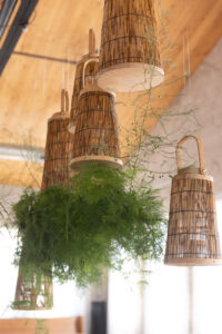 Bamboo lanterns and wispy greenery drew eyes and attention upwards pulling the entire tablescape together with a statement-making hanging installation. Willow + Oak’s industrial, light-filled venue set the perfect stage with its warm hardwood floors and whitewashed brick that complemented the orangey tones of all the ’70s-inspired wooden, wicker, rattan, and bamboo details used in this wedding design.