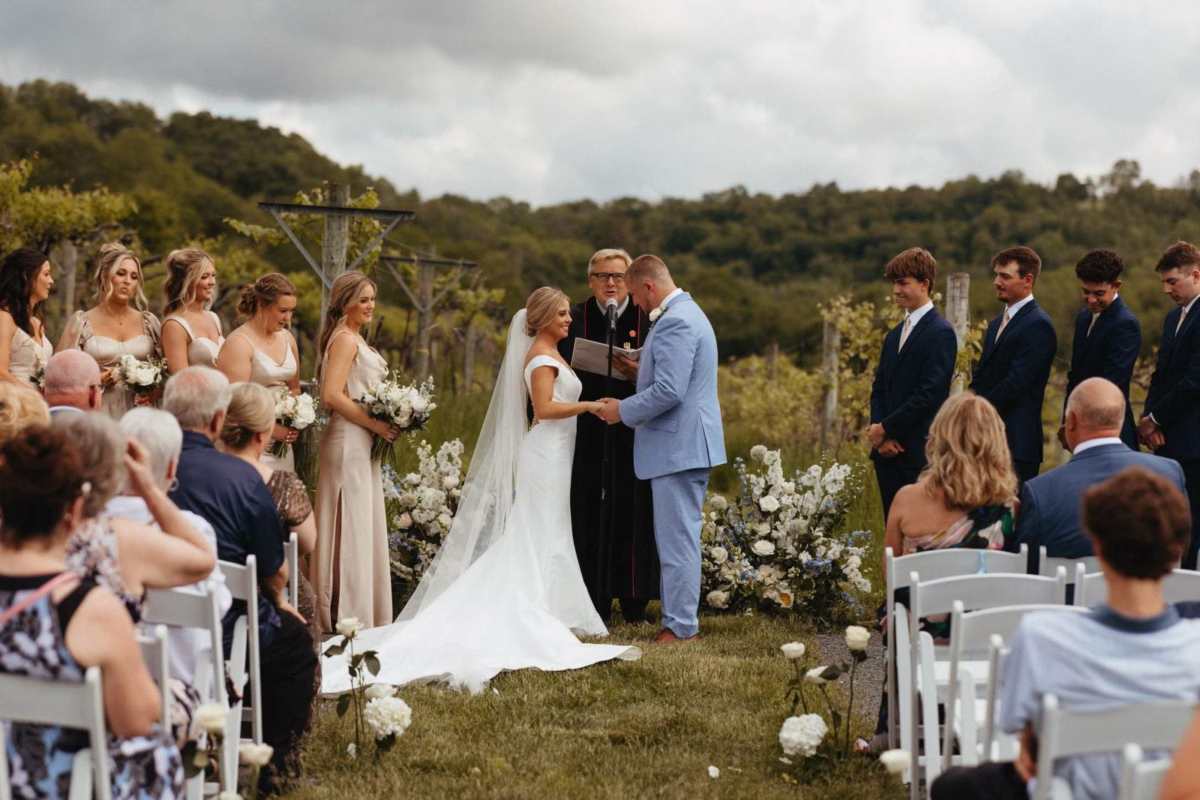 While there was some rain in the morning, the sun came out during the couple’s outdoor ceremony. Florals from Clementine Flowers lined the aisles, with larger floral pieces framing the vow exchange. Mackenzie walked down the aisle to “Cornfield Chase” by Hans Zimmer, from the movie Interstellar. They also incorporated quotes and references from the film into their vows as a personal touch.