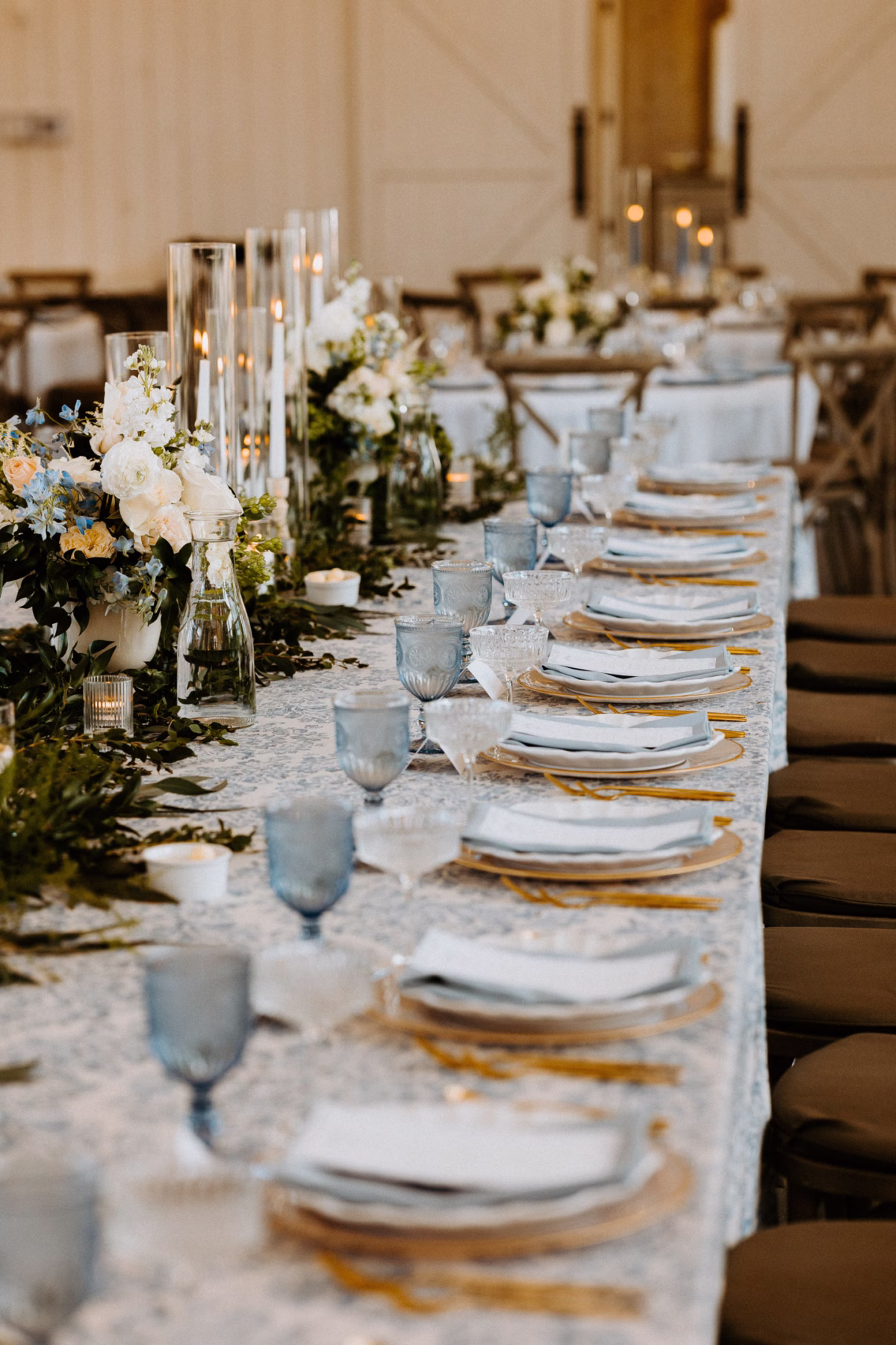 Willow Brook Farms had plenty of indoor and outdoor spaces for photography, mingling, and the reception inside the barn. The stunning barn features neutral white walls, vaulted ceilings, chandeliers, tall windows, and ample space for dancing. The beautiful head table was adorned with a blue and white patterned tablecloth, crystal glassware, a floral table runner, candles, blue linens, gold-rimmed plates, and gold silverware.