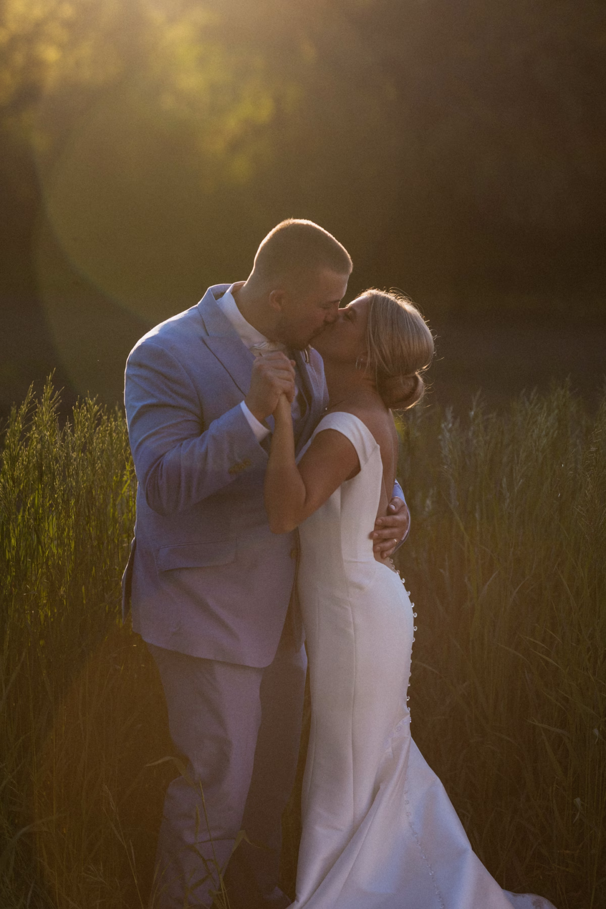 Tj wore a light blue, heathered suit from Men’s Wearhouse, with a matching vest, a white undershirt, a silky bowtie, and a floral boutonniere. The groomsmen wore navy suits with white undershirts and champagne-hued ties that coordinated with the bridesmaids’ dresses.