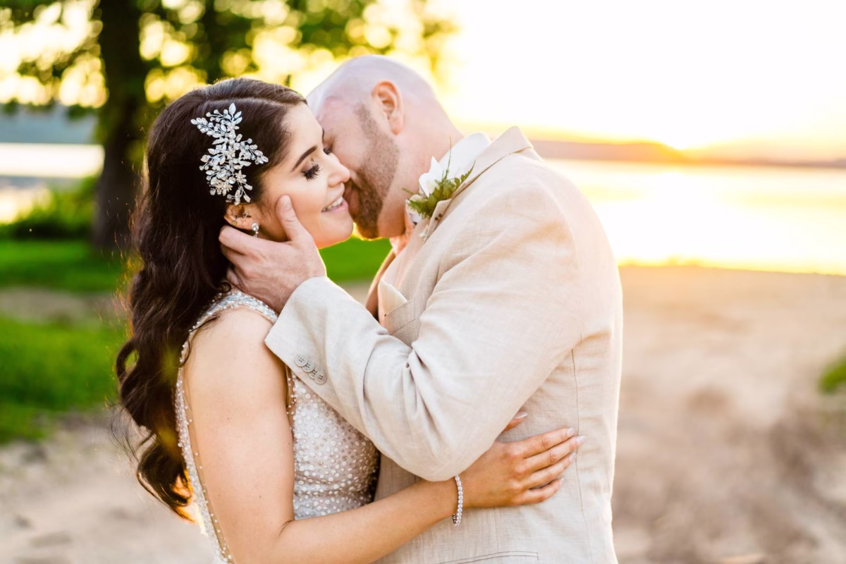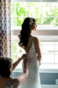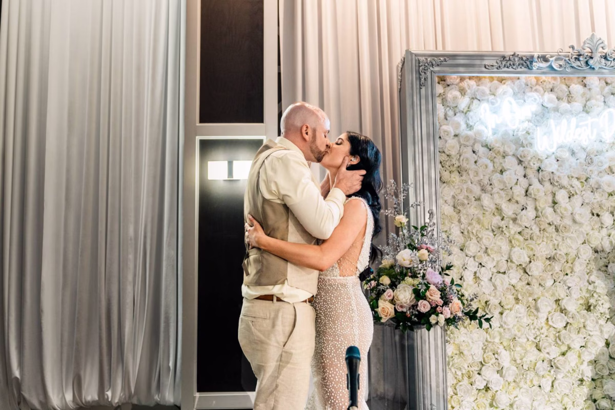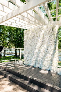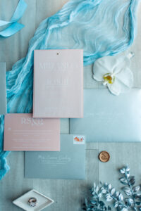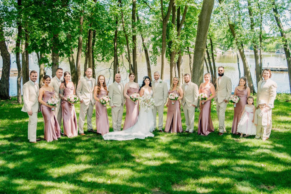 Dusty blues, light pinks, and dazzling details made for a gasp-worthy wedding for Miranda and Josef. The day, excellently planned and designed by Orange Door Weddings, was set perfectly at Celebrations on the River in La Crosse, Wisconsin, with sparkling water in the background. The couple walked down the aisle with a lavish wall of flowers waiting at the end from Enchanted Wall Flowers – a stunning backdrop that added to the amazing vibes of the wedding ceremony!