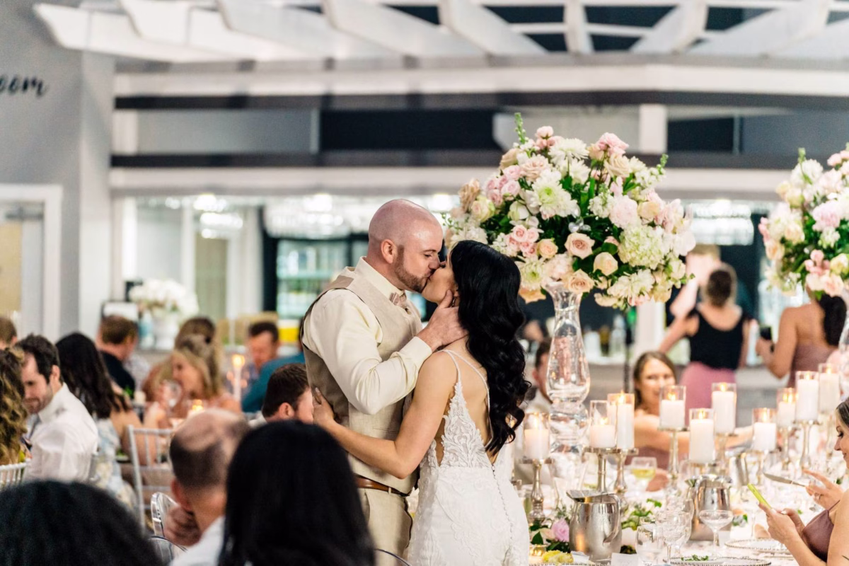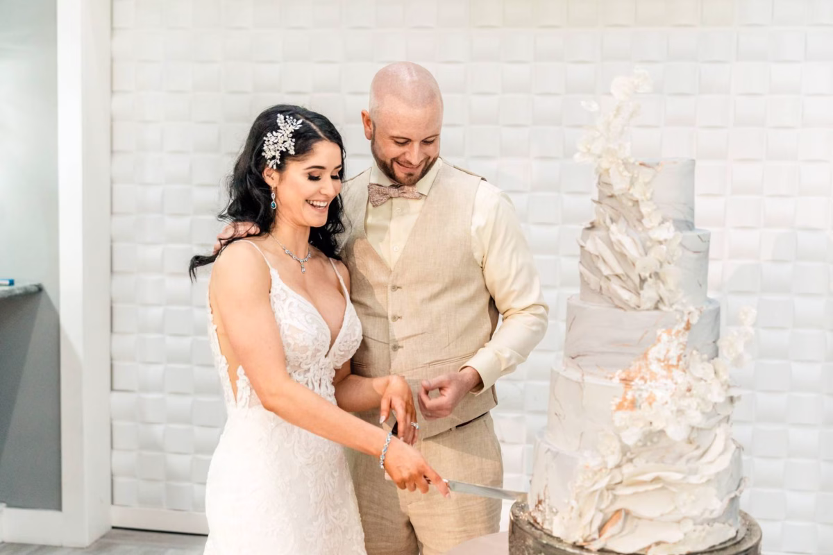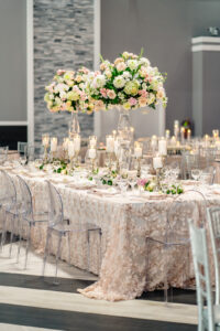 During the reception, a gorgeous and dramatic white marble cake from Meringue Bakery & Cafe took center stage with intricate white flowers and textures. Whimsical Design & Decor elegantly guided guests to their seats with beautiful escort signage, creating an atmosphere of sheer luxury. Additionally, rentals from 4 Sisters Events were strategically placed throughout the venue, adding to the overall opulent ambiance. The magical night ended with Miranda serenading Josef in song, adding a sweet and sentimental surprise to the already incredible day. Scroll below and see all the shimmering, grand details!