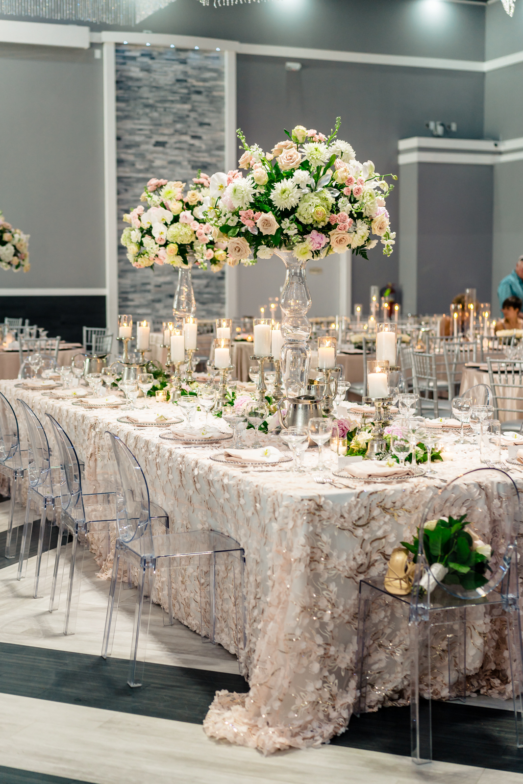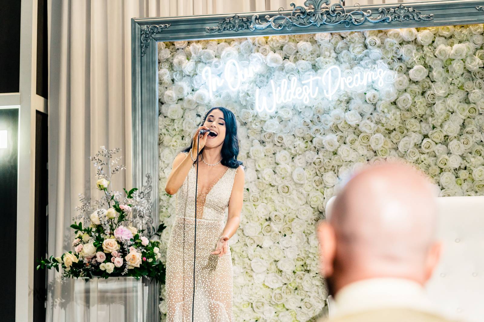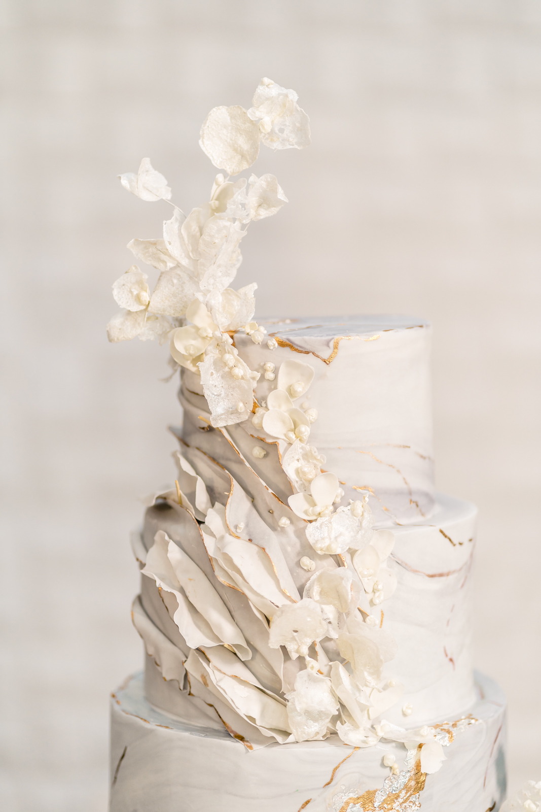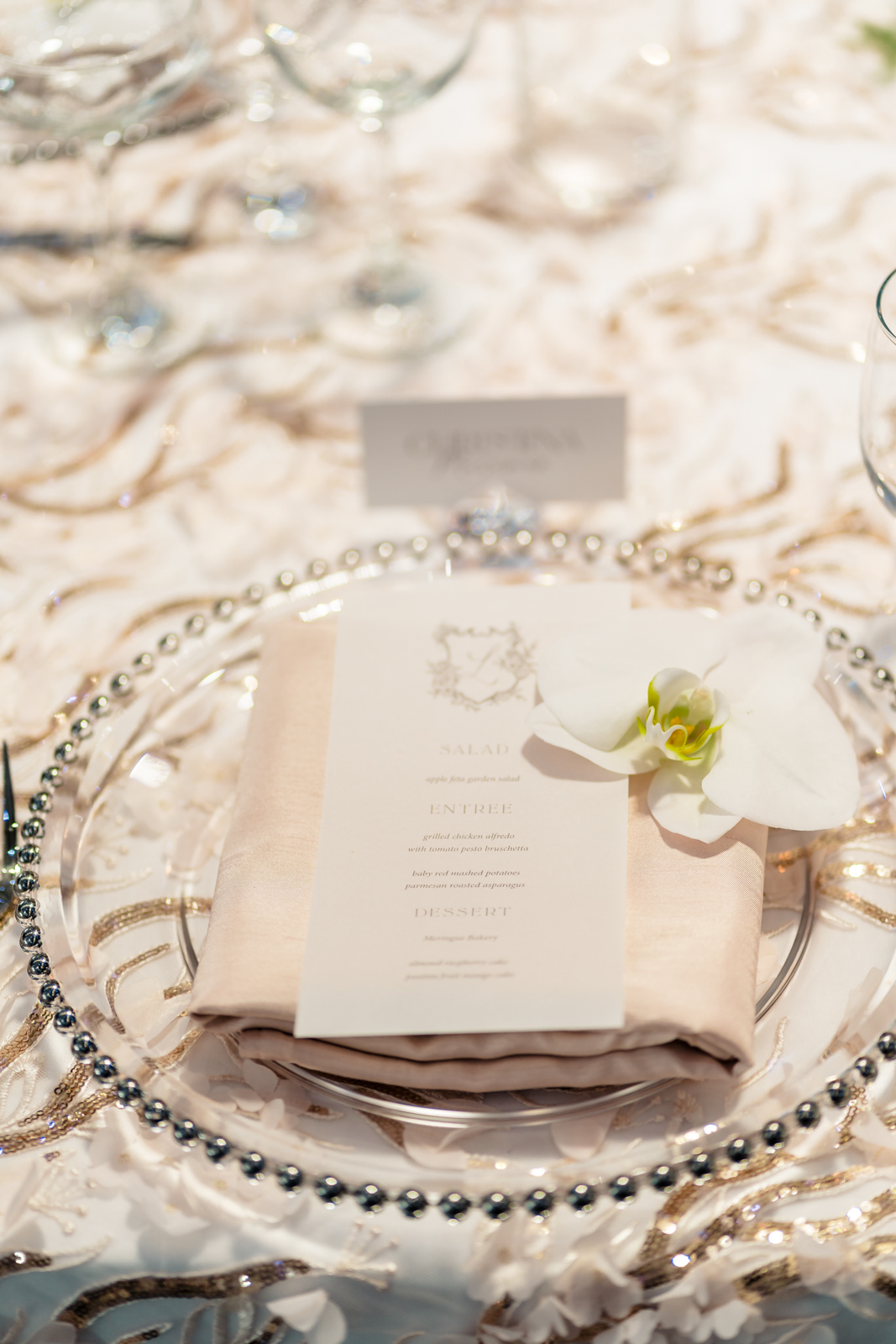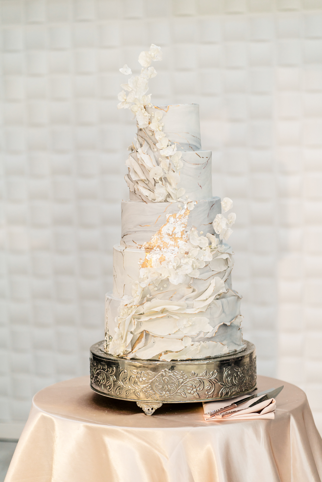 During the reception, a gorgeous and dramatic white marble cake from Meringue Bakery & Cafe took center stage with intricate white flowers and textures. Whimsical Design & Decor elegantly guided guests to their seats with beautiful escort signage, creating an atmosphere of sheer luxury. Additionally, rentals from 4 Sisters Events were strategically placed throughout the venue, adding to the overall opulent ambiance. The magical night ended with Miranda serenading Josef in song, adding a sweet and sentimental surprise to the already incredible day. Scroll below and see all the shimmering, grand details!