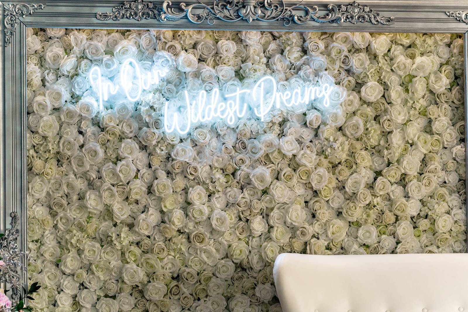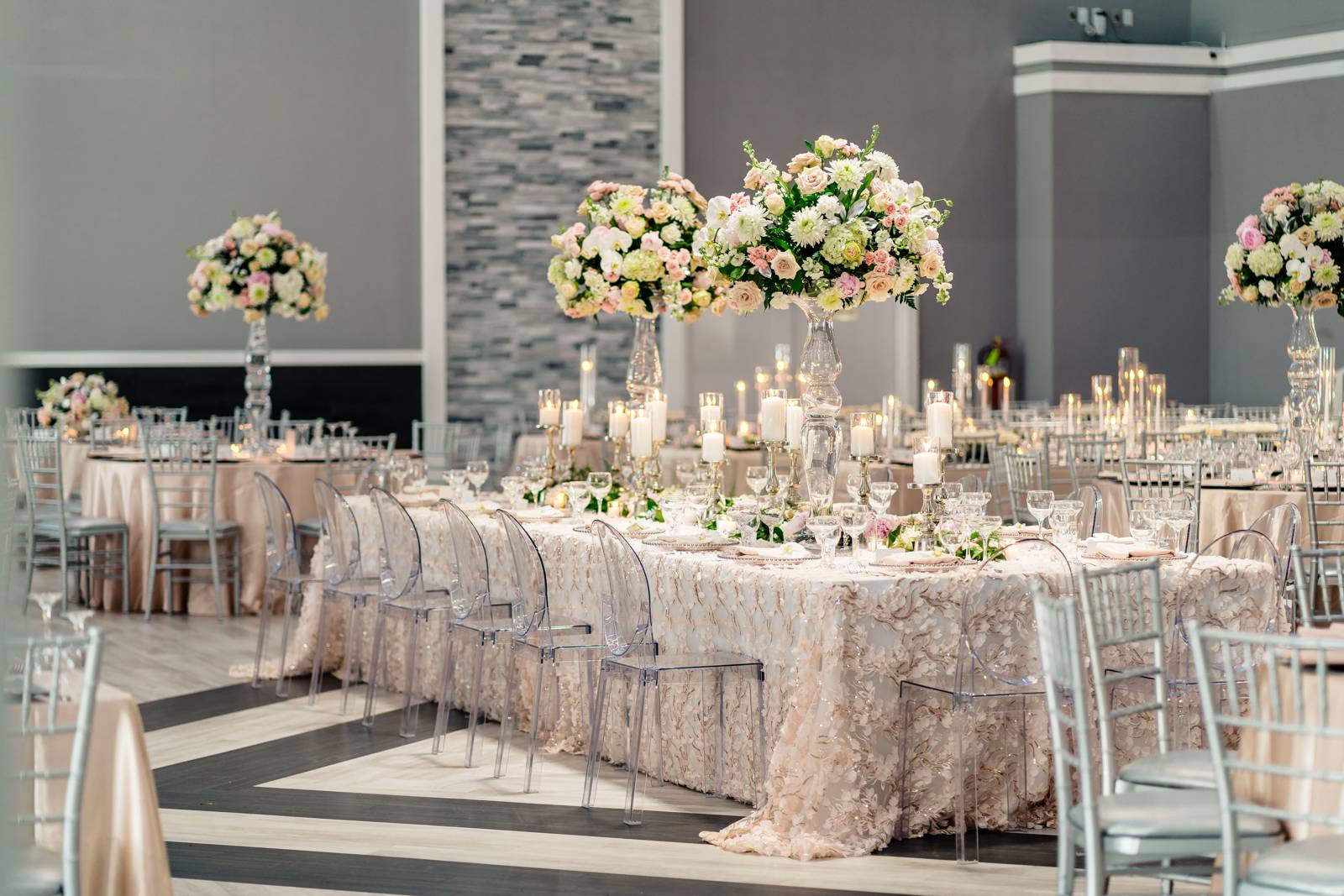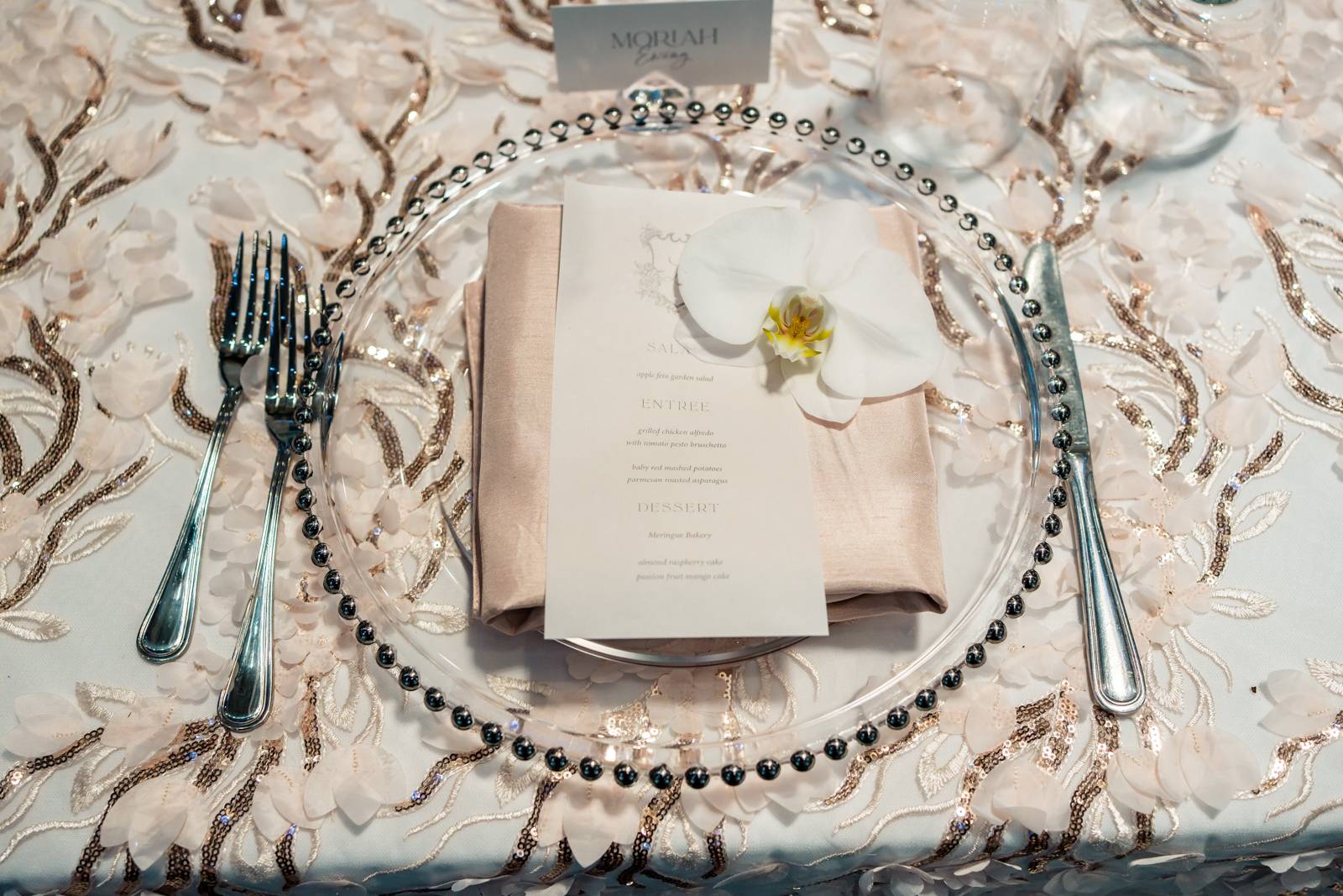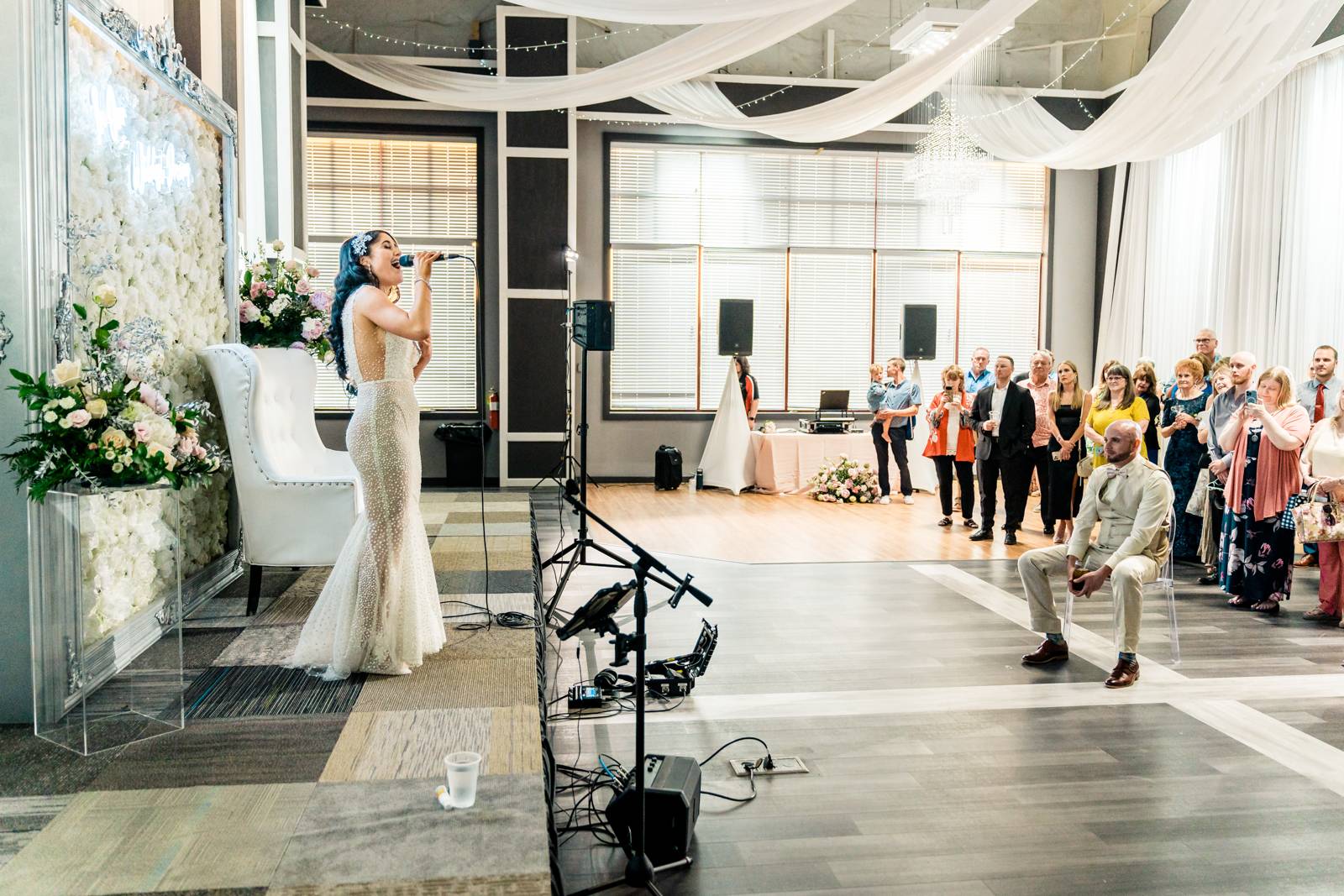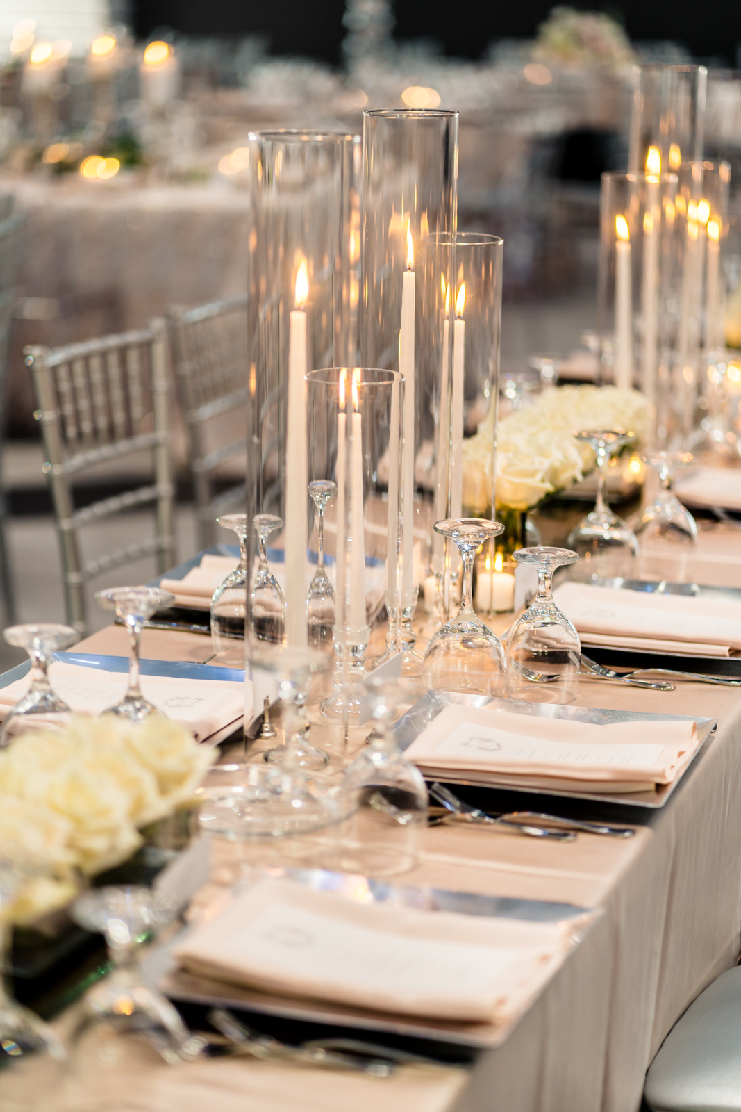 During the reception, a gorgeous and dramatic white marble cake from Meringue Bakery & Cafe took center stage with intricate white flowers and textures. Whimsical Design & Decor elegantly guided guests to their seats with beautiful escort signage, creating an atmosphere of sheer luxury. Additionally, rentals from 4 Sisters Events were strategically placed throughout the venue, adding to the overall opulent ambiance. The magical night ended with Miranda serenading Josef in song, adding a sweet and sentimental surprise to the already incredible day. Scroll below and see all the shimmering, grand details!