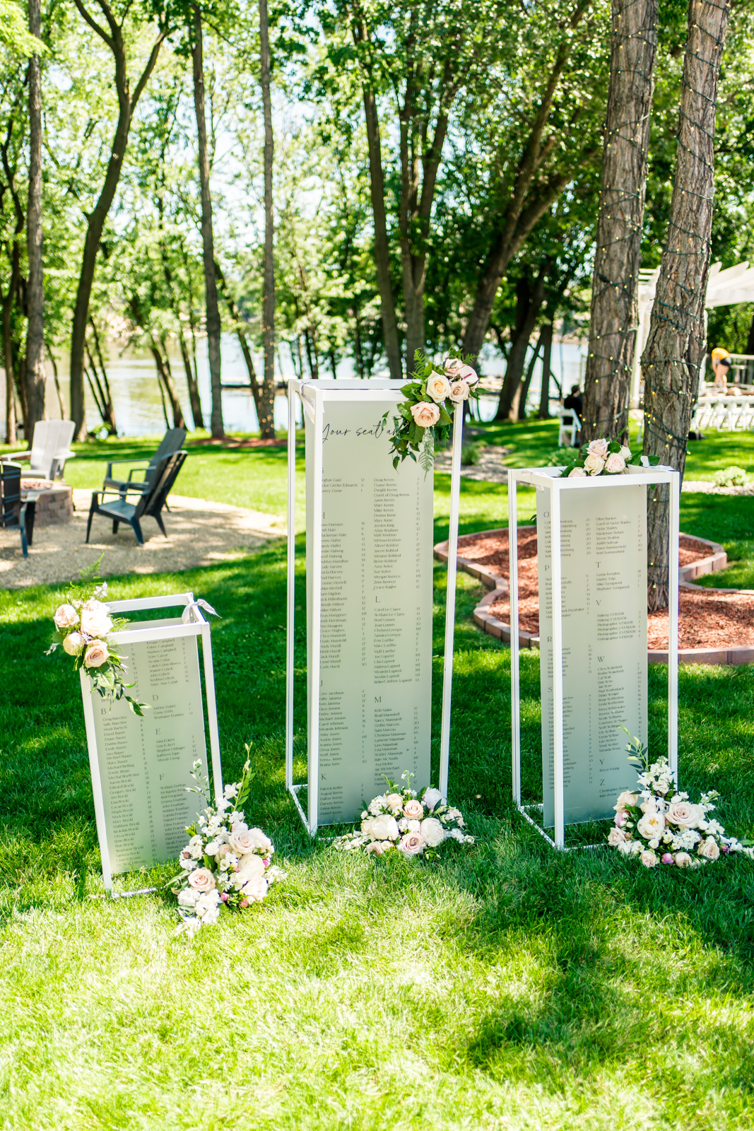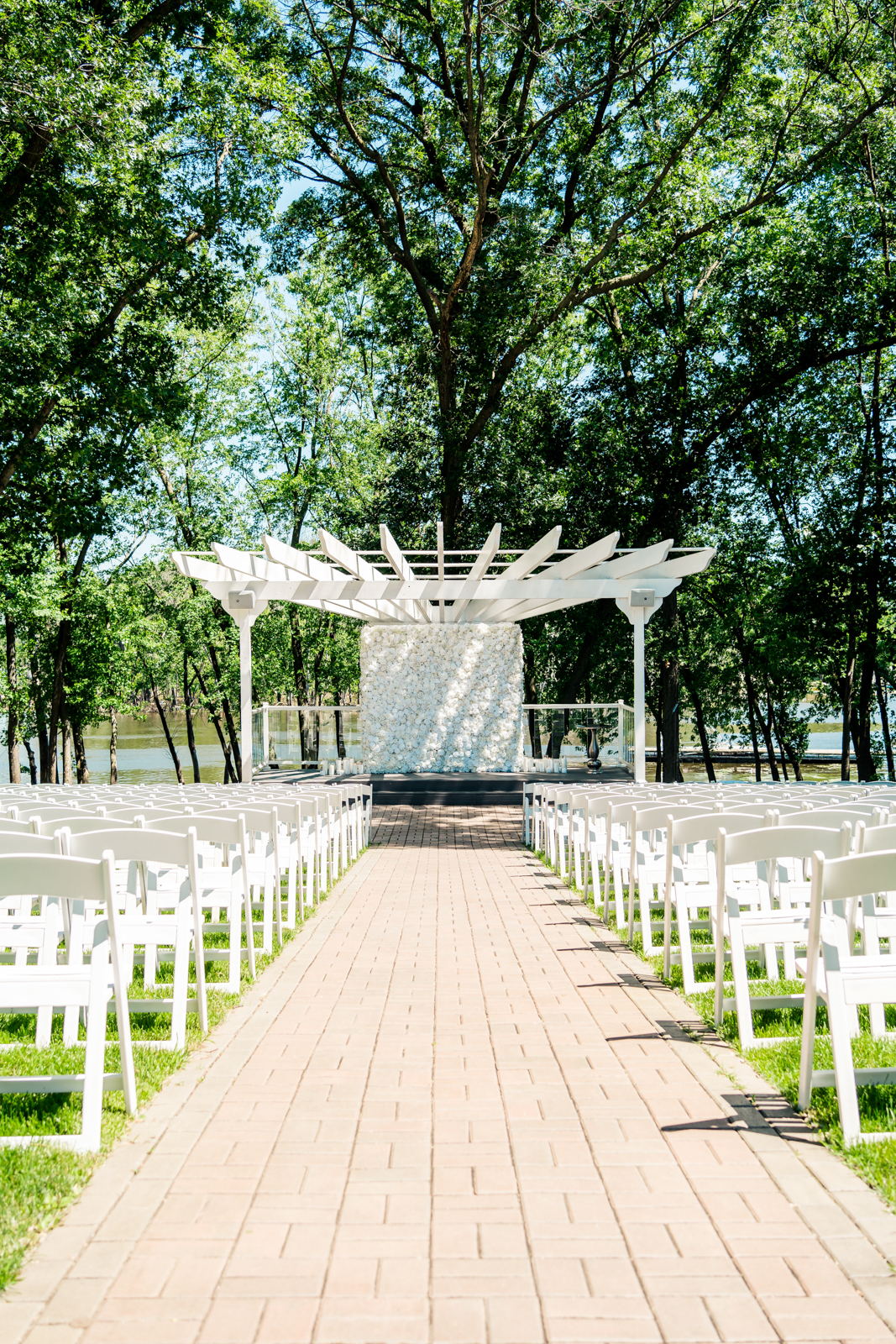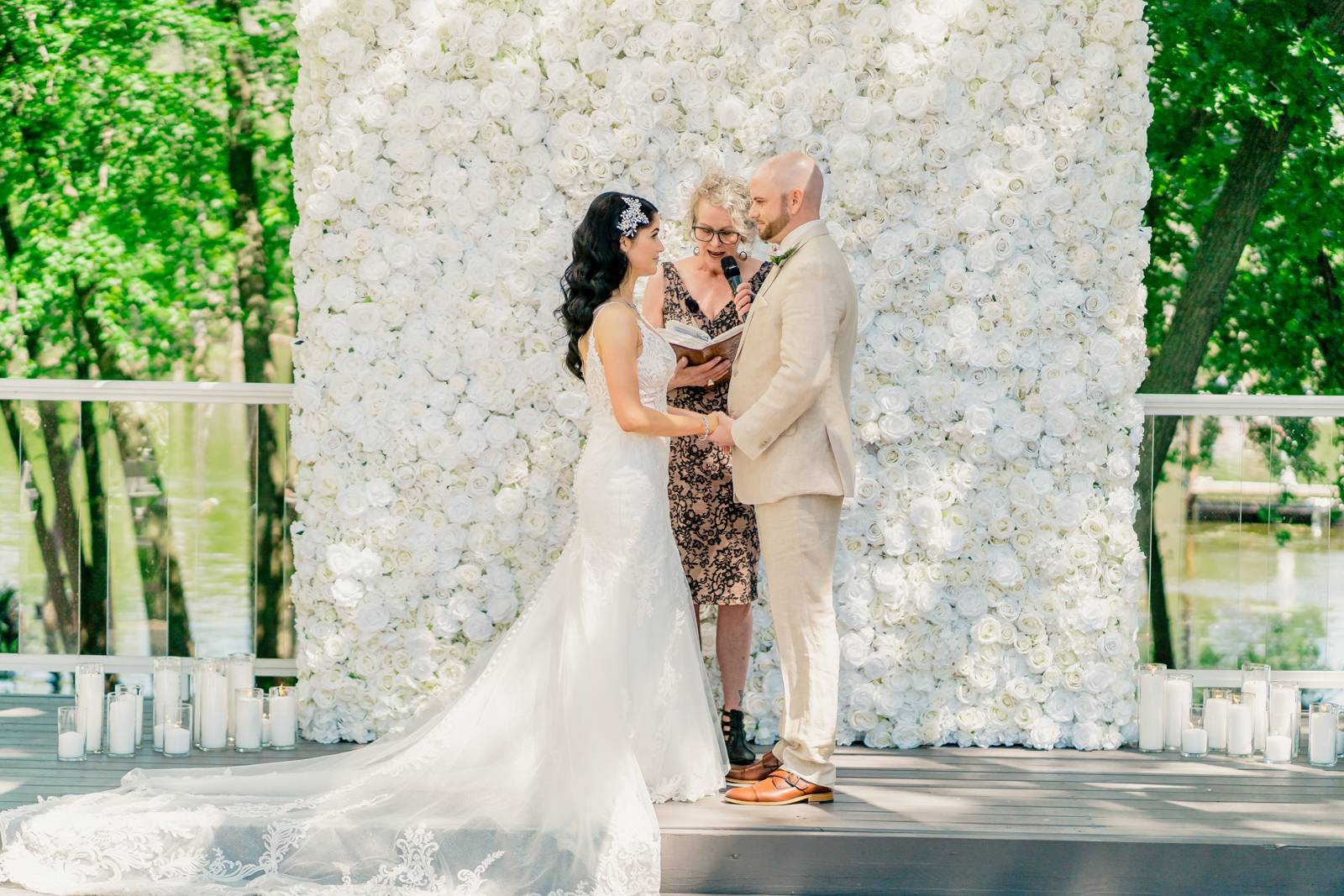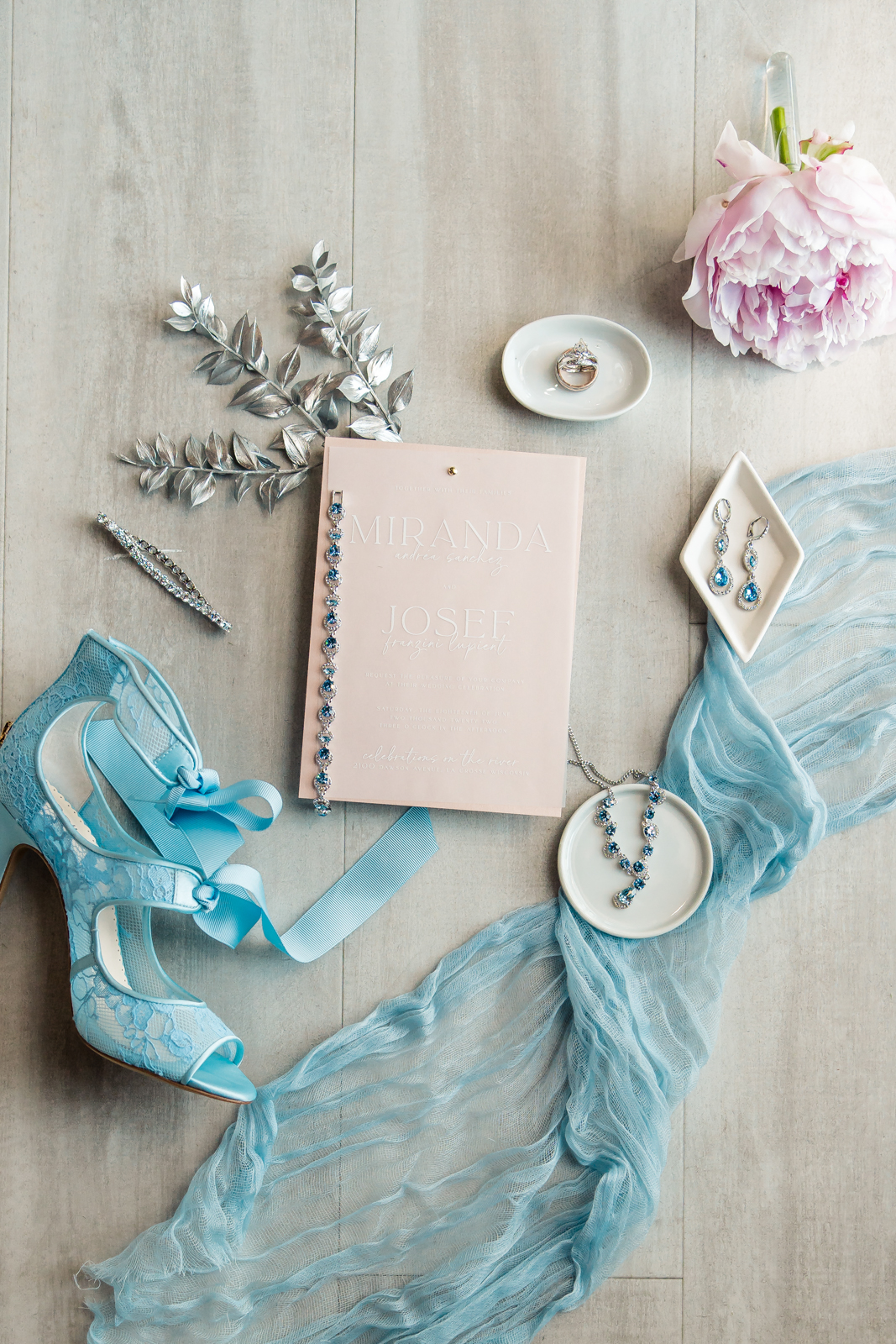 Dusty blues, light pinks, and dazzling details made for a gasp-worthy wedding for Miranda and Josef. The day, excellently planned and designed by Orange Door Weddings, was set perfectly at Celebrations on the River in La Crosse, Wisconsin, with sparkling water in the background. The couple walked down the aisle with a lavish wall of flowers waiting at the end from Enchanted Wall Flowers – a stunning backdrop that added to the amazing vibes of the wedding ceremony!