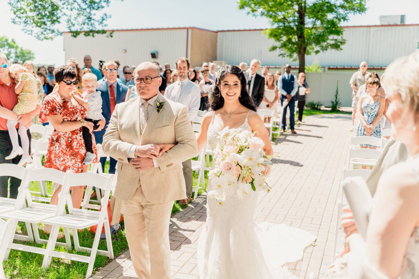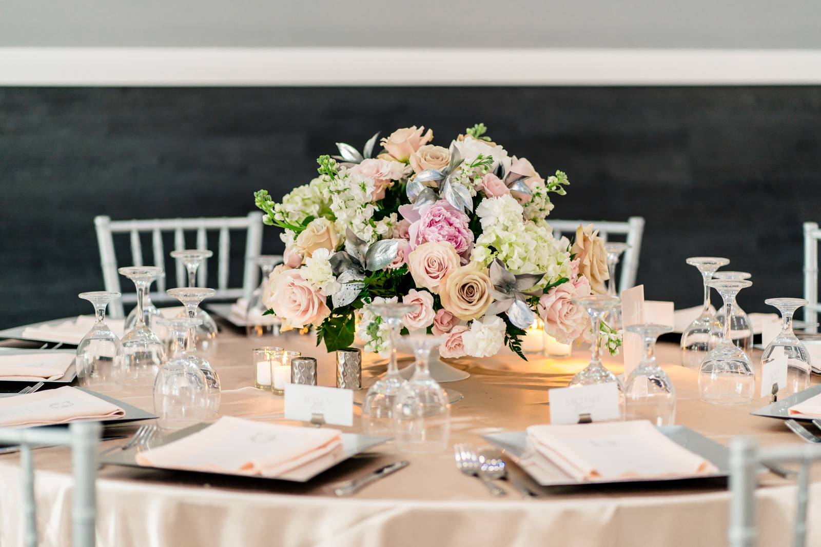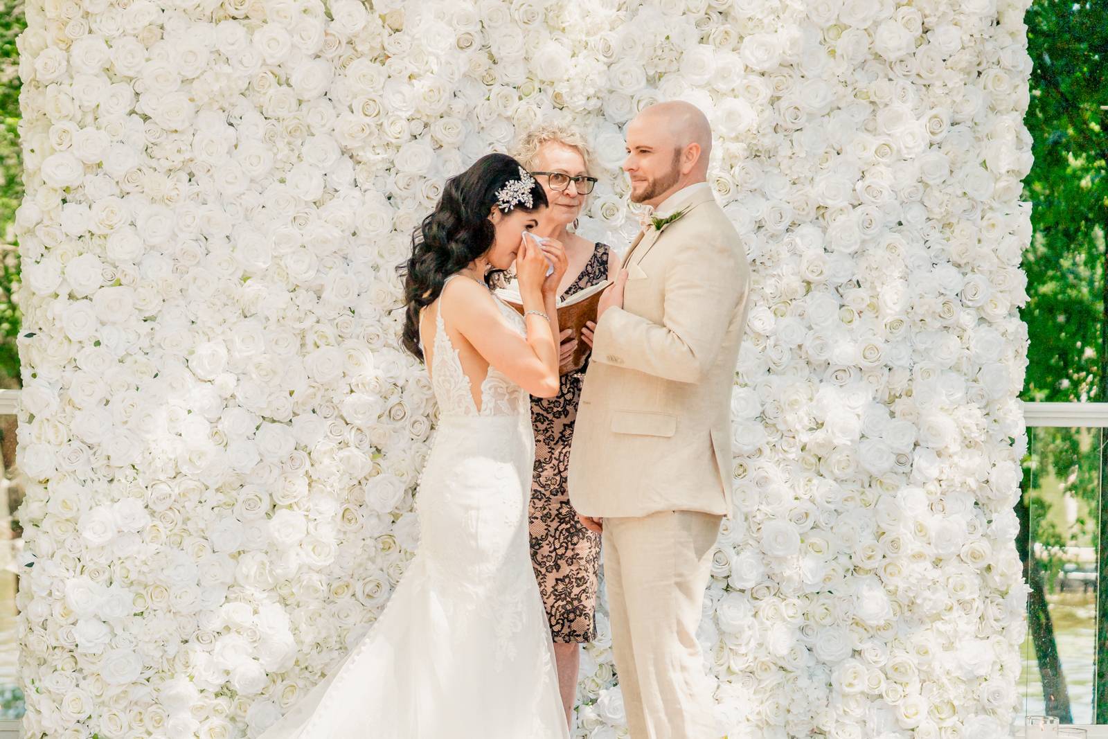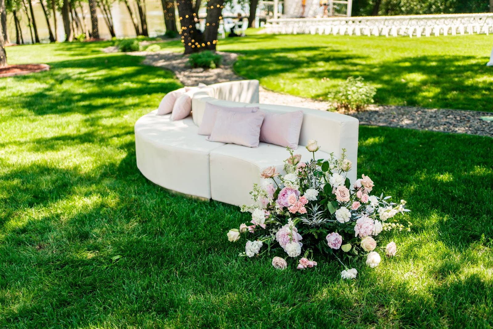 Dusty blues, light pinks, and dazzling details made for a gasp-worthy wedding for Miranda and Josef. The day, excellently planned and designed by Orange Door Weddings, was set perfectly at Celebrations on the River in La Crosse, Wisconsin, with sparkling water in the background. The couple walked down the aisle with a lavish wall of flowers waiting at the end from Enchanted Wall Flowers – a stunning backdrop that added to the amazing vibes of the wedding ceremony!