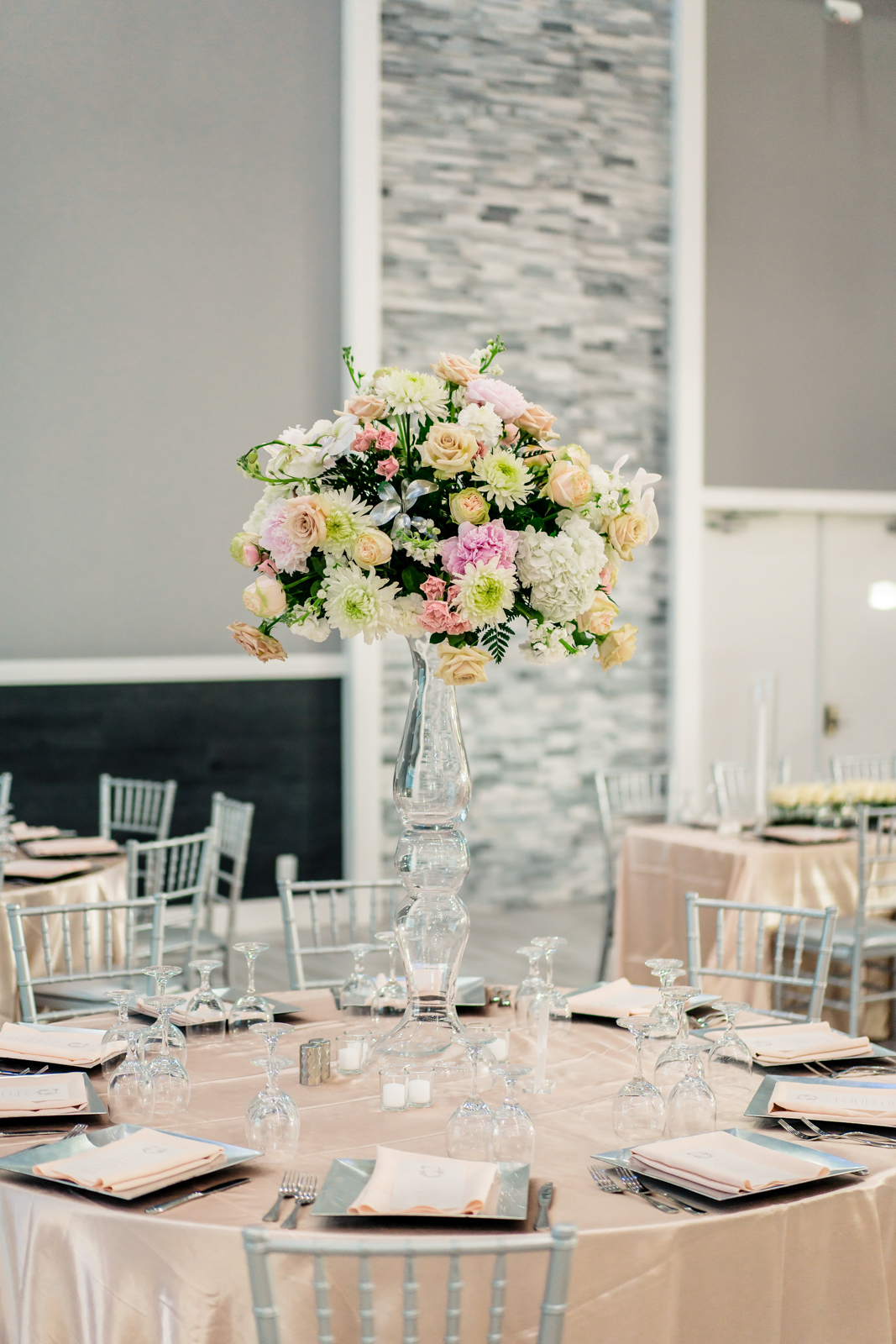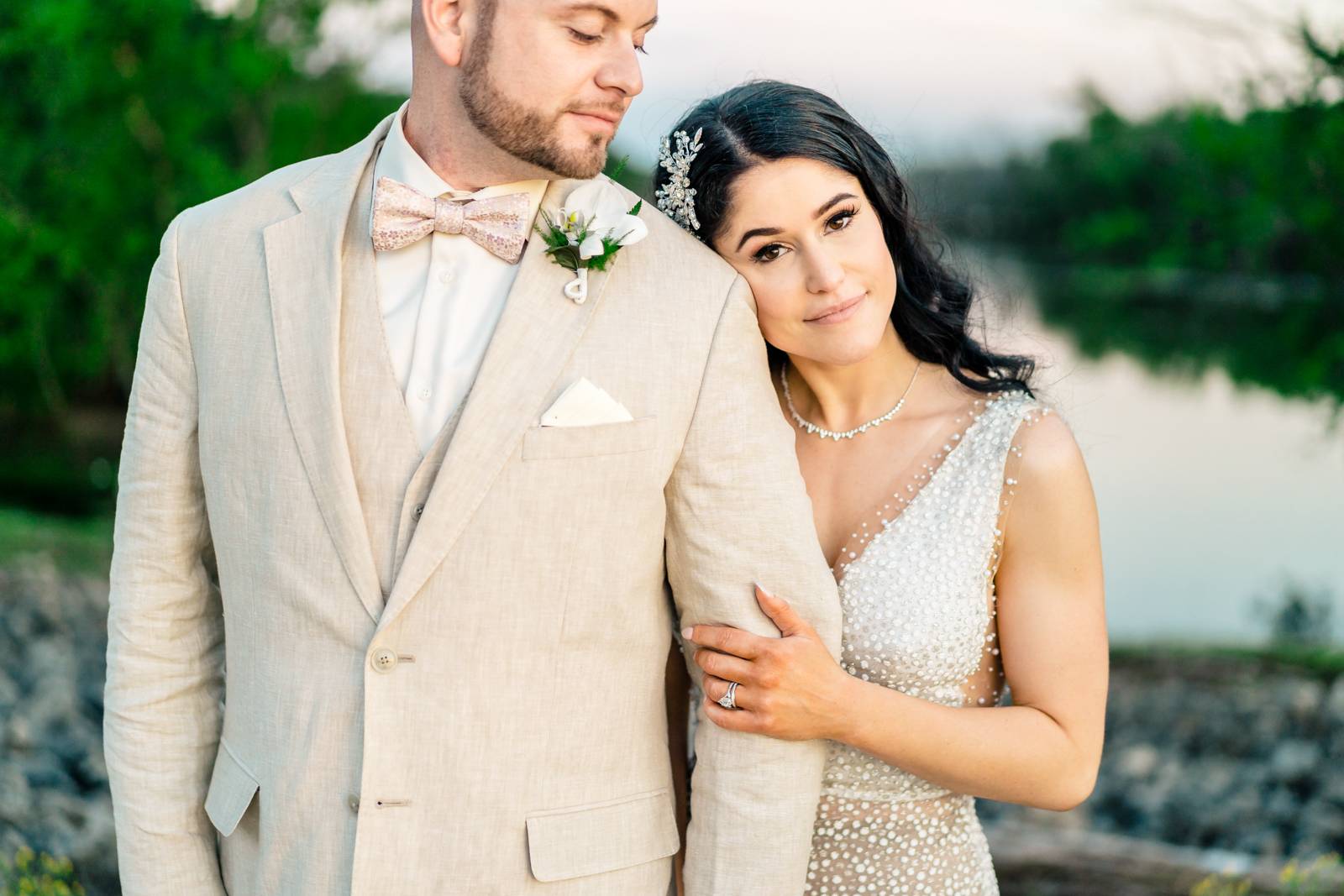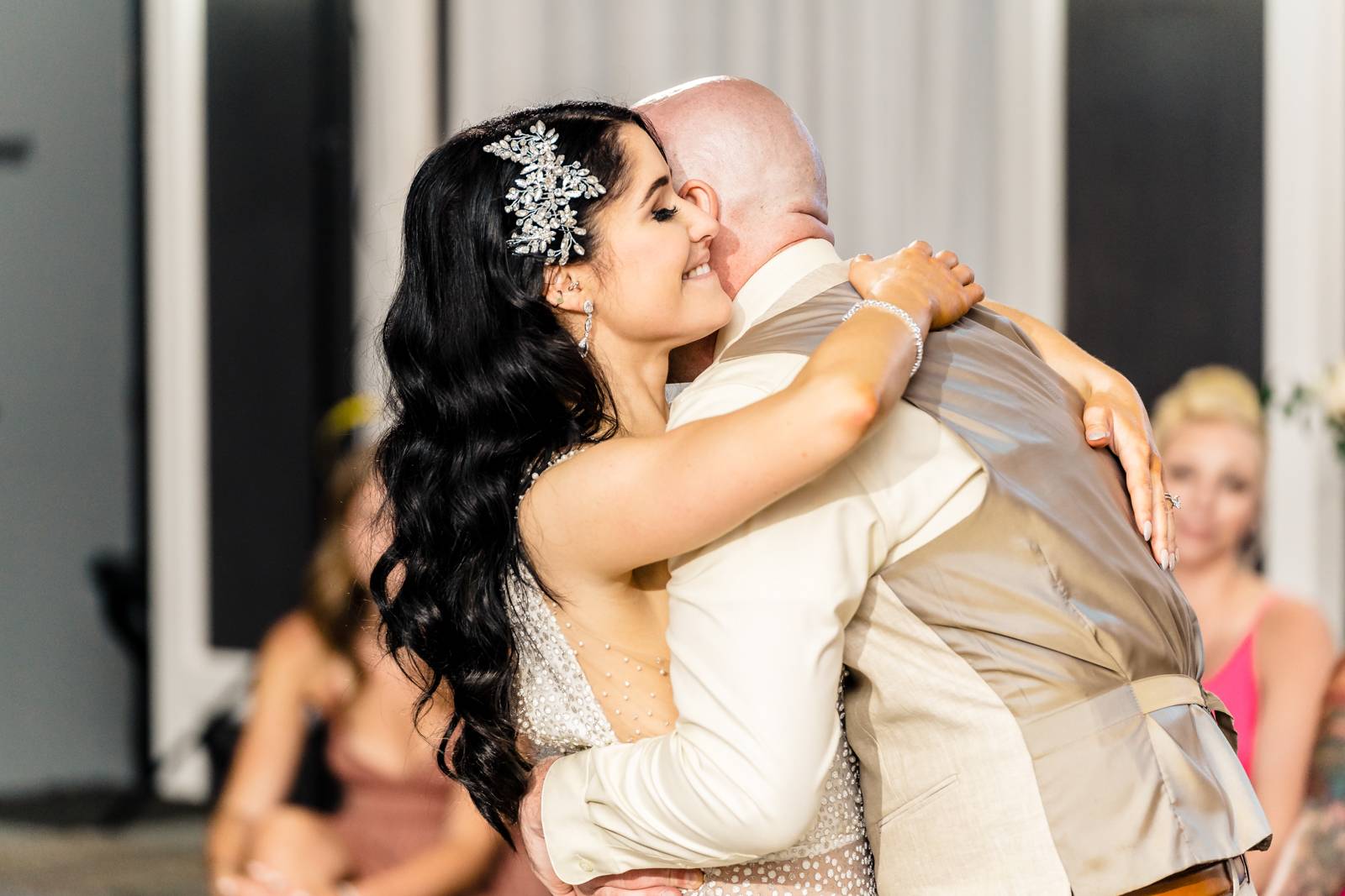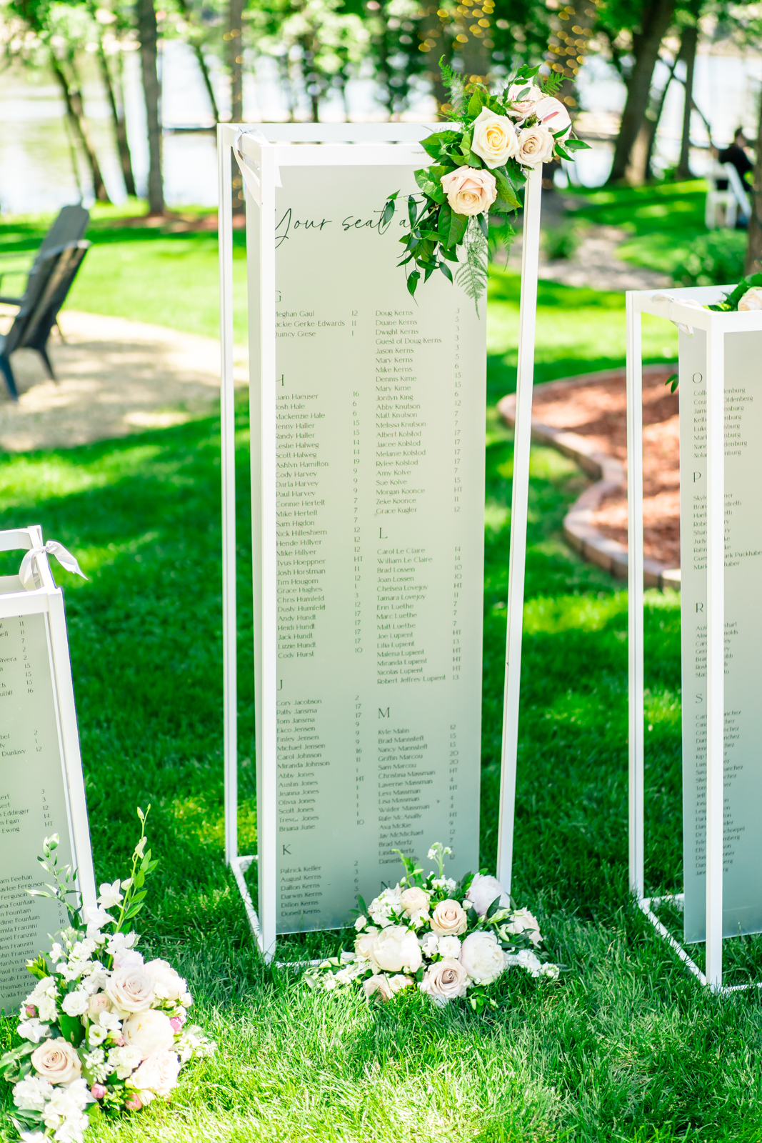 Dusty blues, light pinks, and dazzling details made for a gasp-worthy wedding for Miranda and Josef. The day, excellently planned and designed by Orange Door Weddings, was set perfectly at Celebrations on the River in La Crosse, Wisconsin, with sparkling water in the background. The couple walked down the aisle with a lavish wall of flowers waiting at the end from Enchanted Wall Flowers – a stunning backdrop that added to the amazing vibes of the wedding ceremony!