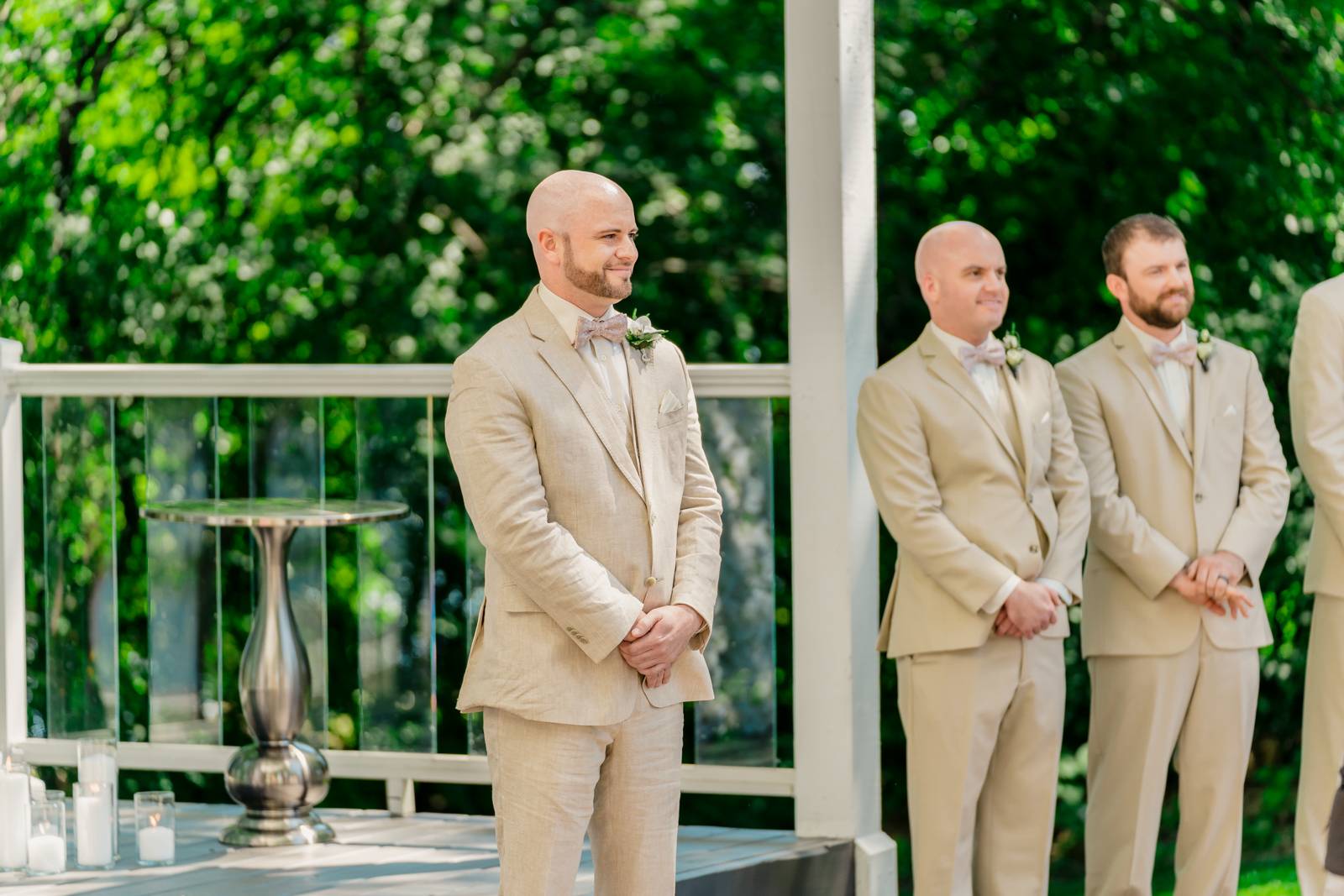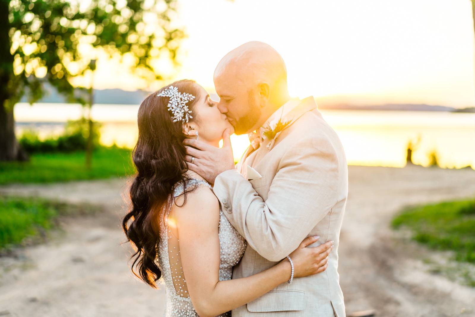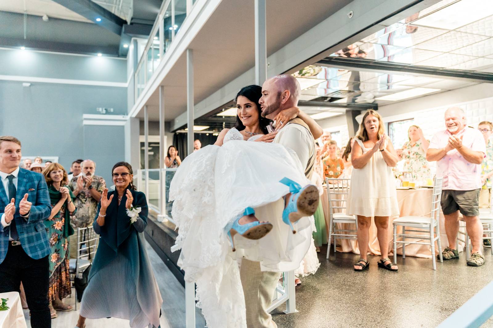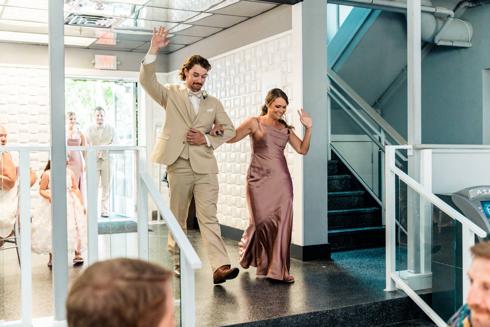Dusty blues, light pinks, and dazzling details made for a gasp-worthy wedding for Miranda and Josef. The day, excellently planned and designed by Orange Door Weddings, was set perfectly at Celebrations on the River in La Crosse, Wisconsin, with sparkling water in the background. The couple walked down the aisle with a lavish wall of flowers waiting at the end from Enchanted Wall Flowers – a stunning backdrop that added to the amazing vibes of the wedding ceremony!