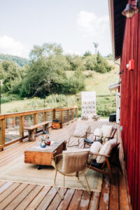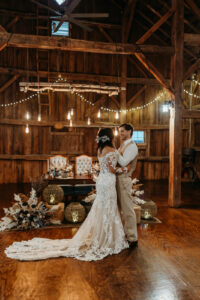 Resource Vintage Rental transformed this barn venue, complementing the rich wood tones with their rental selections of rustic harvest tables, cross back chairs, pendant lighting, and other charming pieces. Their selections created a cozy and enchanting atmosphere both indoors and out, from an outdoor lounge seating area to an elegant sweetheart table fit for a wedding design that marries rugged charm and refined beauty.