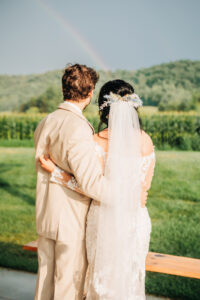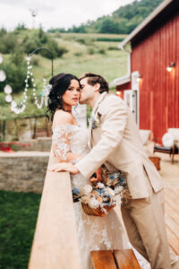 Our bride is breathtaking in a seemingly effortlessly tousled updo accented with a custom floral hairpiece by Metropolitan Salon & Spa and a soft, yet smokey makeup look brought to life by Makeup by Sarah Koblitz. Adorned by a romantic, off-the-shoulder gown with a jaw-dropping train and a well-fitted tan suit with a floral-patterned tie, this couple embodies the rustic yet elegant allure of their surroundings.