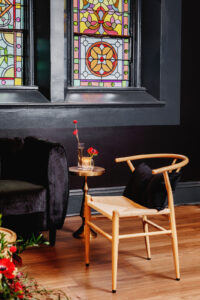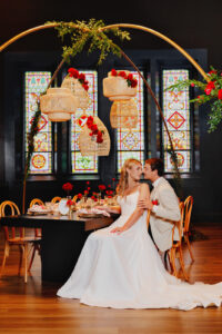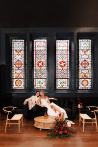 With its dramatic black walls, ornate chandeliers, warm wooden floors, and stunning stained glass windows, Capella Weddings & Events’ historic event space provided the ideal setting for this dark and decorative wedding design. Originally constructed in 1886, this location was once the First Methodist Episcopal Church of La Crosse – a local gem preserved for celebrating!