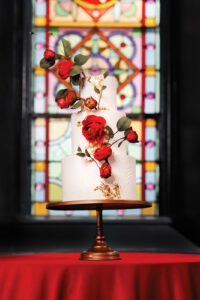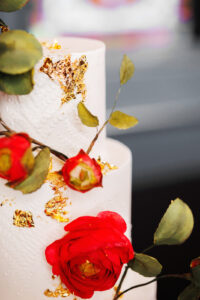 Meringue Bakery & Cafe crafted a 3-tiered, textured white cake with shimmering edible gold foiling to perfectly fit the day’s theme. Adorned with red flowers for a pop of color, this sweet treat was both an eye-catching and delicious addition to the reception.
