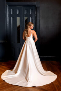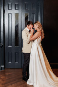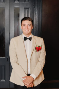 Outfitted by Charlotte’s Bridal & Formal Wear, our bride wore a simple yet sophisticated A-line gown featuring a slit up the side and an embellished bridal belt to elevate her elegant look. Our groom was sharp in a creamy beige jacket and sleek black pants polished with a black bow tie and pocket boutonniere.