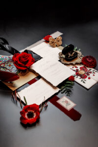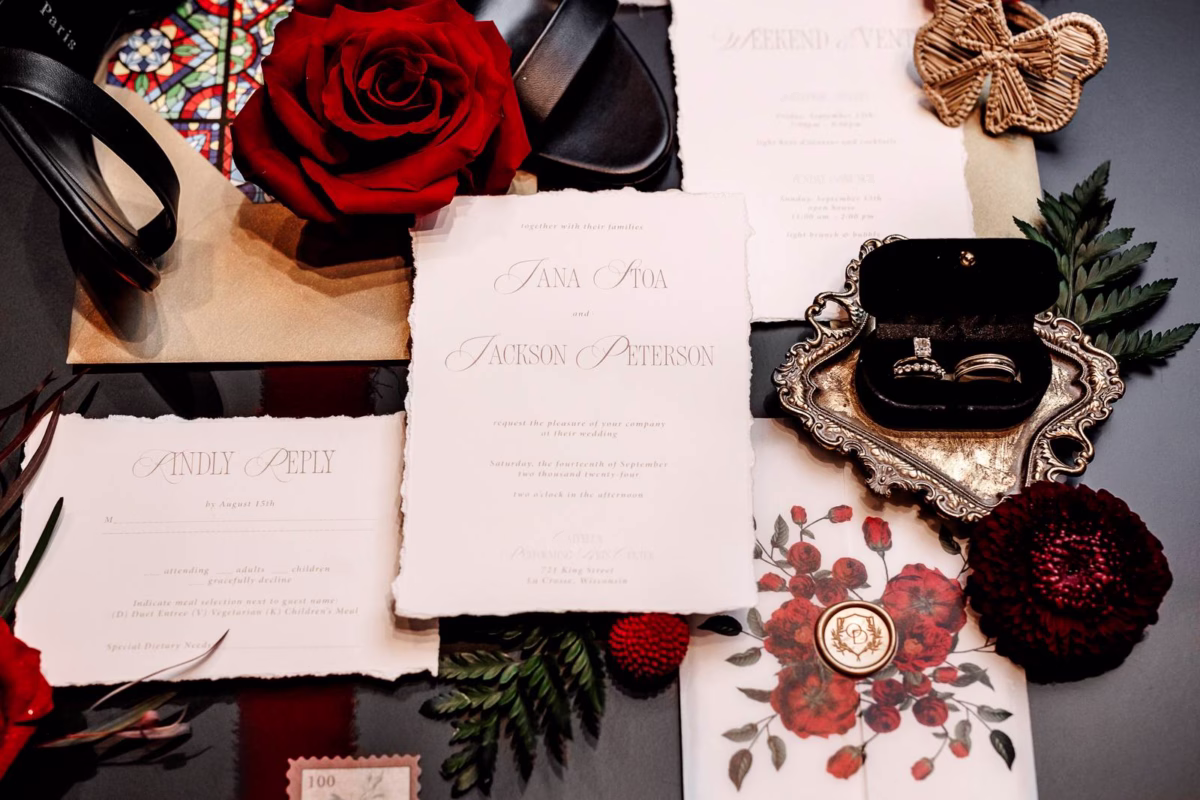Moody elegance met gothic glam in this dark and dramatic wedding design at Capella Weddings & Events in La Crosse, Wisconsin. With the deep allure of black, the passionate vibrancy of red, and the opulent sophistication of gold, a rich and bold color palette set the scene for a romantic yet mysterious wedding design. A historic church venue provided a backdrop reminiscent of a Spanish cathedral celebration.