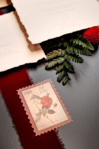 Orange Door Weddings created an elegant torn-edge invitation suite to introduce this grand affair. A red floral printed vellum wrap closed with a gold wax seal embellished the invitation while a custom, multicolored envelope liner beautifully mimicked the stained glass windows of the venue.