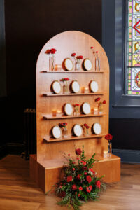 A cozy lounge area curated by Orange Door Weddings was set under the alluring stained glass windows of the venue, providing a comfortable space to relax and cheers to the new nuptials! A statement seating chart with ornate gold mirrors displayed on shelves of a warm wooden arch was a noteworthy focal point of the design.