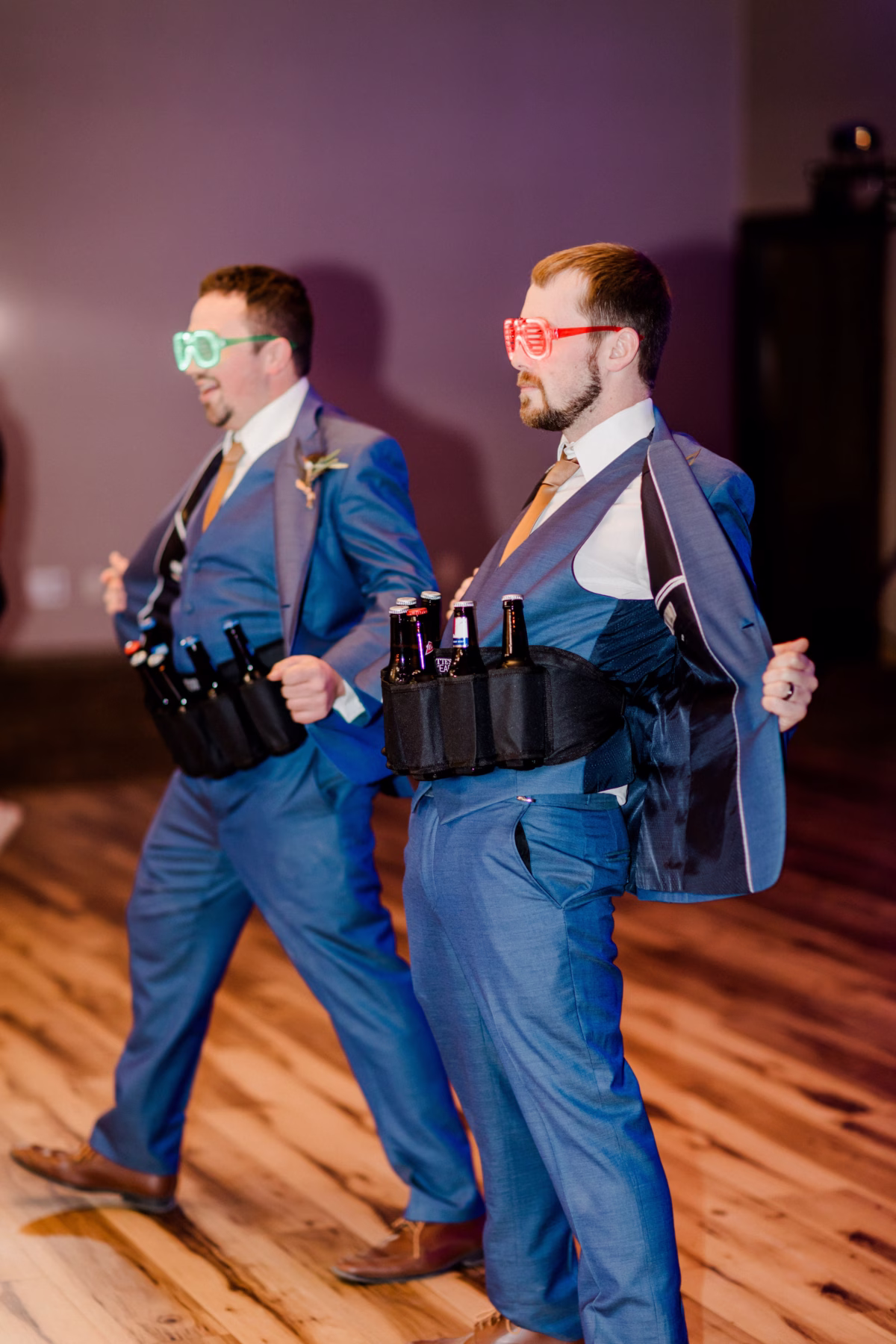 The wedding color palette embraced the colors of the season: white, steel blue, brown, and taupe. Matt and his groomsmen found their suits at Charlotte’s Bridal, with Matt dressed in a lighter shade of blue. Matt also wore a white tie, while his groomsmen wore brown satin.