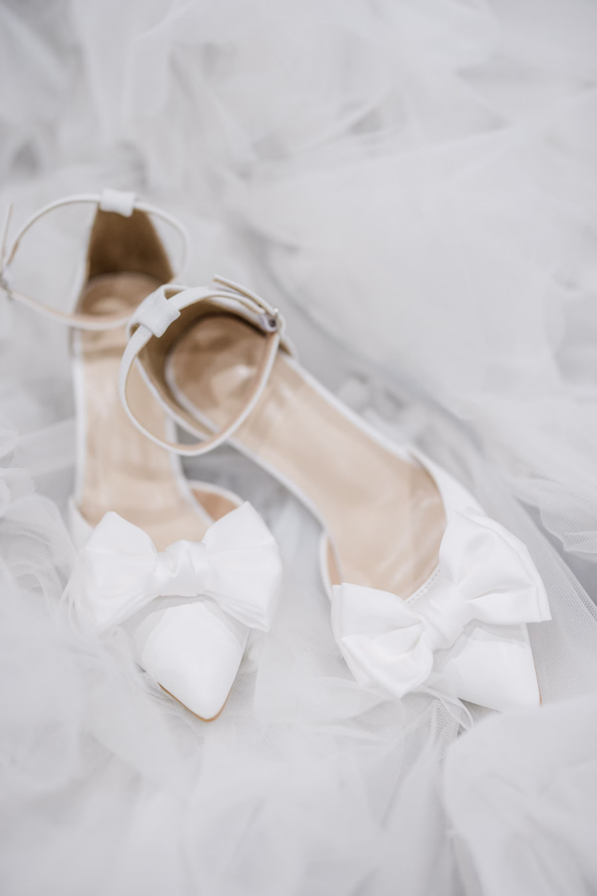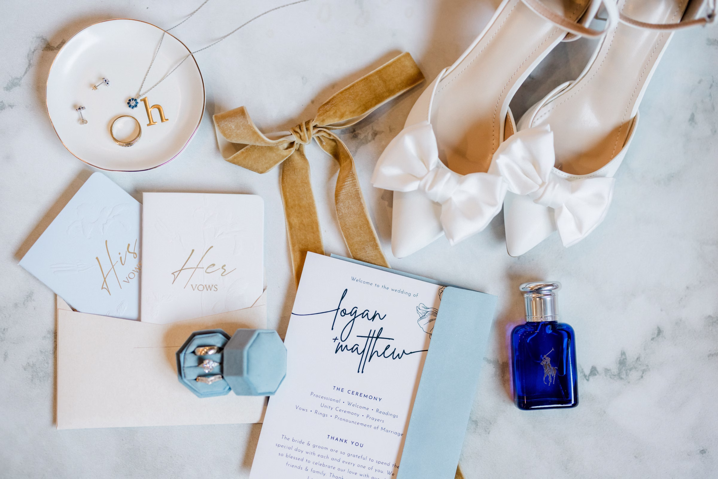 Florist Wildflower & Wren designed artful and unique bouquets for Logan and her bridesmaids. The blooms echoed the day’s color palette, featuring white anemones, white roses, blush spray roses, and blue delphinium. Abundant greenery framed the florals, including eucalyptus, ruscus, and leatherleaf fern, giving the final arrangements a modern, asymmetrical feel.