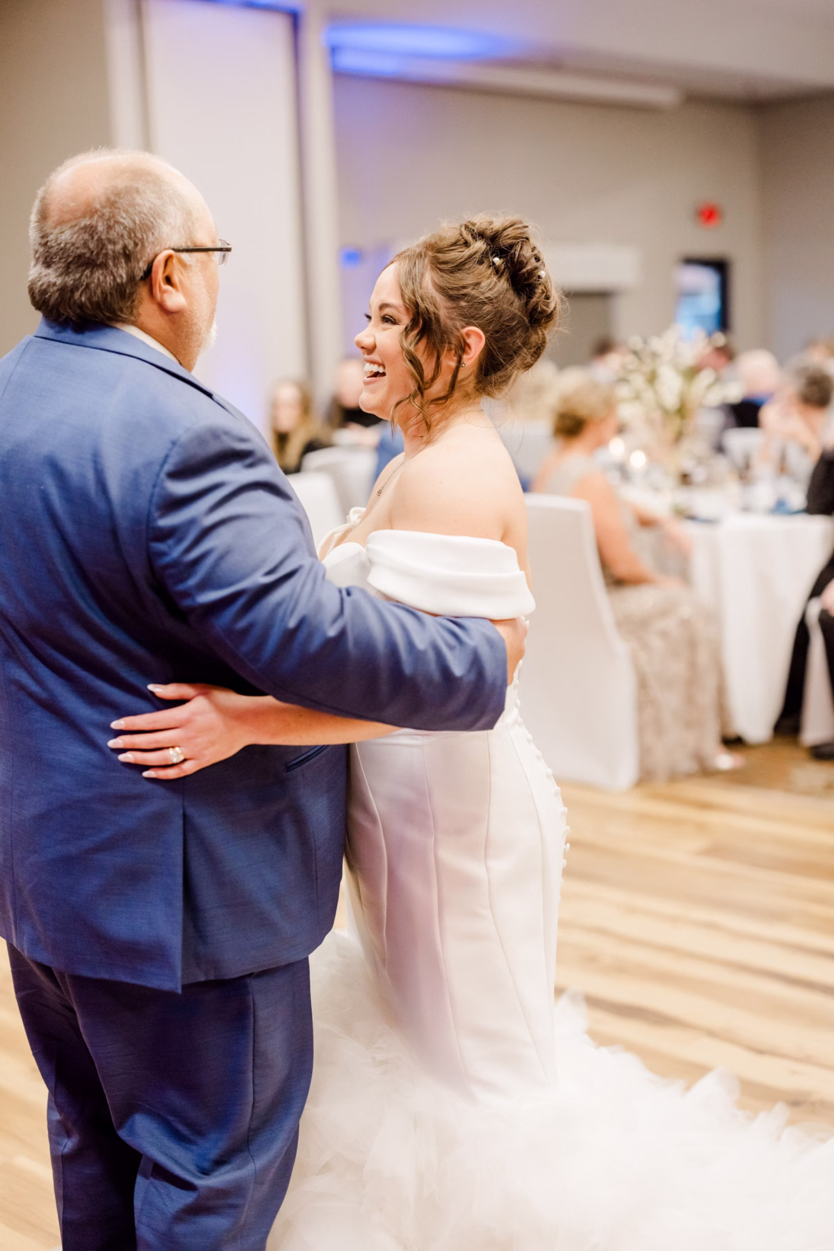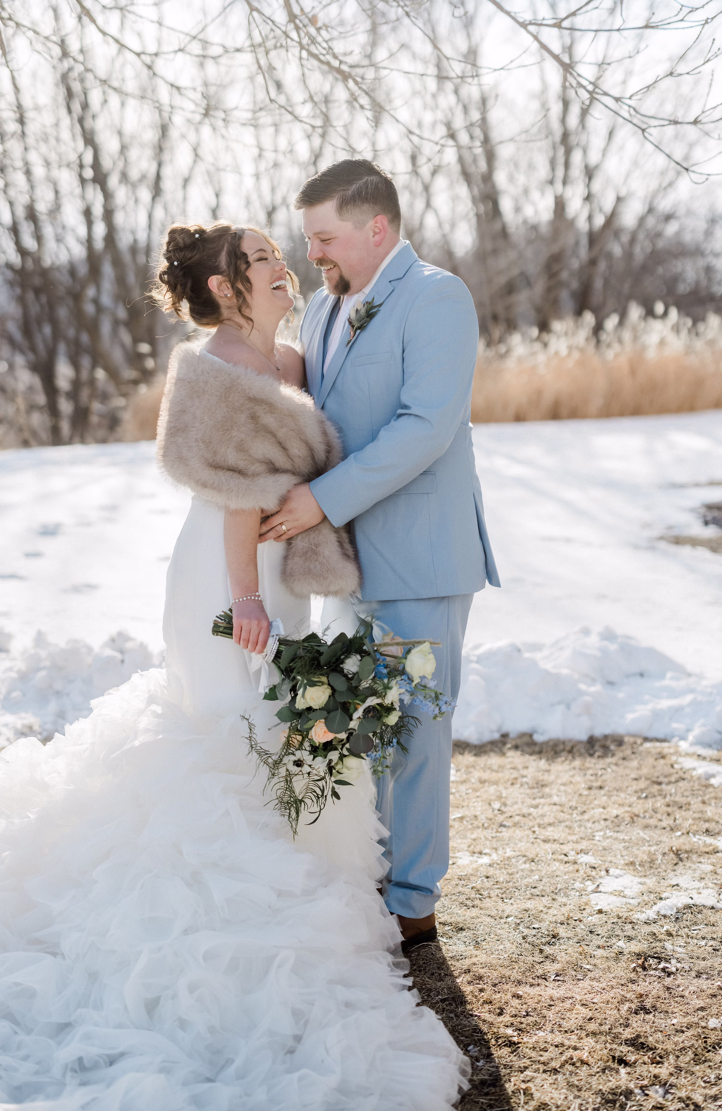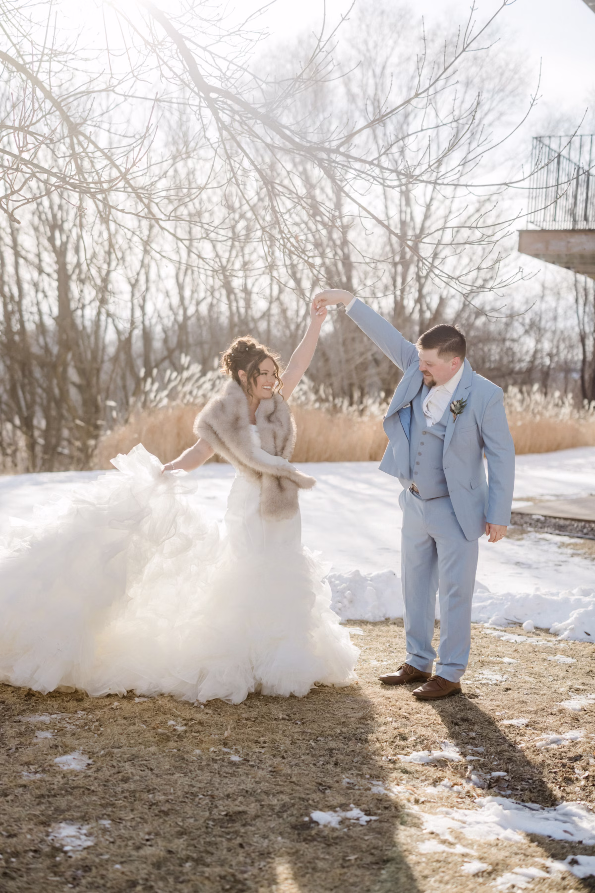 Stoney Creek Hotel in Onalaska was the perfect all-in-one location for preparations, accommodations, reception, and yes, an outdoor February ceremony! Guests bundled up for the occasion, and the couple also provided hand warmers for the sunny winter vows, framed by a snowy landscape.