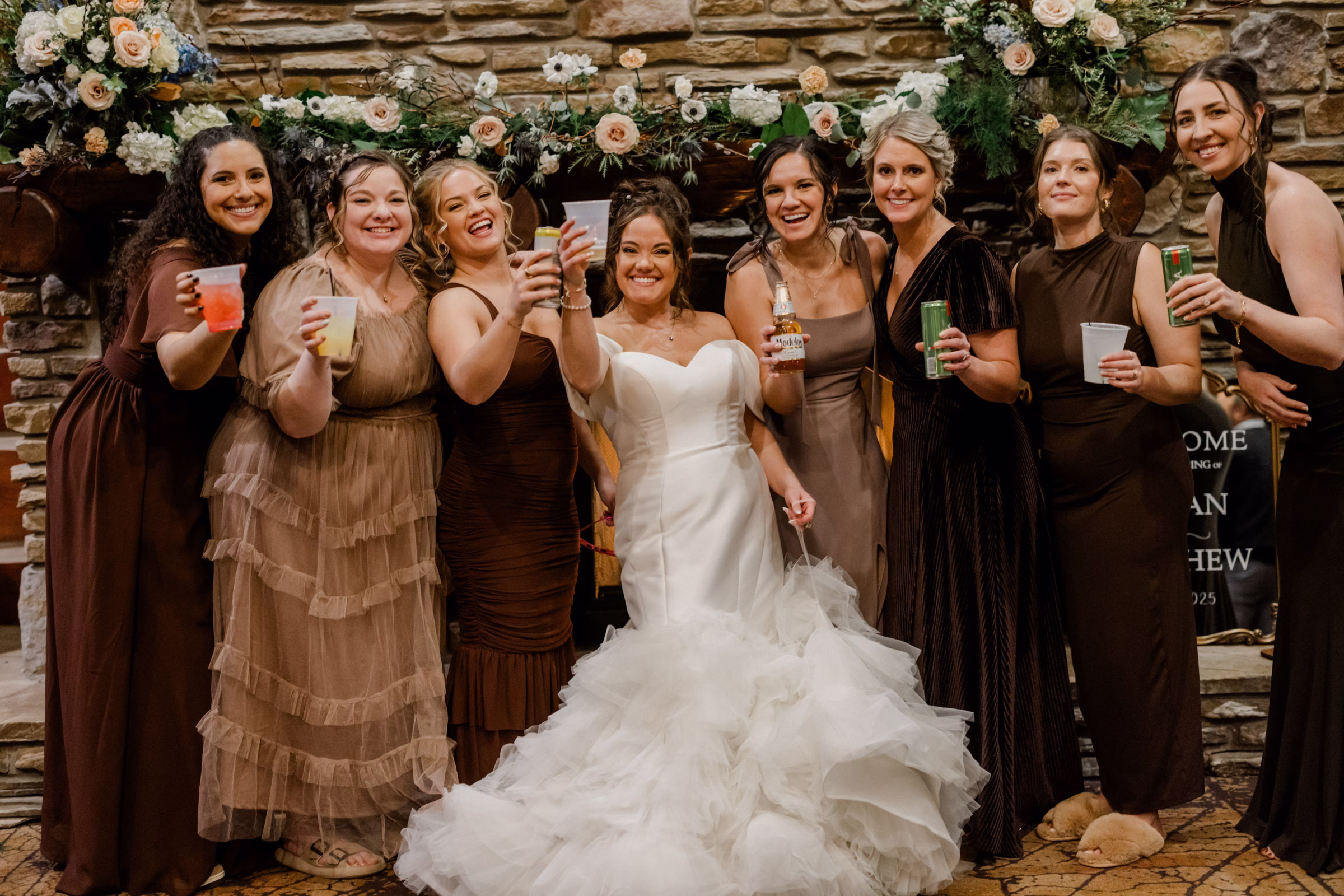 Bridesmaids wore uniquely styled dresses of varying shades of brown, ranging from pastel to dark.