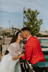 Melody Rose Designs has a knack for imaginative and distinctive floral arrangements, and the incorporation of colorful blooms into our couple’s attire was no exception. In addition to a lively bouquet filled with vibrant red and soft, romantic pink roses, a playful floral accent on the bride’s heart-shaped sunglasses was an unexpected twist to the bride’s chic ensemble. With a matching boutonniere for the groom, the couple was poised to celebrate in style!