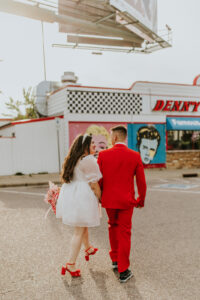 Our groom confidently rocked a vibrant red suit from Men’s Wearhouse, paying homage to the classic 1950s style, but with a colorfully modern twist. His daring choice showcased a fusion of classic sophistication and Vegas-style vibrancy. Beside him, our bride channeled retro elegance with a short, contemporary-chic dress featuring playful puff sleeves. Her striking, pleated red heels were the perfect pop of color for her ensemble – a delightful coordination with her new spouse’s vivid attire!