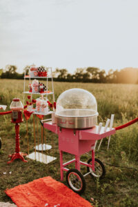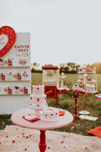 A drive-in experience isn’t complete without snacks! LK Bridal Studio designed a snack wall displaying custom snack boxes for Coca-Cola, fries, and popcorn for guests to enjoy! A large red, lit-up heart adorned the top of the display, featuring the couple’s names like the stars of a Hollywood film. From candy labels to a vintage welcome sign, vinyl decals, and so much more, LK Bridal Studio personalized this reception to perfection. Grab a bite, and let’s get this party poppin’!