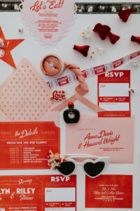Old Hollywood films, classic diners, and vintage Valentine’s Day cards inspired LK Bridal Studio’s retro drive-in-themed stationery pieces. Their skilled team created a movie ticket invitation with a perforated ticket stub RSVP. The main slanted script font was reminiscent of romantic movie posters and unforgettable classics, while supporting fonts may have once lit up a theatre marquee!