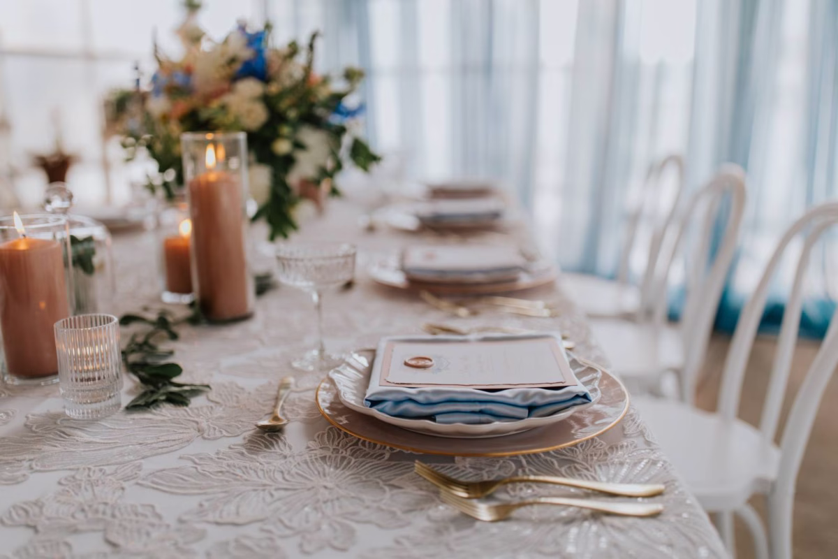 A meticulously curated tablescape in the spirit of Regencycore elegance, features brushed gold flatware from 4 Sisters Events, opulent gold-rimmed chargers from BBJ La Tavola, and linens by Nuage Designs that add a touch of enchantment to the display. Their delicate satin napkins and sparkling White Floralia overlay layered atop their Powder Blue Satin underlay exquisitely lay an ethereal-feeling foundation for a table design that marries the grace of the Regency era style with sophisticated modern touches.