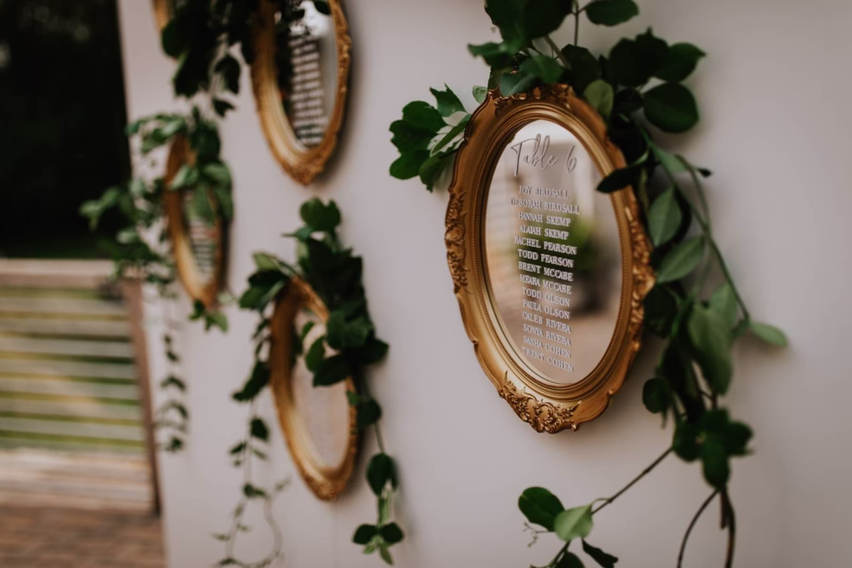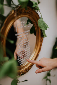 To pair vintage charm with modern readability, a showstopping escort card wall from Orange Door Weddings featured skillful lettering by Whimsical Design & Decor. Their thoughtful choice of fonts paid homage to the mirrors’ classic appeal while ensuring clear and simple navigation for guests.