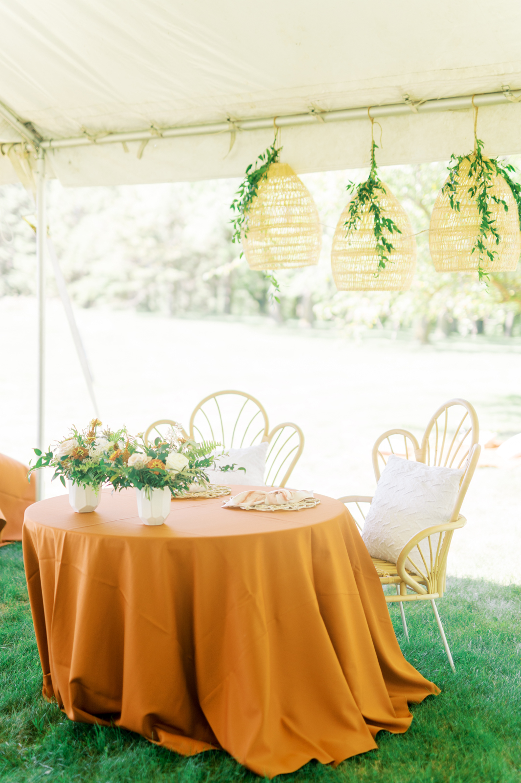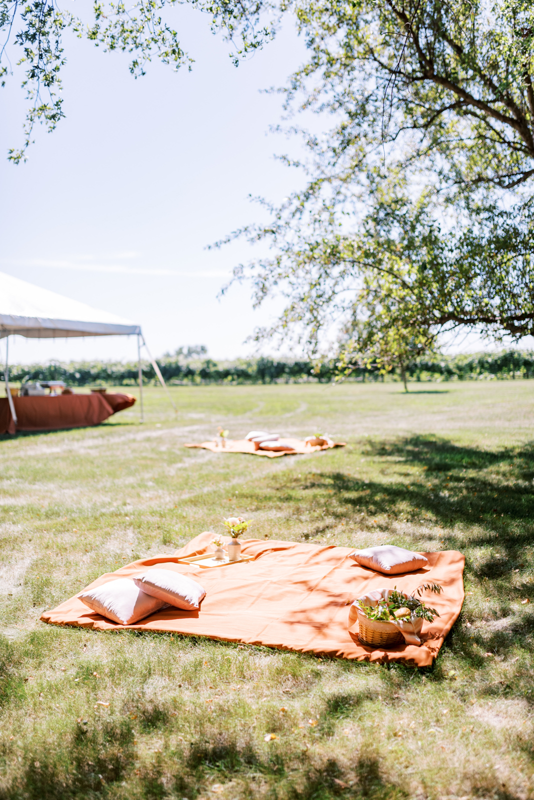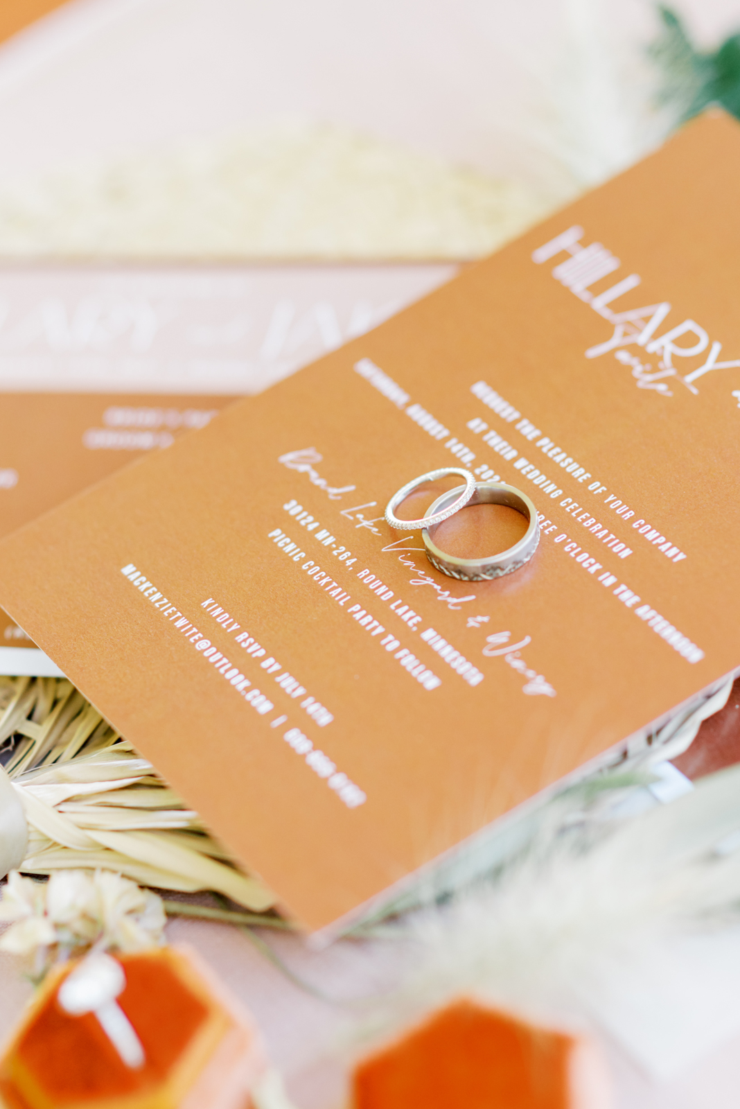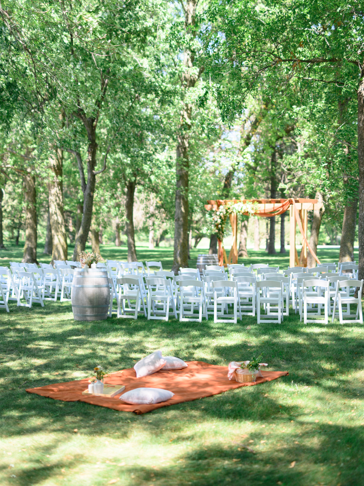 Gorgeous lake views, warm terracotta tones, and boho-chic elegance – what more could you want for a sweet, summery picnic wedding? Hillary and Jake celebrated their love on a sun-soaked August day, surrounded by their closest loved ones, and, boy, was it a bash for the books! Summer from Orange Door Weddings helped these two weave incredibly intentional and memorable details into every detail of their day, like wedding programs perfectly displayed on woven fans for guests to both read and cool themselves during the ceremony, adorable, intimate wine picnic setups spread out throughout the grounds for a little cocktail hour relaxation, rattan chairs and wicker chandeliers for a statement-making sweetheart table, a pretty-in-peach cutting cake from Meringue Bakery & Cafe, and more! Beautifully captured by BearMoose&Fox, dive into all the dreamy inspiration Hillary and Jake’s wedding day brought below.