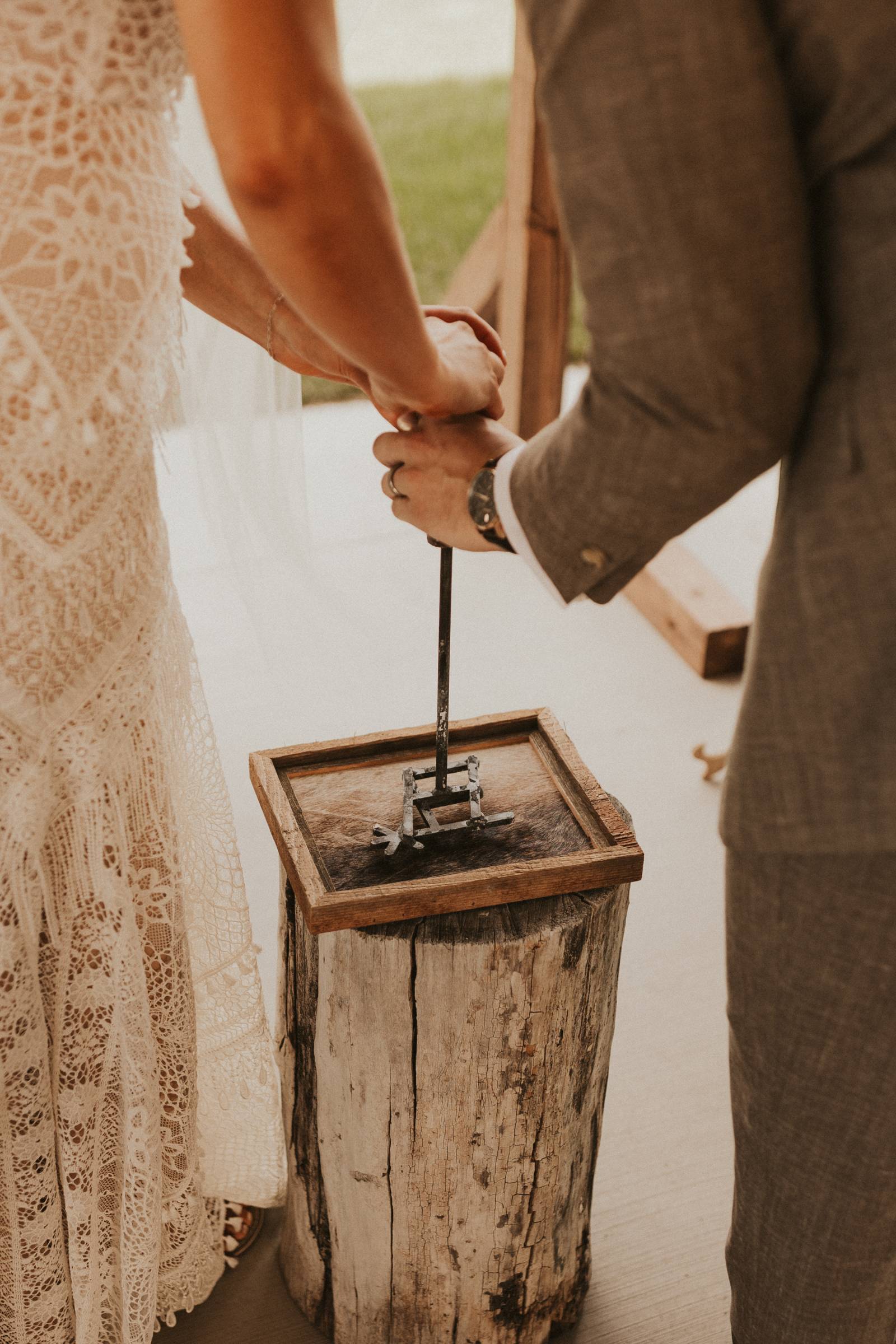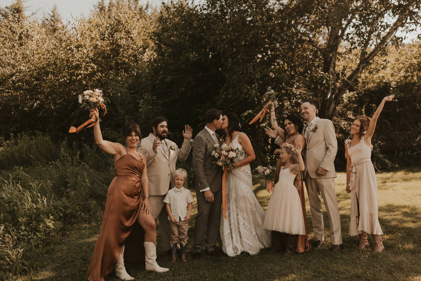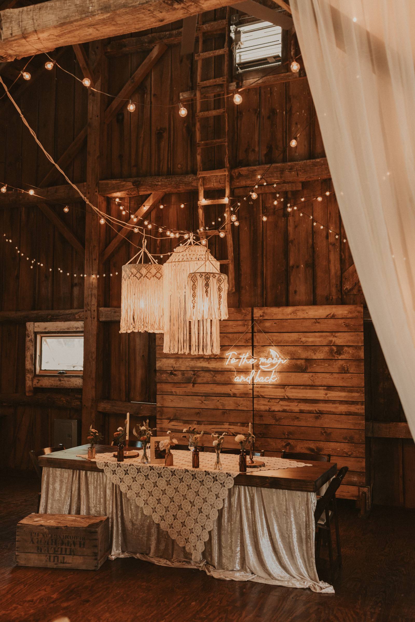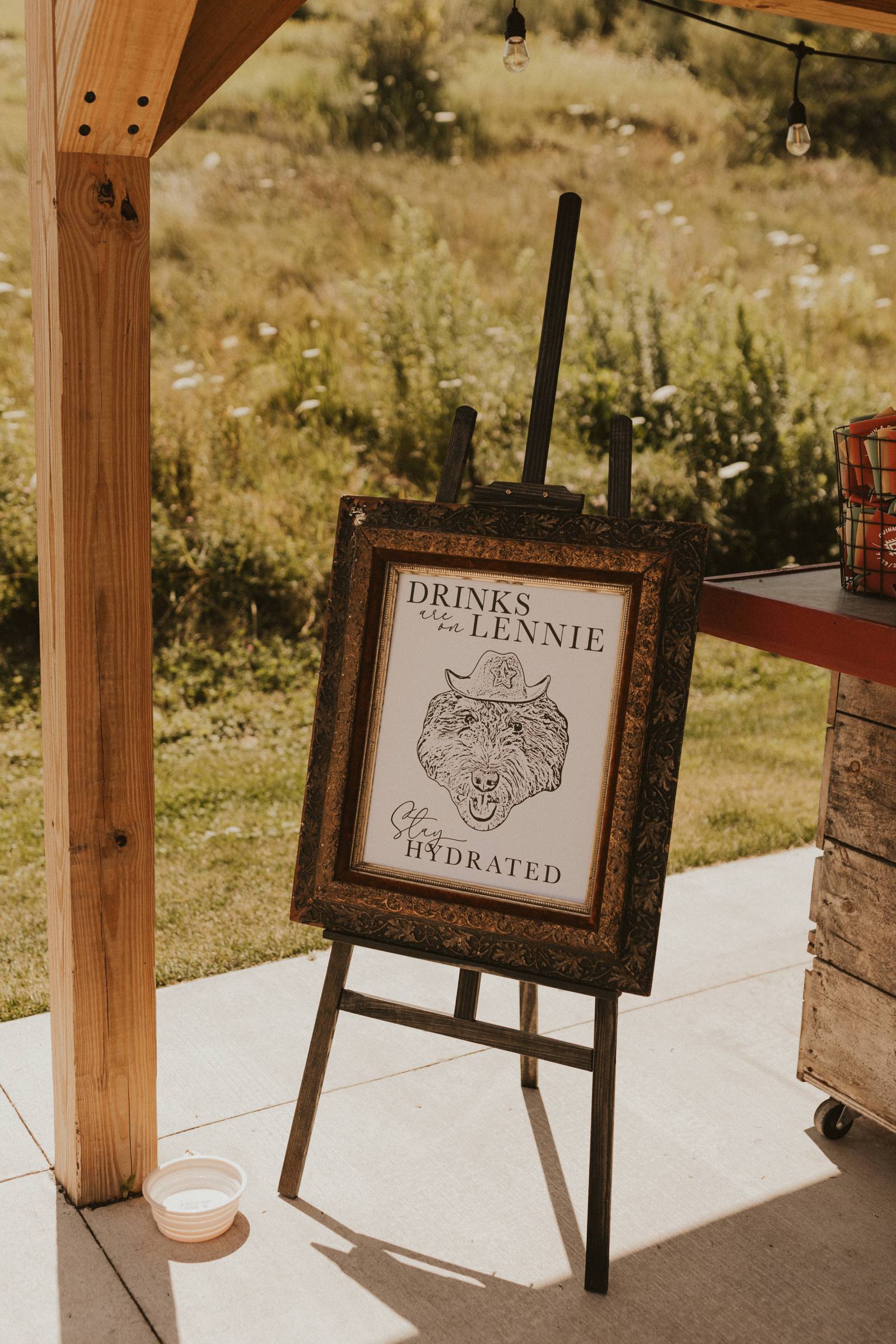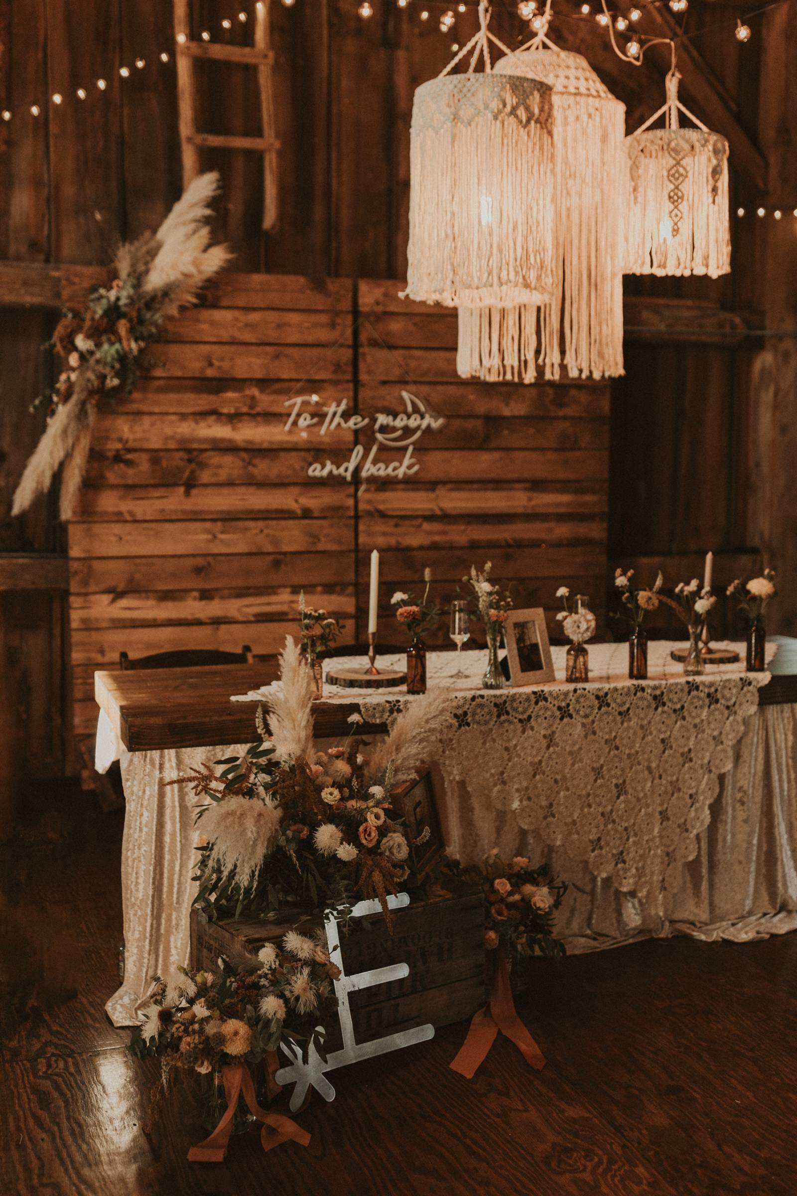 From Elisa’s lacy dress to the macrame pendant lighting and wood accents, their day was a bohemian dream filled with natural textures. Elisa and Quinn embraced a warm, neutral color palette mixed with rich terracotta tones that Pennycress Studio brought even further to life with their stunning statement floral arrangements. Their celebration was brimming with personal touches, from the couple’s beloved dog, Lennie, making his appearance in the fun and in their signage to custom koozie favors, cow cupcakes, and a unique wood branding ceremony that beautifully symbolized their unity. Linda’s Bakery crafted a delectable semi-naked cake adorned with flowers that complemented the day’s earthy aesthetic. To top the night off? Late-night pizza and a fire–the perfect ending to a summer celebration.