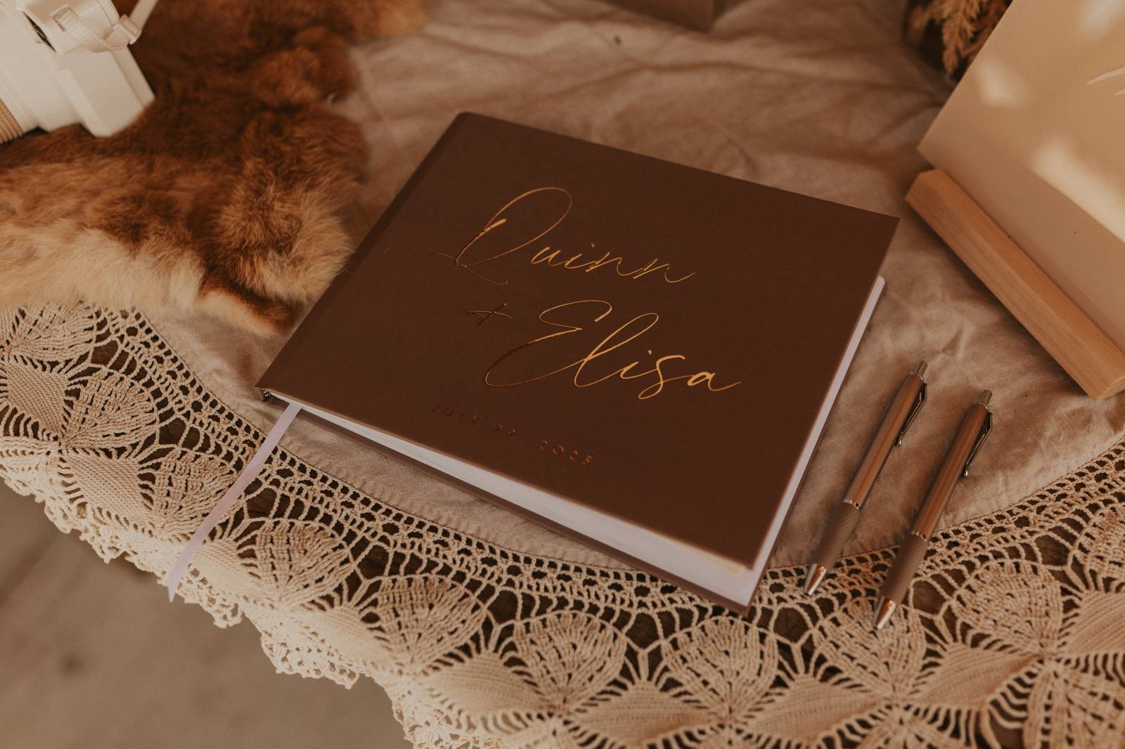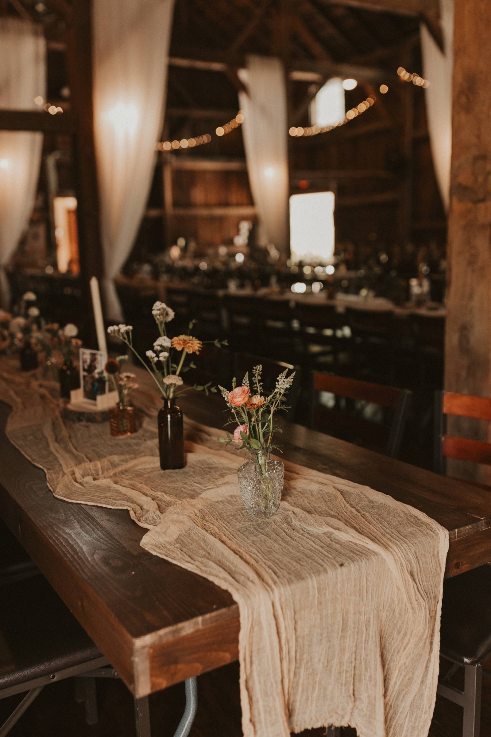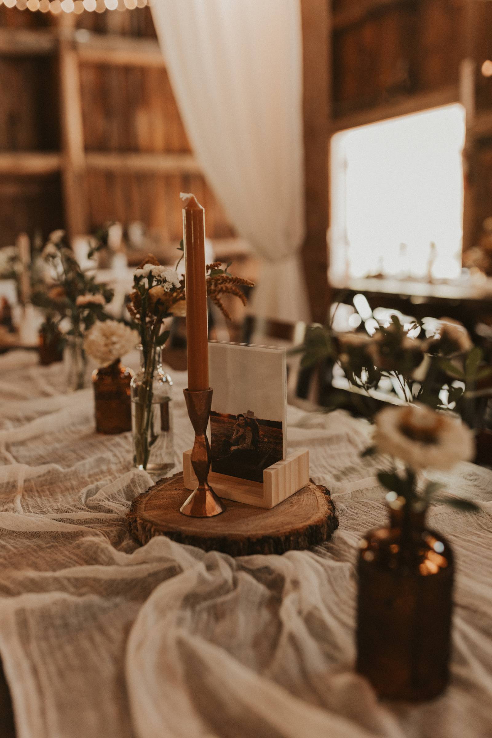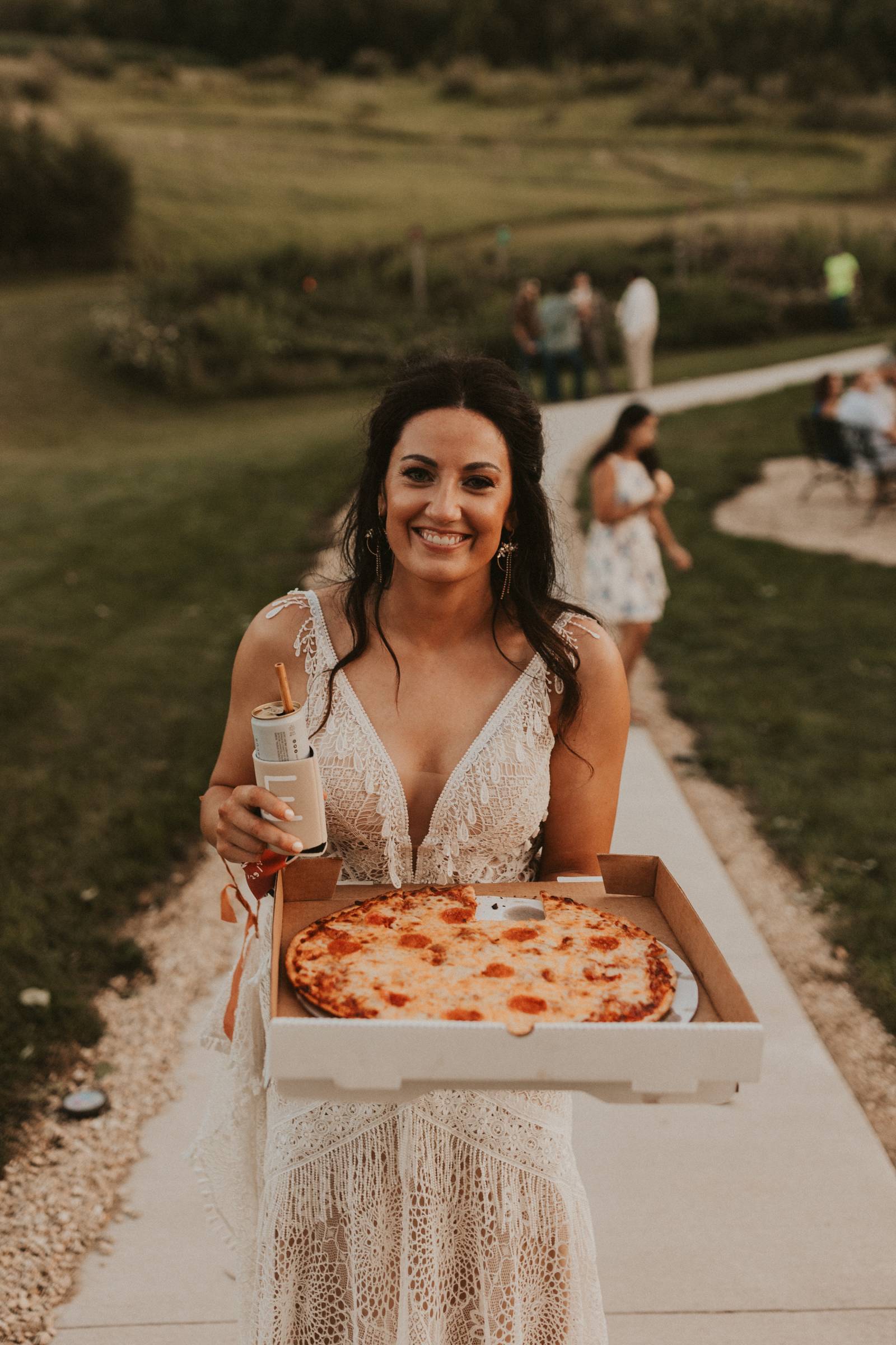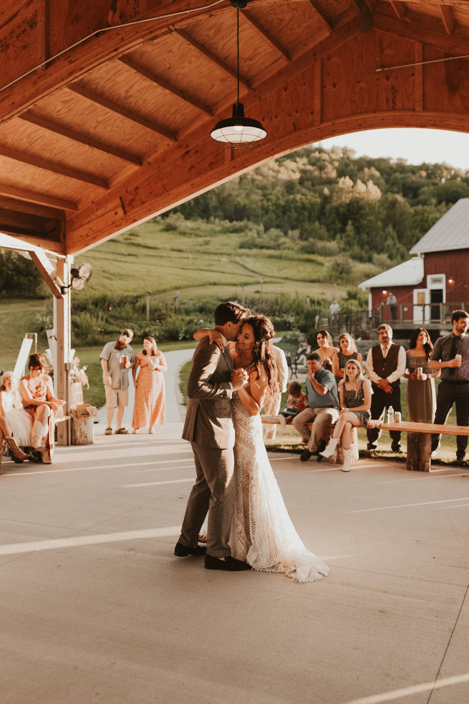 From Elisa’s lacy dress to the macrame pendant lighting and wood accents, their day was a bohemian dream filled with natural textures. Elisa and Quinn embraced a warm, neutral color palette mixed with rich terracotta tones that Pennycress Studio brought even further to life with their stunning statement floral arrangements. Their celebration was brimming with personal touches, from the couple’s beloved dog, Lennie, making his appearance in the fun and in their signage to custom koozie favors, cow cupcakes, and a unique wood branding ceremony that beautifully symbolized their unity. Linda’s Bakery crafted a delectable semi-naked cake adorned with flowers that complemented the day’s earthy aesthetic. To top the night off? Late-night pizza and a fire–the perfect ending to a summer celebration.