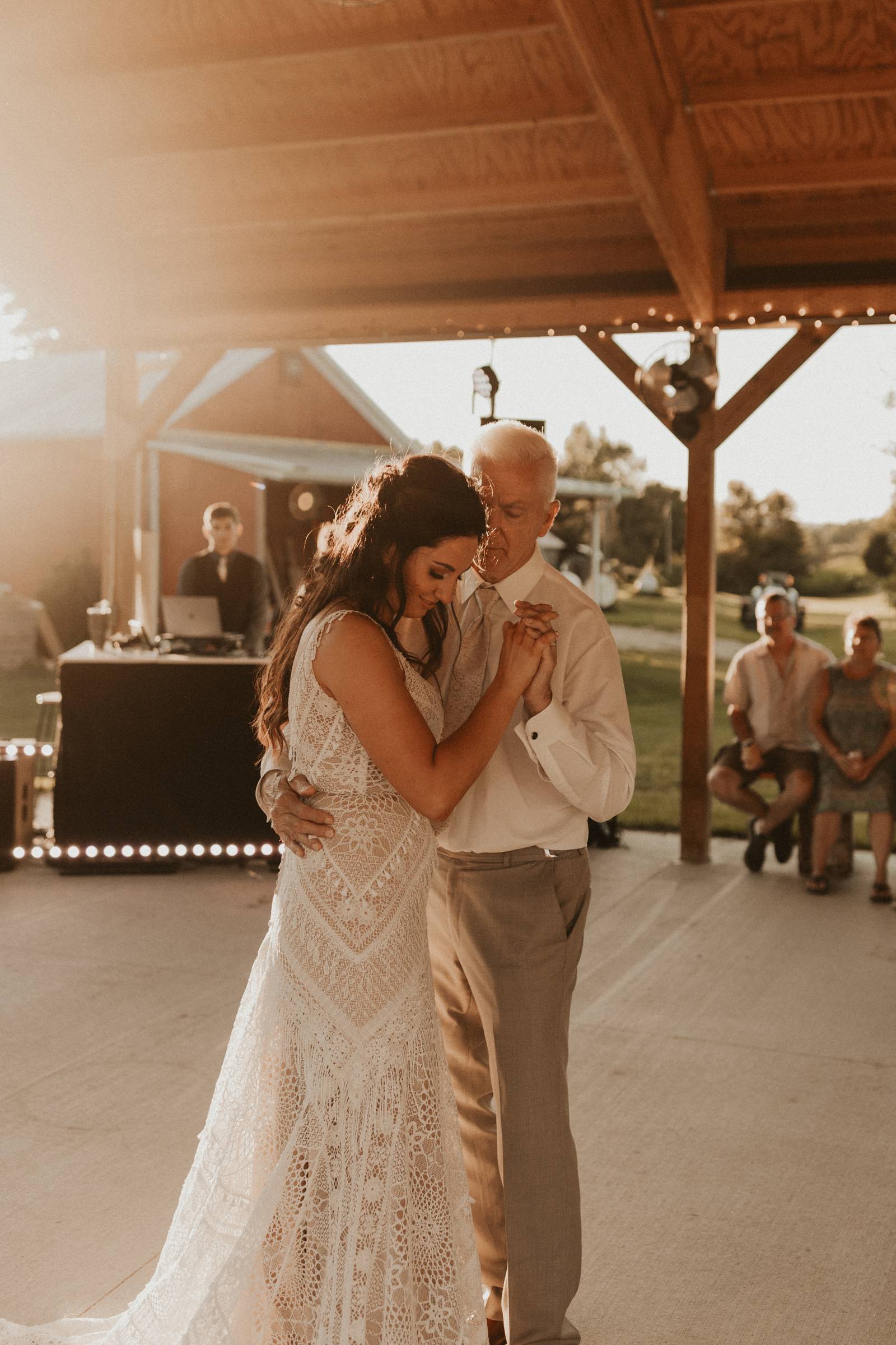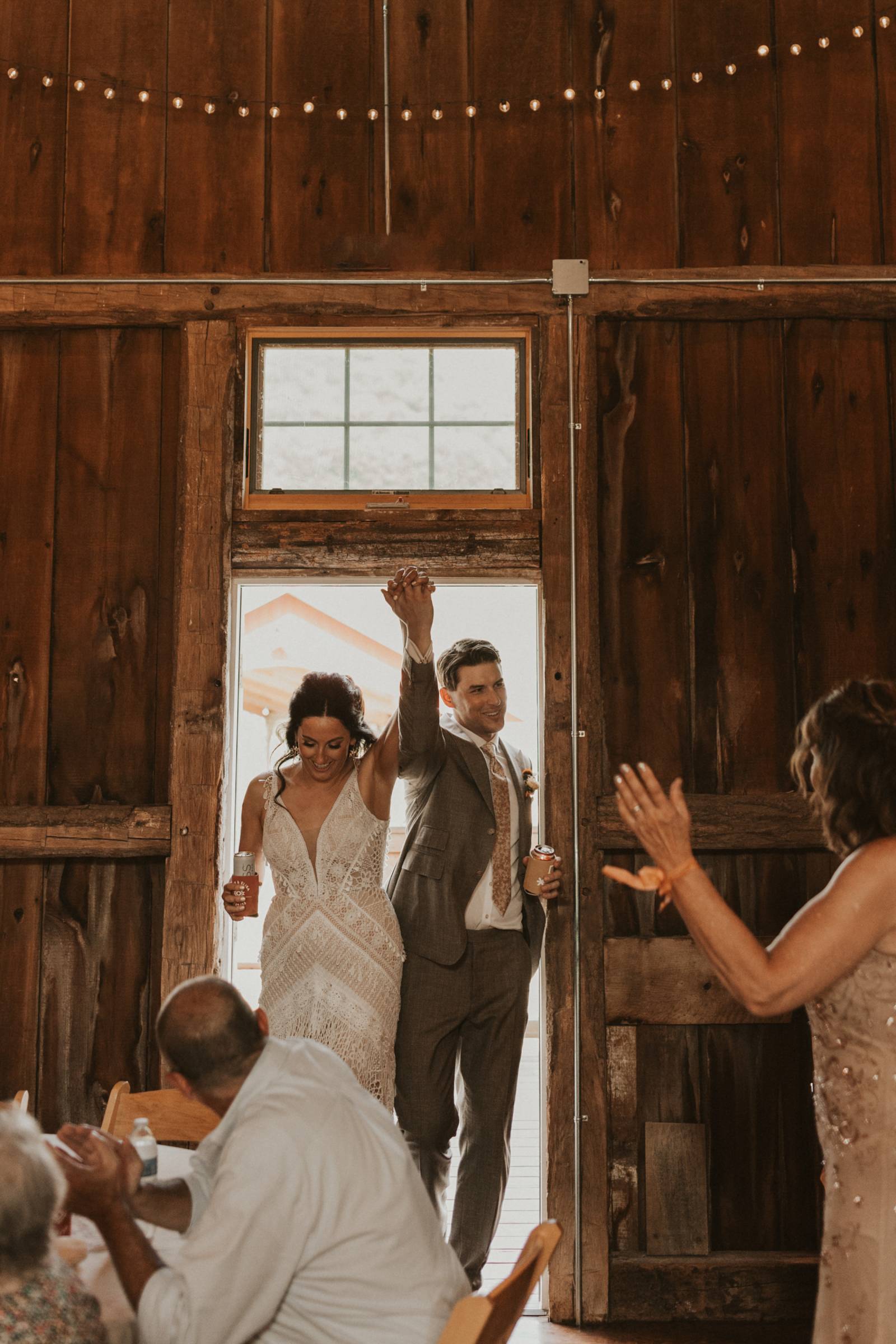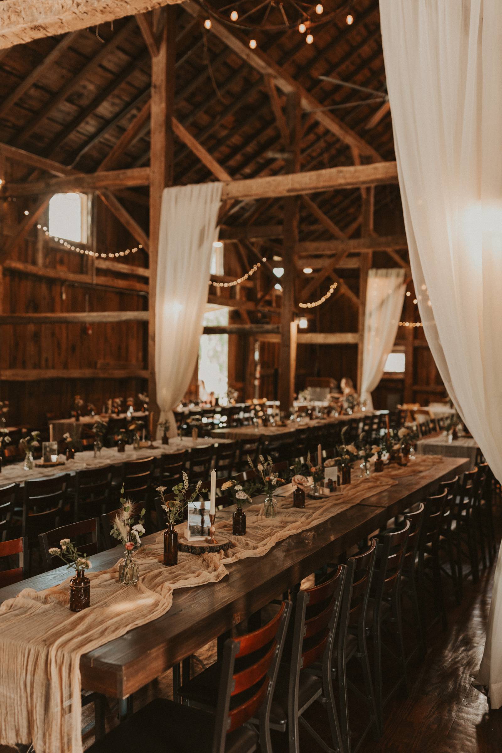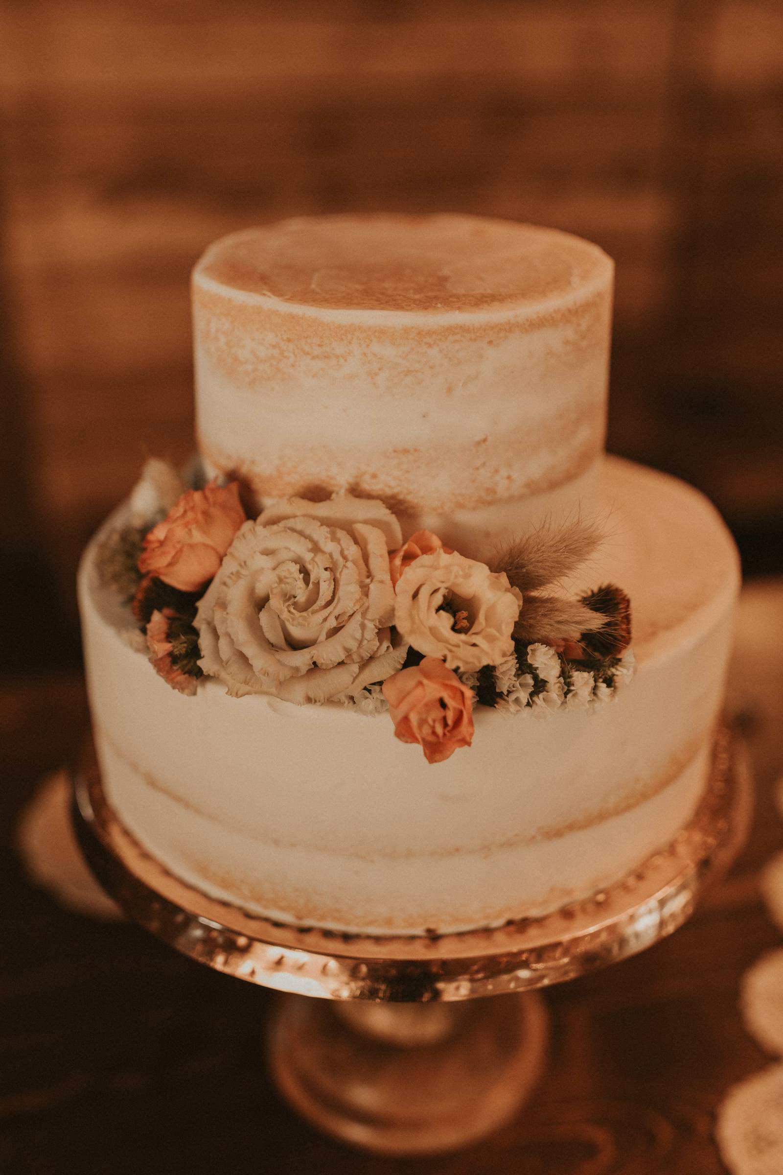 From Elisa’s lacy dress to the macrame pendant lighting and wood accents, their day was a bohemian dream filled with natural textures. Elisa and Quinn embraced a warm, neutral color palette mixed with rich terracotta tones that Pennycress Studio brought even further to life with their stunning statement floral arrangements. Their celebration was brimming with personal touches, from the couple’s beloved dog, Lennie, making his appearance in the fun and in their signage to custom koozie favors, cow cupcakes, and a unique wood branding ceremony that beautifully symbolized their unity. Linda’s Bakery crafted a delectable semi-naked cake adorned with flowers that complemented the day’s earthy aesthetic. To top the night off? Late-night pizza and a fire–the perfect ending to a summer celebration.