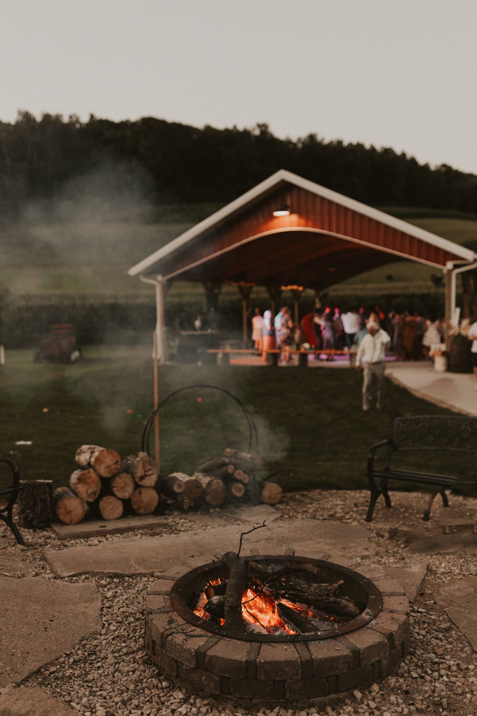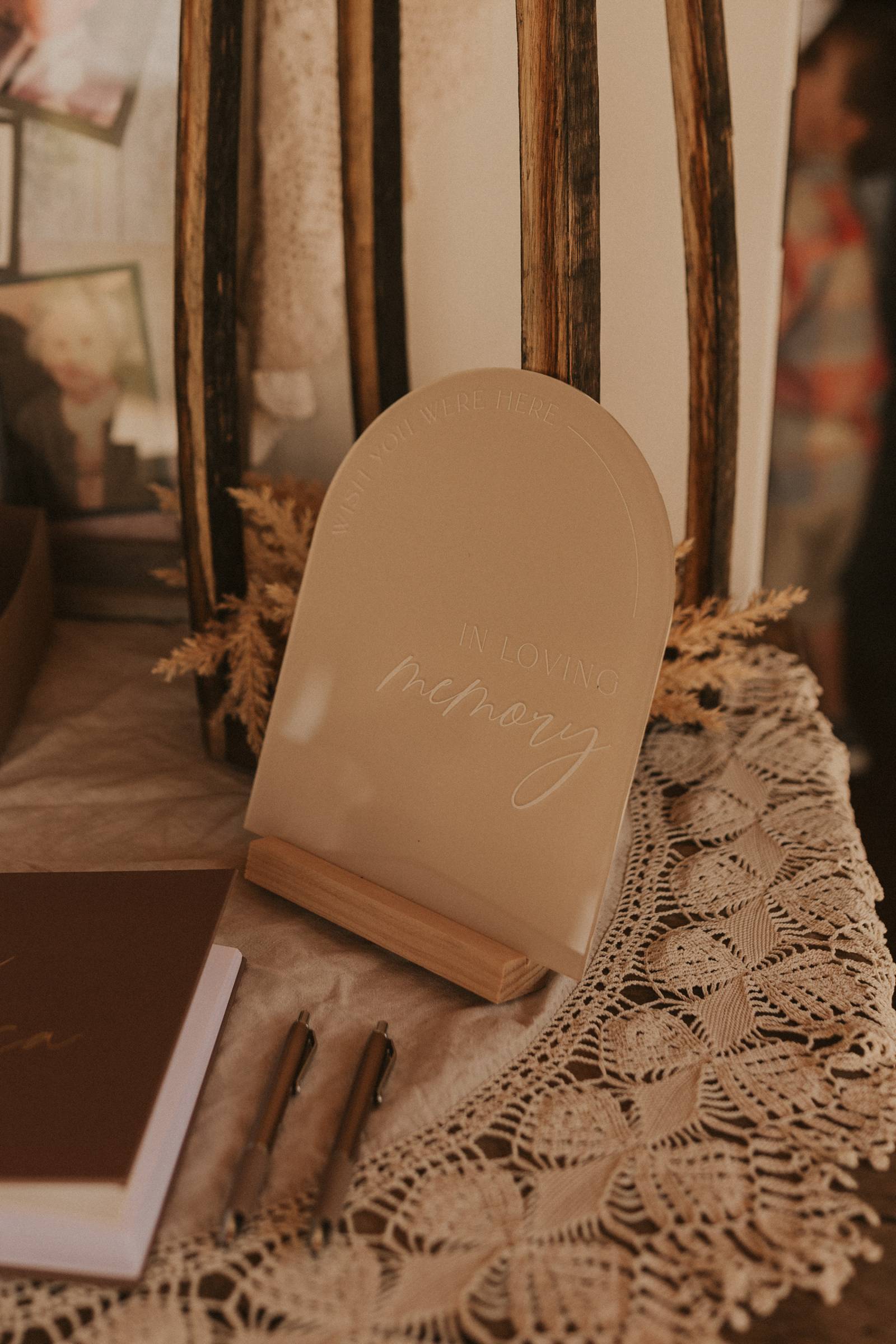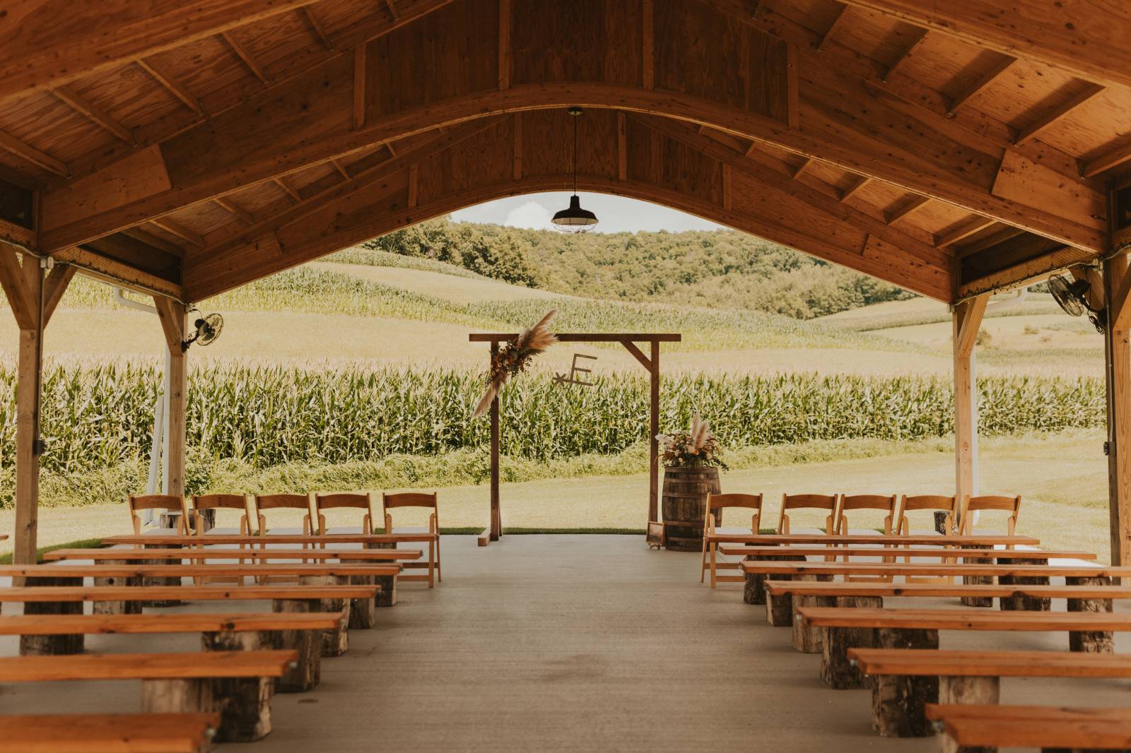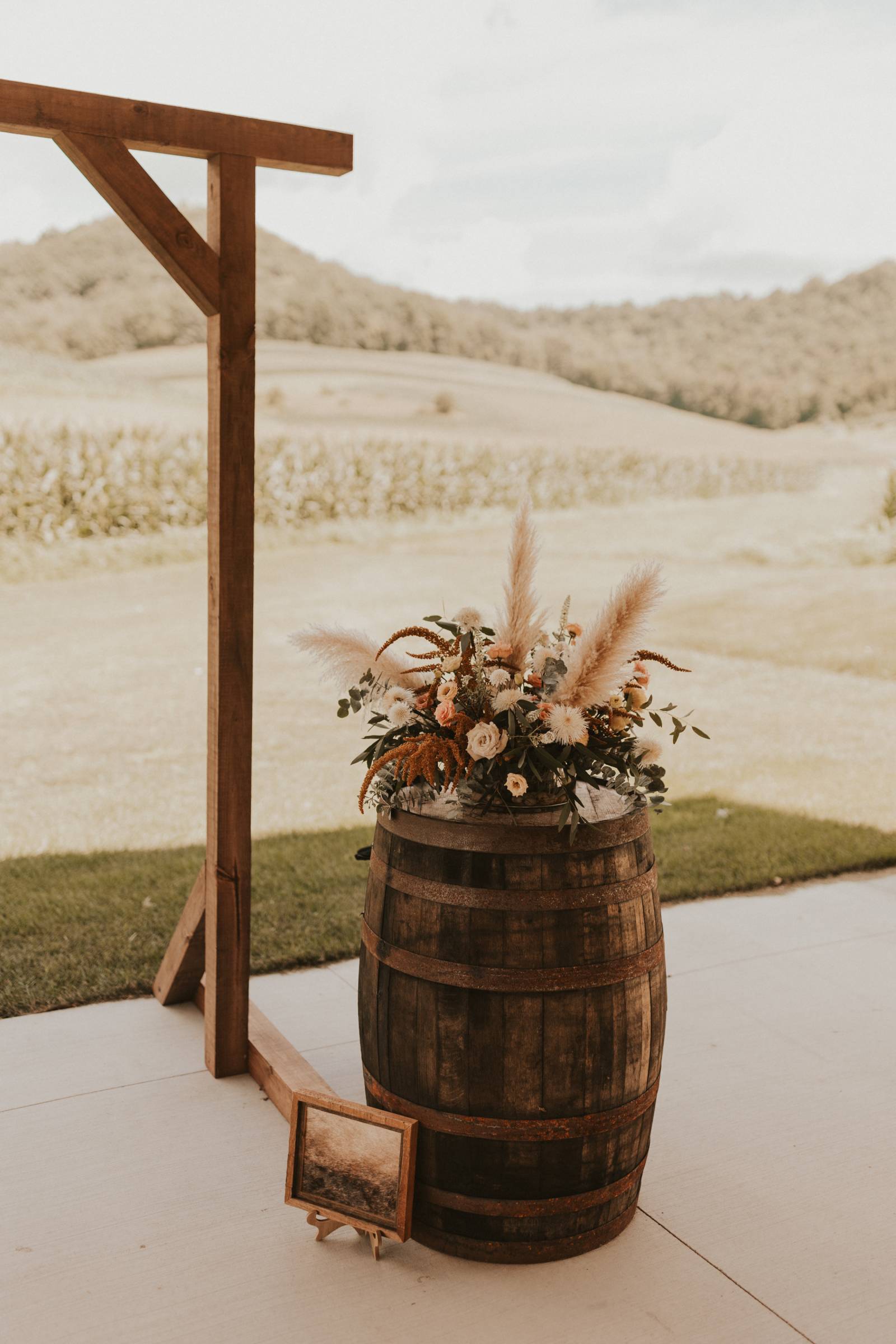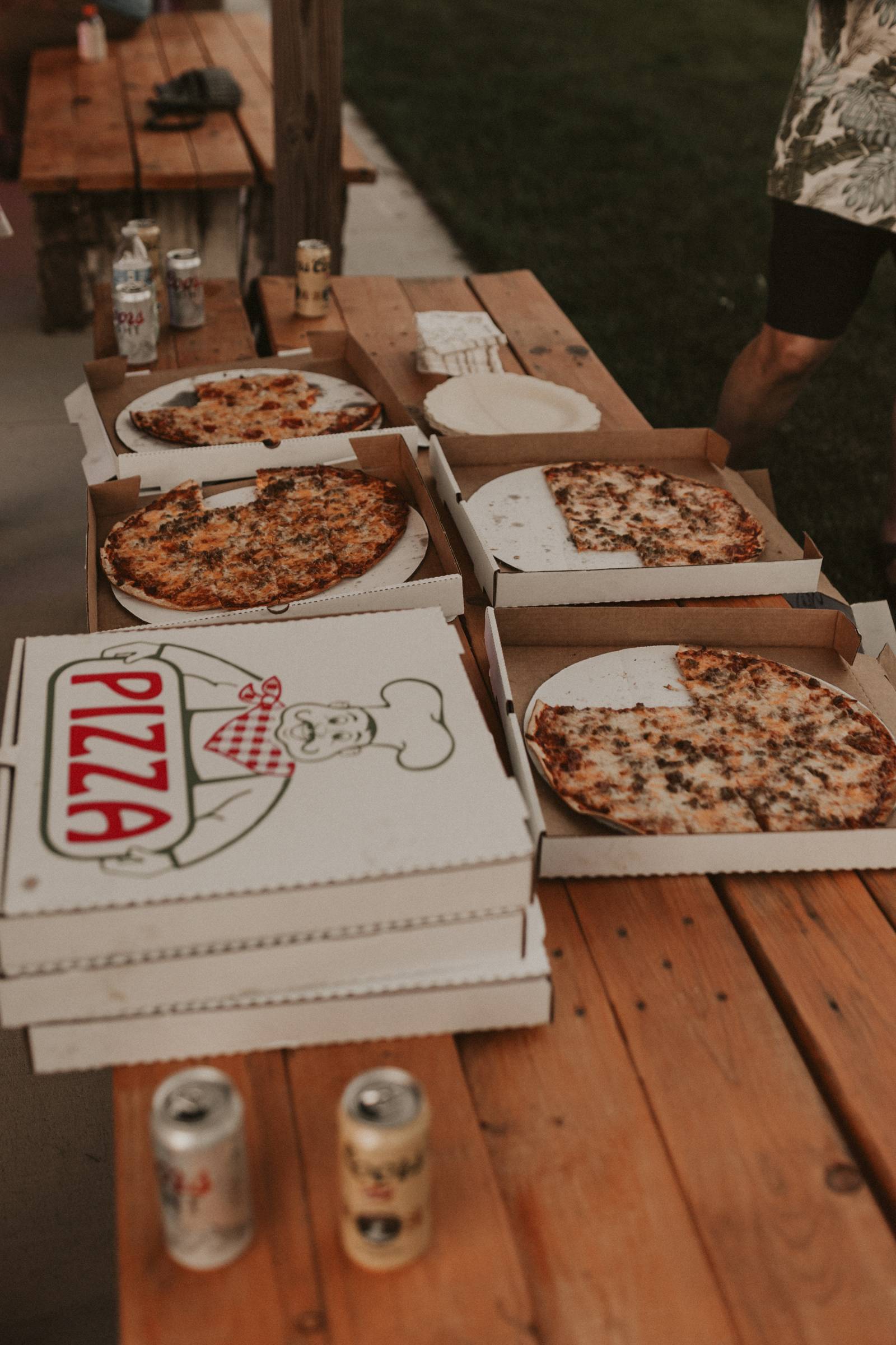 From Elisa’s lacy dress to the macrame pendant lighting and wood accents, their day was a bohemian dream filled with natural textures. Elisa and Quinn embraced a warm, neutral color palette mixed with rich terracotta tones that Pennycress Studio brought even further to life with their stunning statement floral arrangements. Their celebration was brimming with personal touches, from the couple’s beloved dog, Lennie, making his appearance in the fun and in their signage to custom koozie favors, cow cupcakes, and a unique wood branding ceremony that beautifully symbolized their unity. Linda’s Bakery crafted a delectable semi-naked cake adorned with flowers that complemented the day’s earthy aesthetic. To top the night off? Late-night pizza and a fire–the perfect ending to a summer celebration.