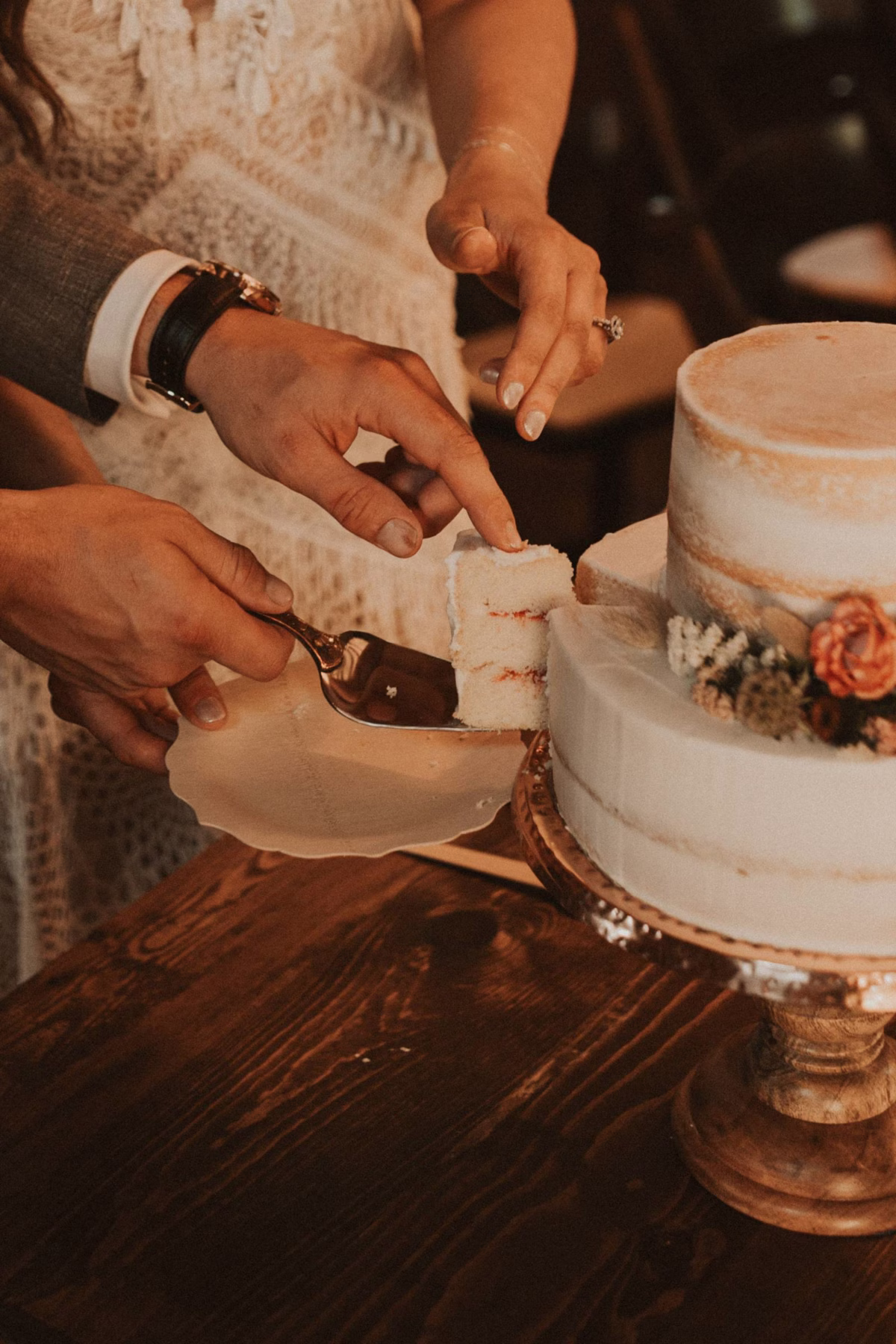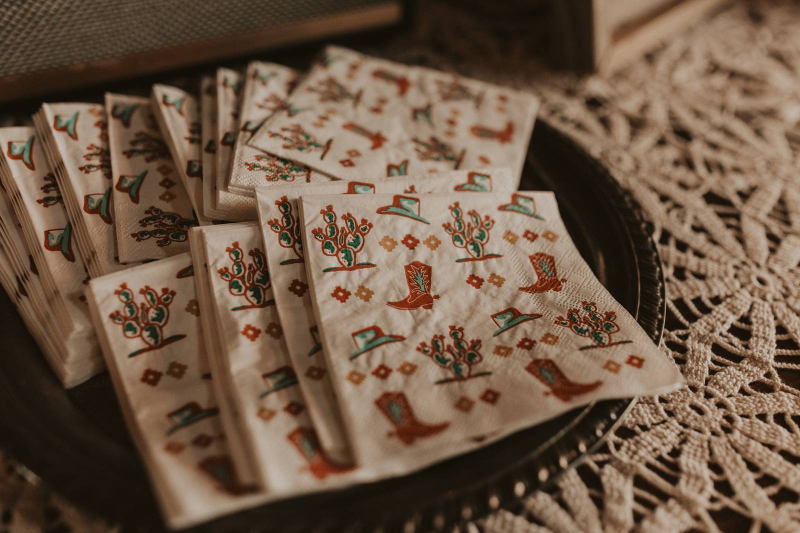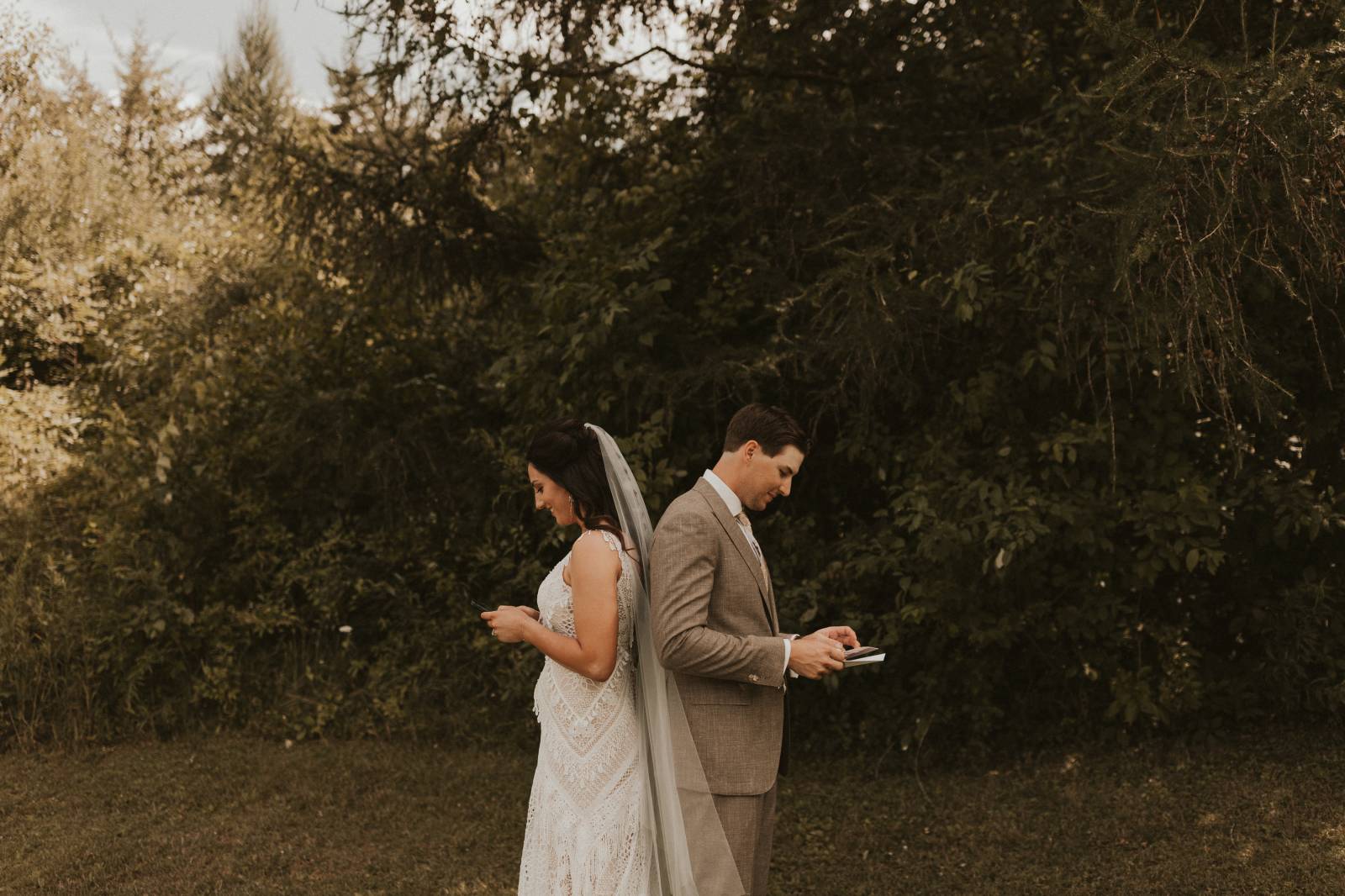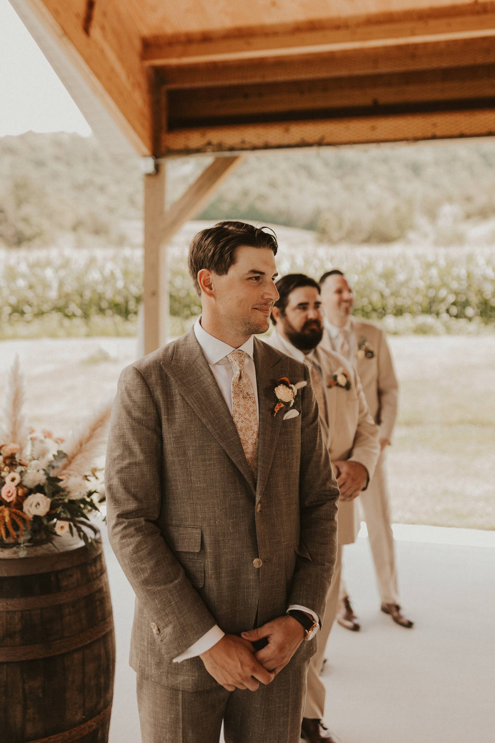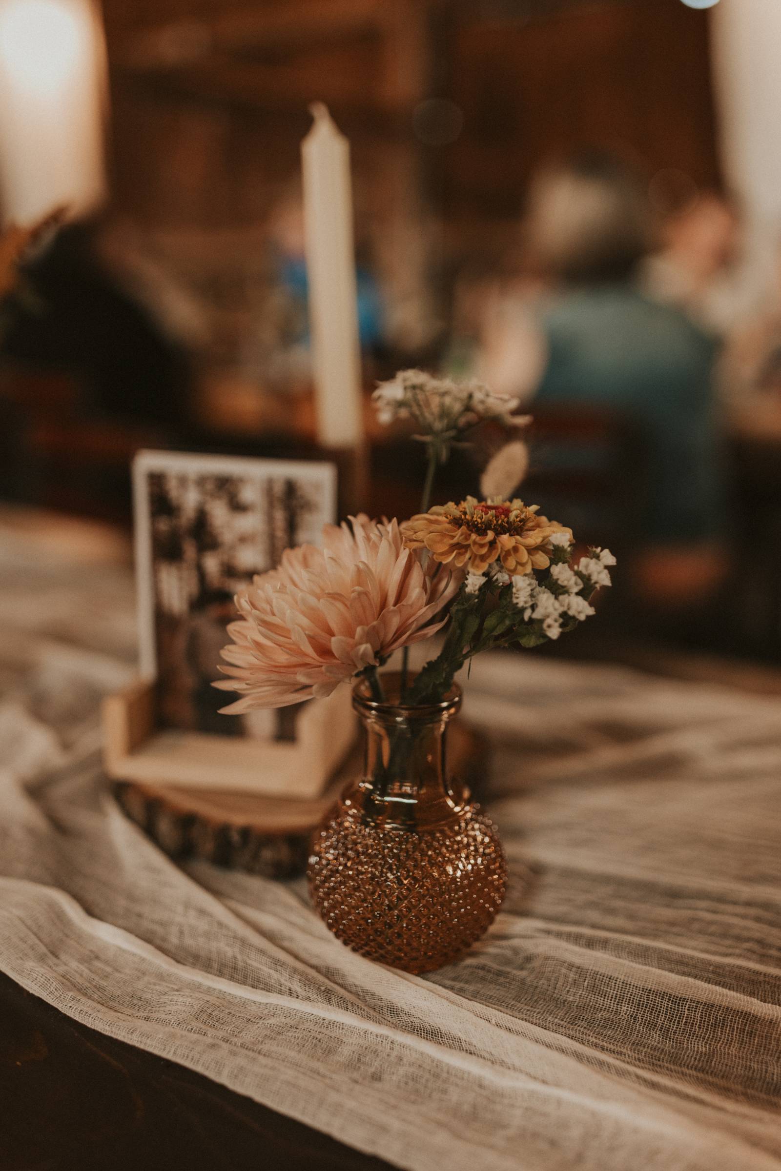 From Elisa’s lacy dress to the macrame pendant lighting and wood accents, their day was a bohemian dream filled with natural textures. Elisa and Quinn embraced a warm, neutral color palette mixed with rich terracotta tones that Pennycress Studio brought even further to life with their stunning statement floral arrangements. Their celebration was brimming with personal touches, from the couple’s beloved dog, Lennie, making his appearance in the fun and in their signage to custom koozie favors, cow cupcakes, and a unique wood branding ceremony that beautifully symbolized their unity. Linda’s Bakery crafted a delectable semi-naked cake adorned with flowers that complemented the day’s earthy aesthetic. To top the night off? Late-night pizza and a fire–the perfect ending to a summer celebration.